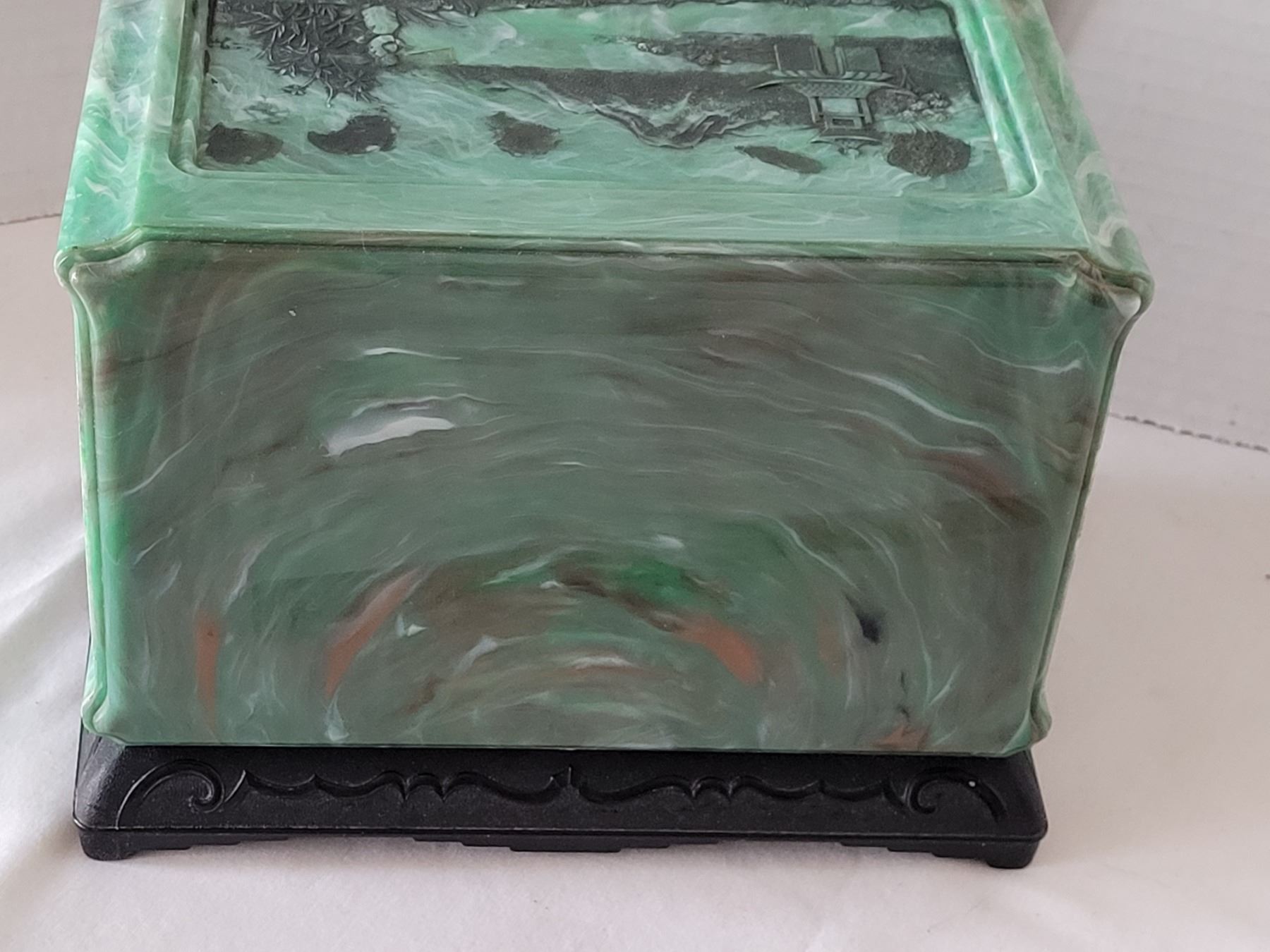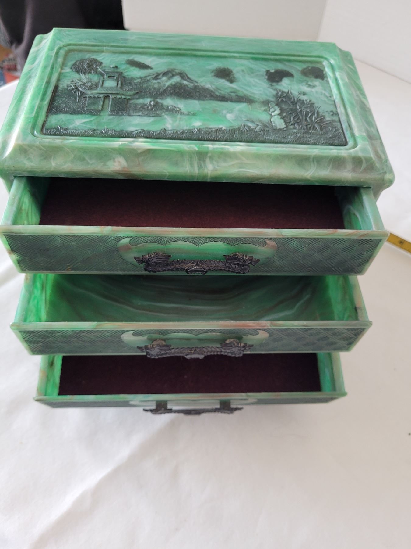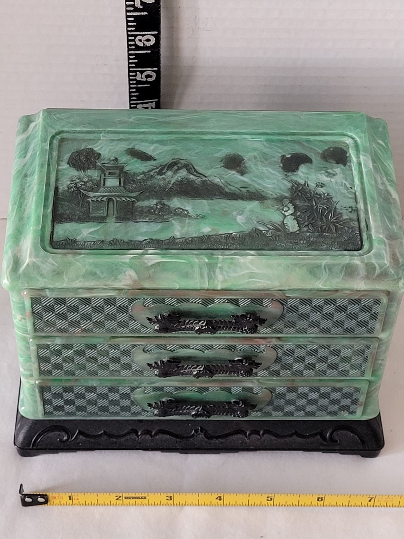 Vintage bakelite Jade green marbled 3 drawer Jewelry box with black Dragon pulls. Asian carved pagoda & landscape scenes on top & sides.