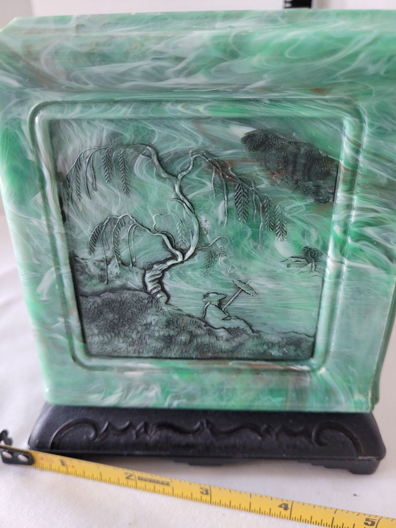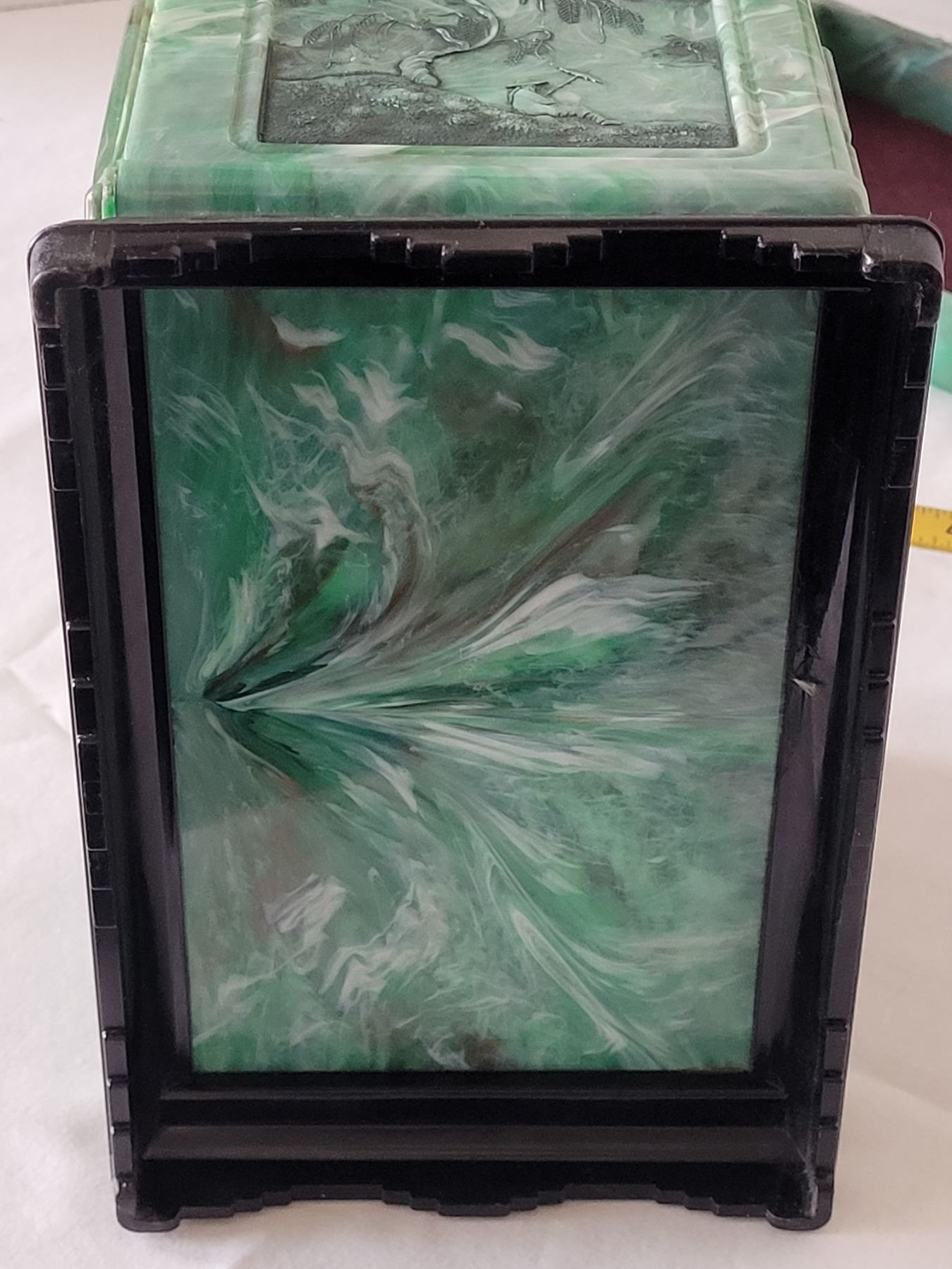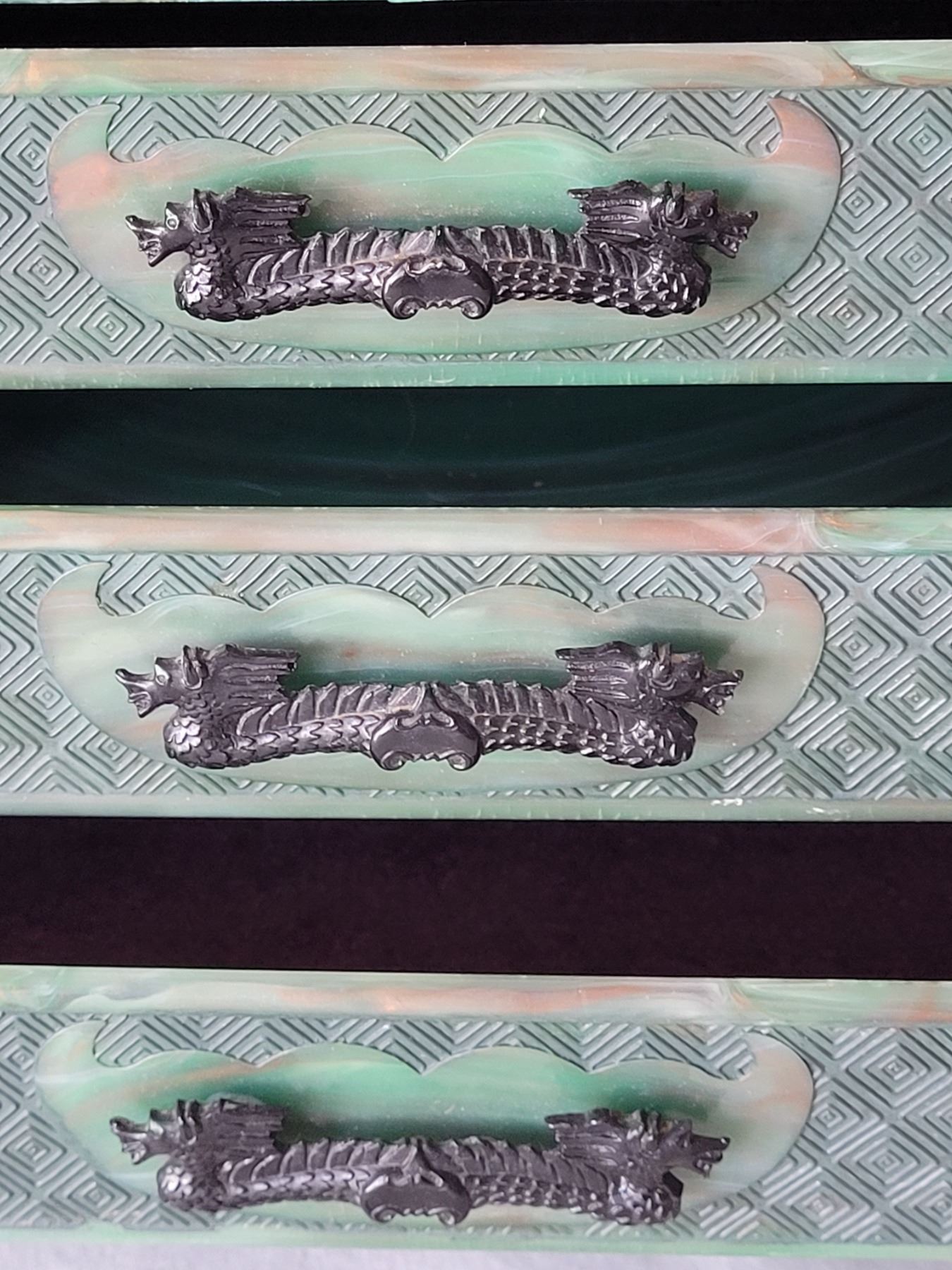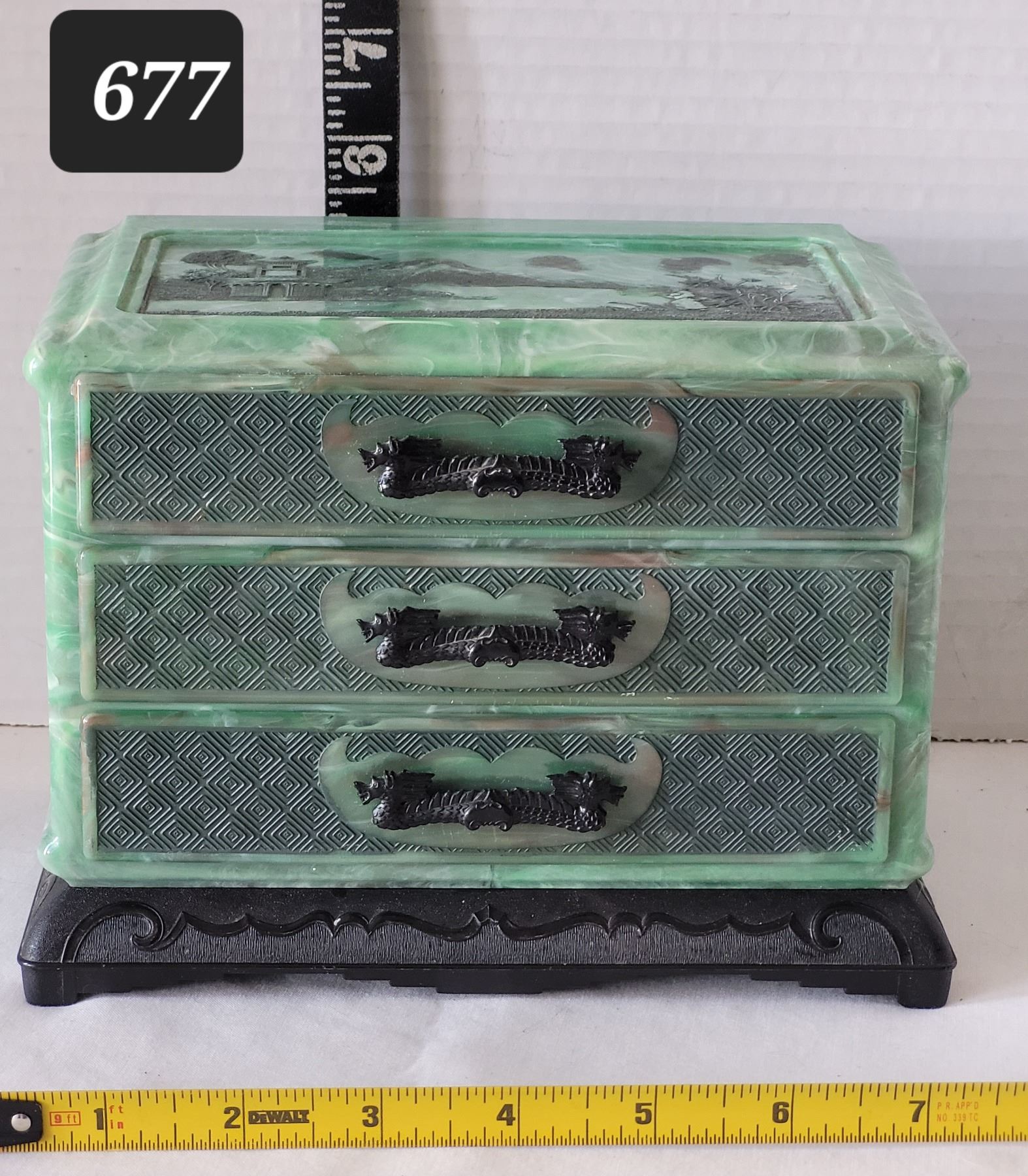 Vintage bakelite Jade green marbled 3 drawer Jewelry box with black Dragon pulls. Asian carved pagoda & landscape scenes on top & sides.