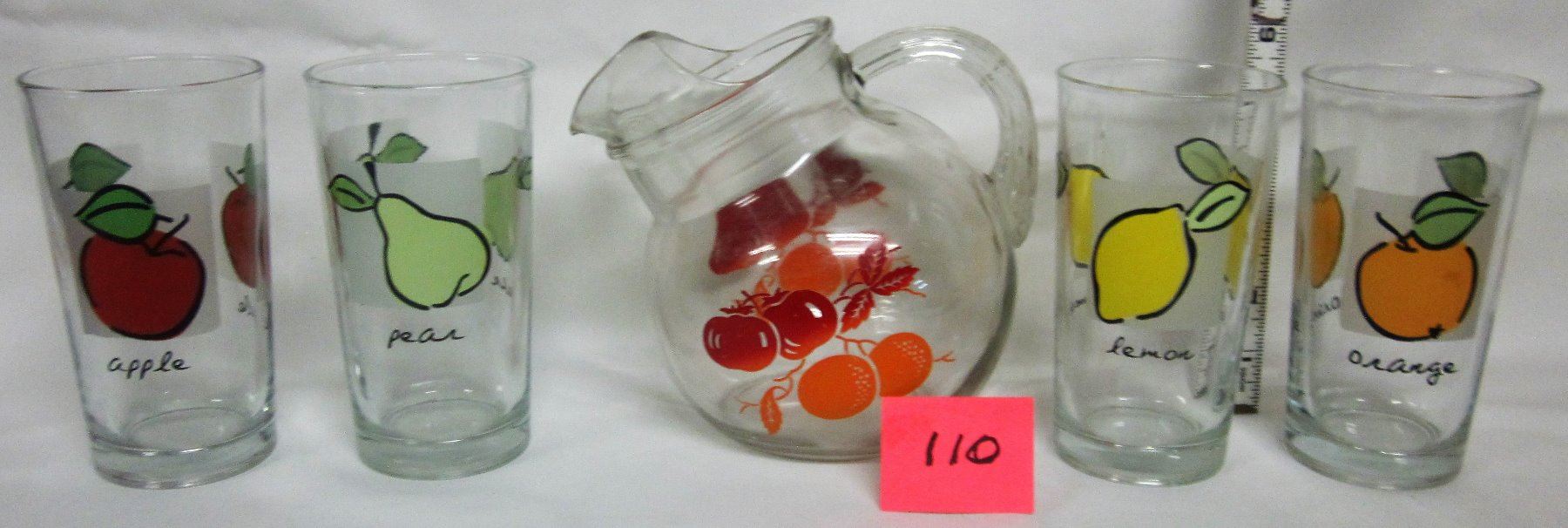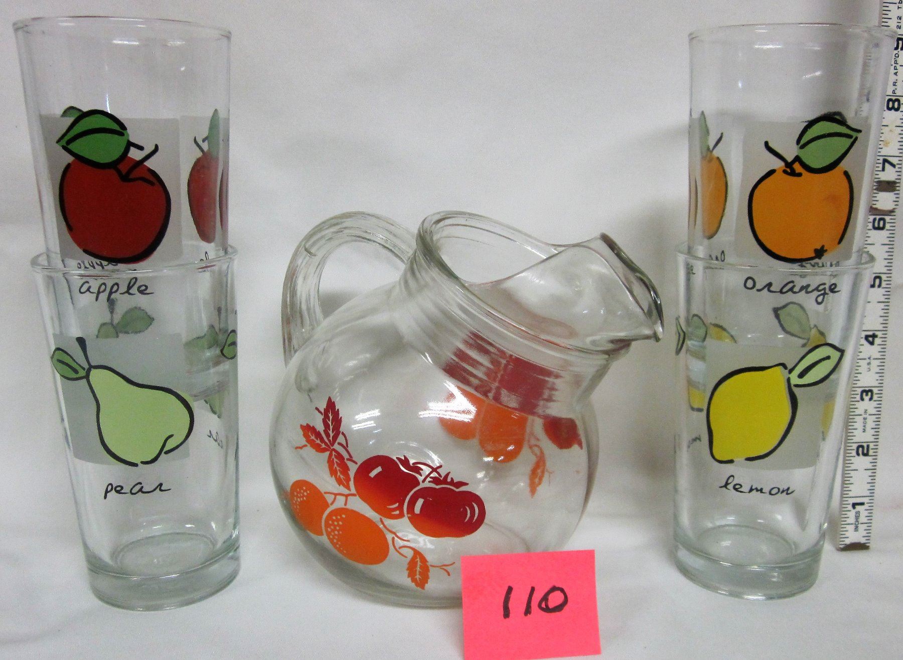 Vintage ball jug/pitcher - 4 matching glasses apple-orange-pear-lemon
