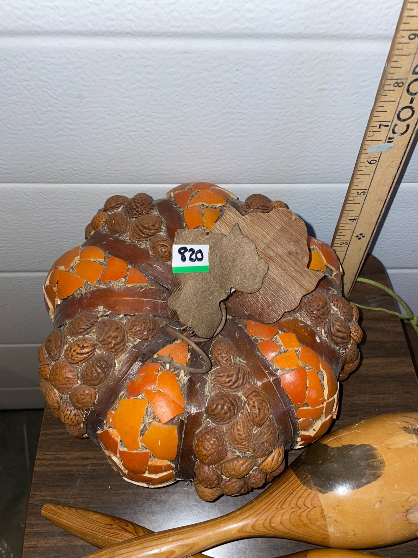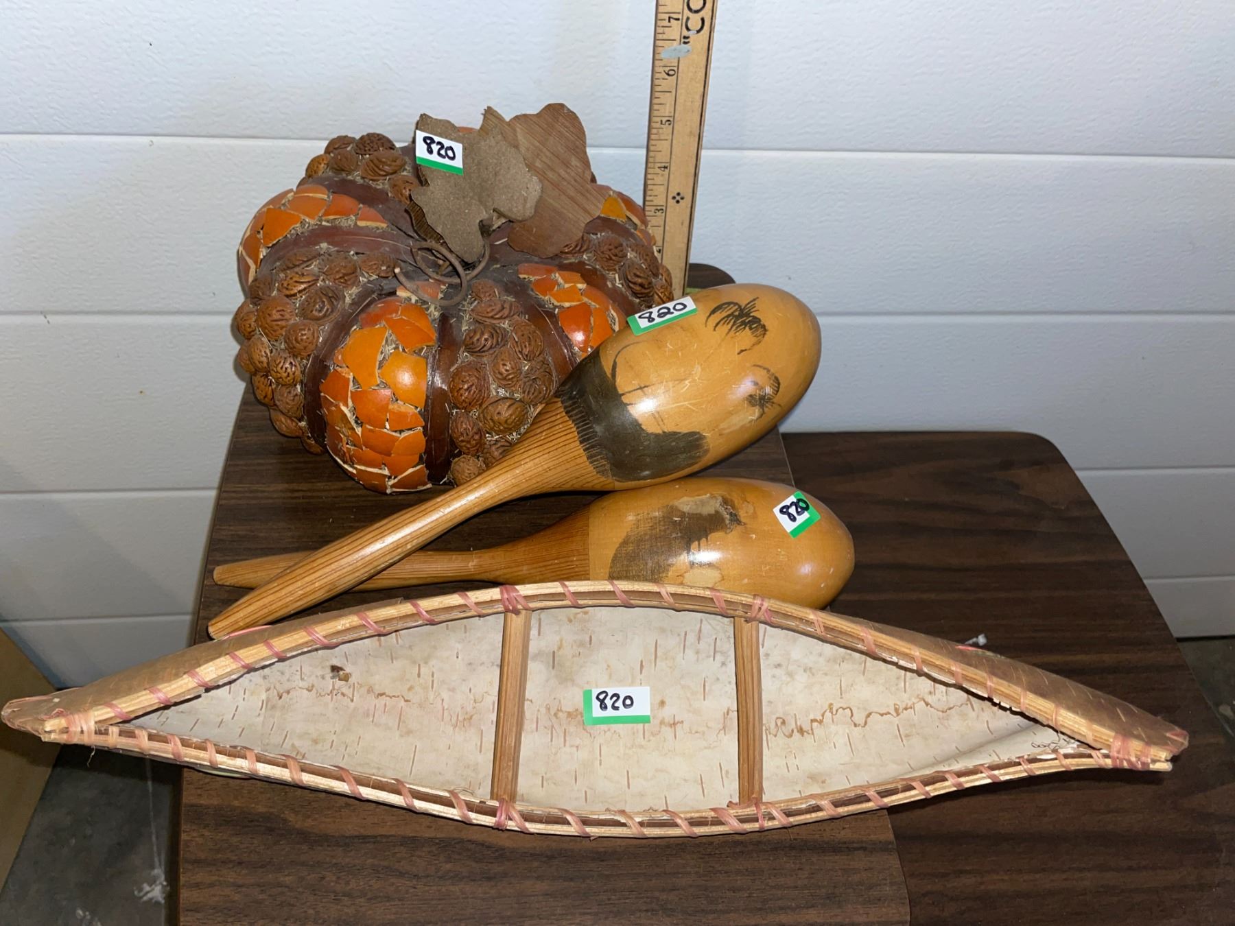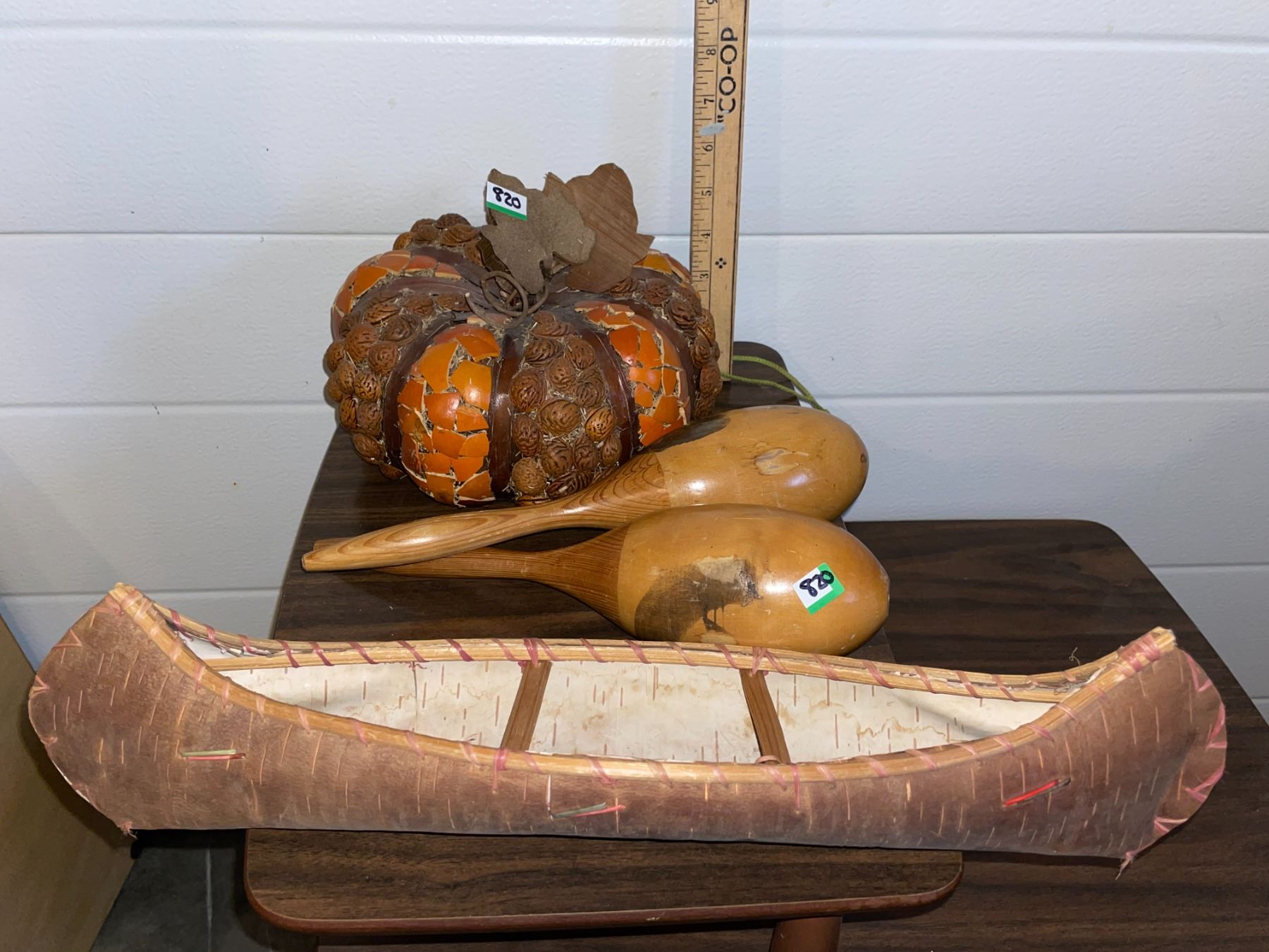 Vintage birch bark canoe décor, maracas, and pumpkin