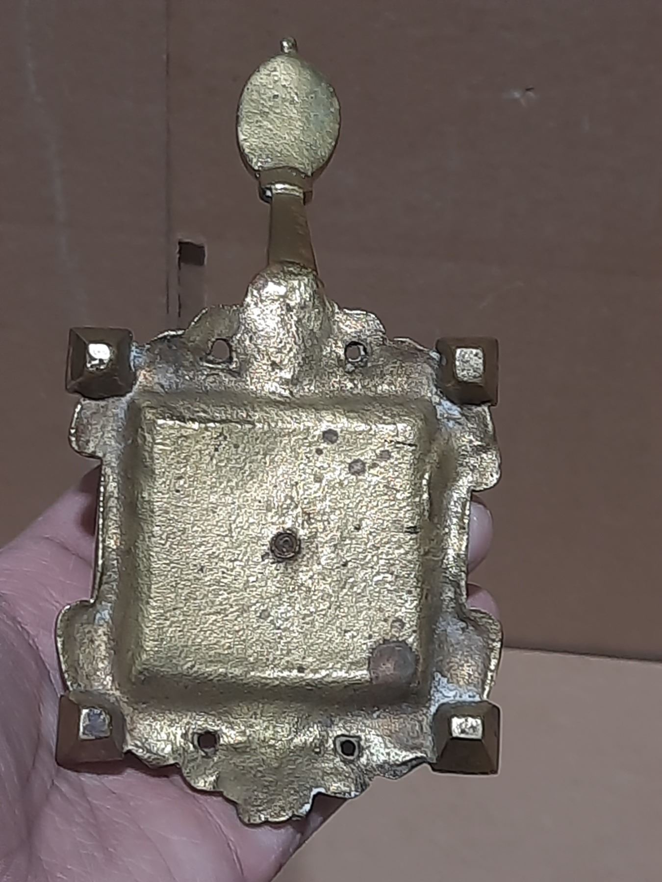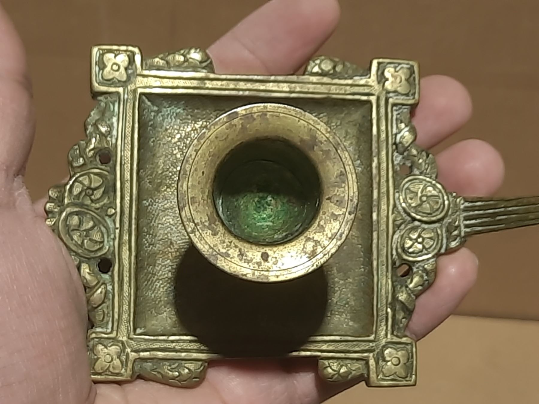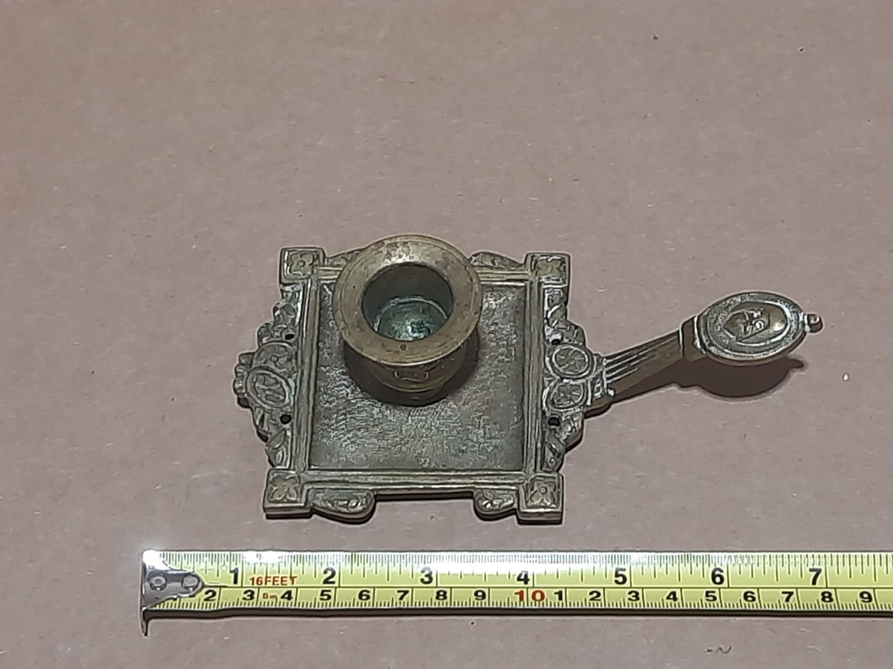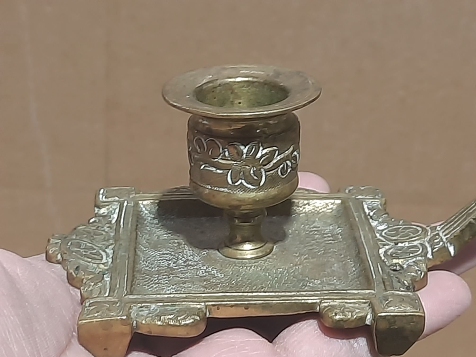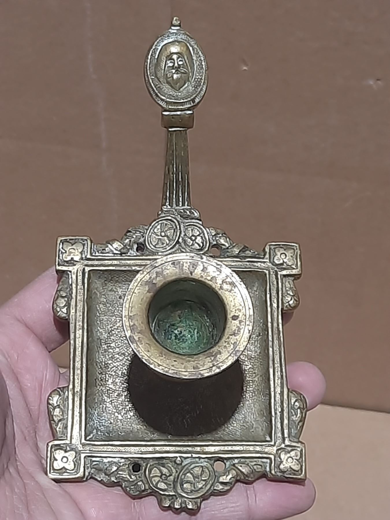 Vintage brass candlestick features a distinct square base with intricate detailing and an oval medallion featuring a human face at the top.