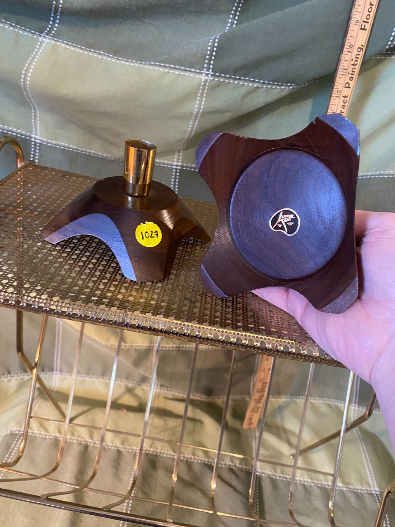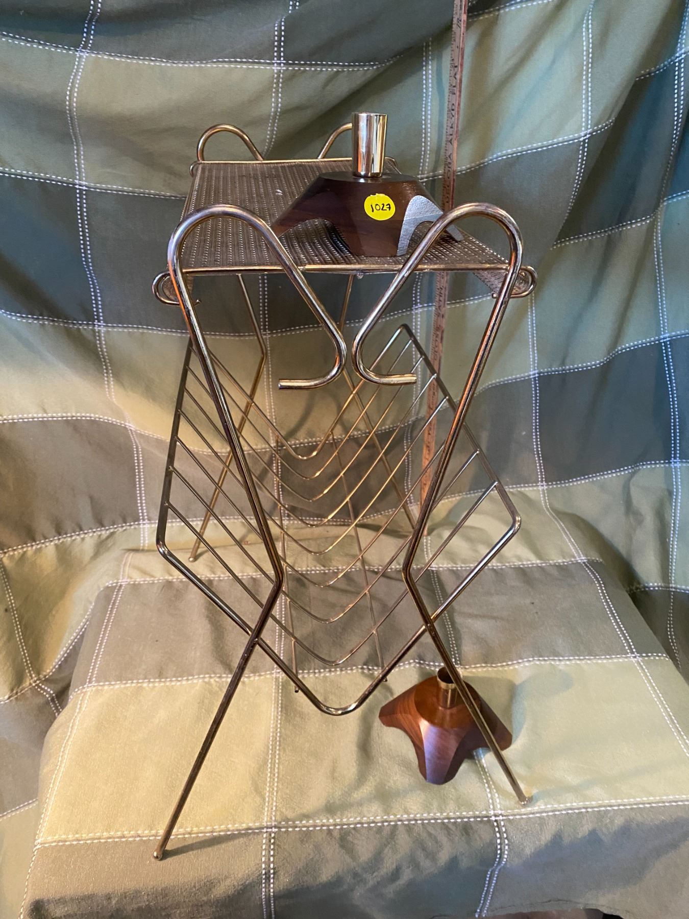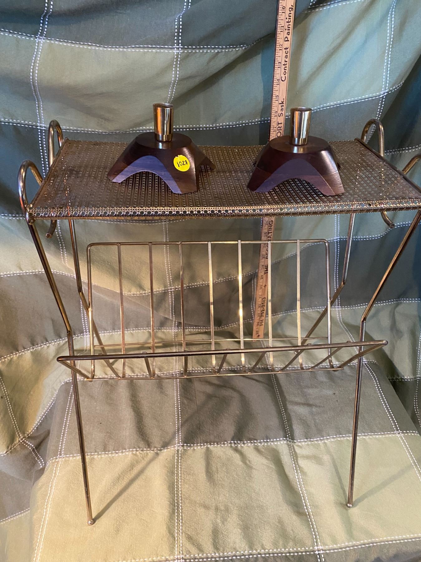 Vintage brass coloured magazine rack, and a pair of vintage, Kustom Kraft, candle stick holders.