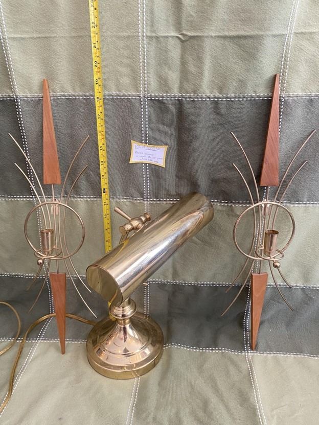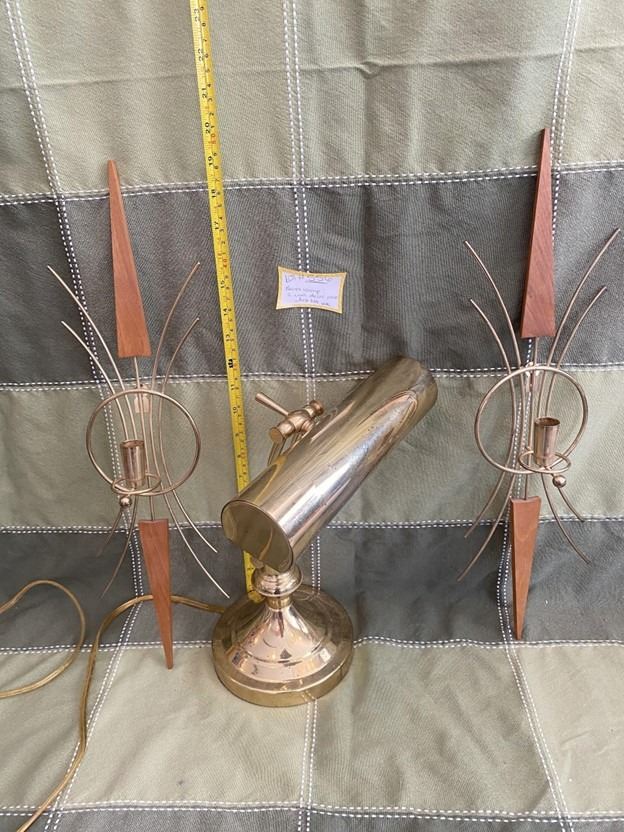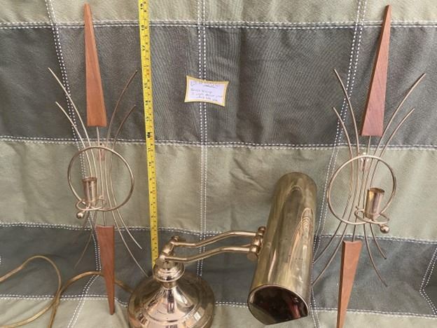 Vintage brass lamp, functions well, 2 MCM wooden teak and brass, wall candle holders.