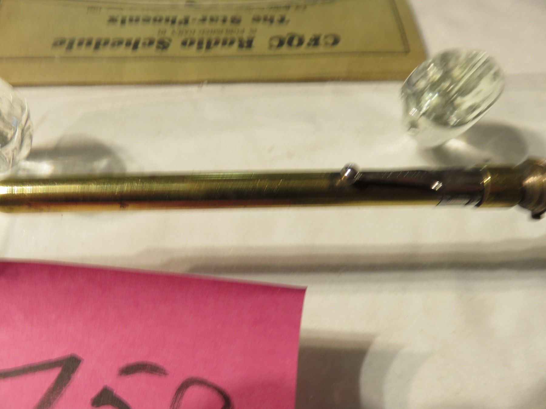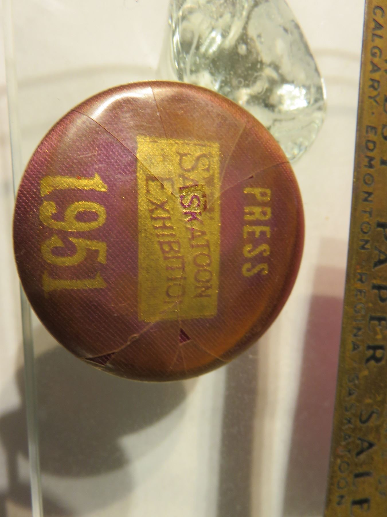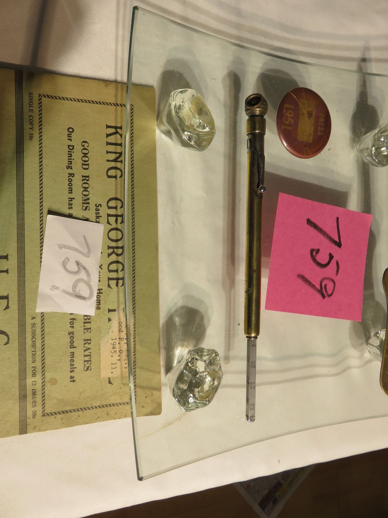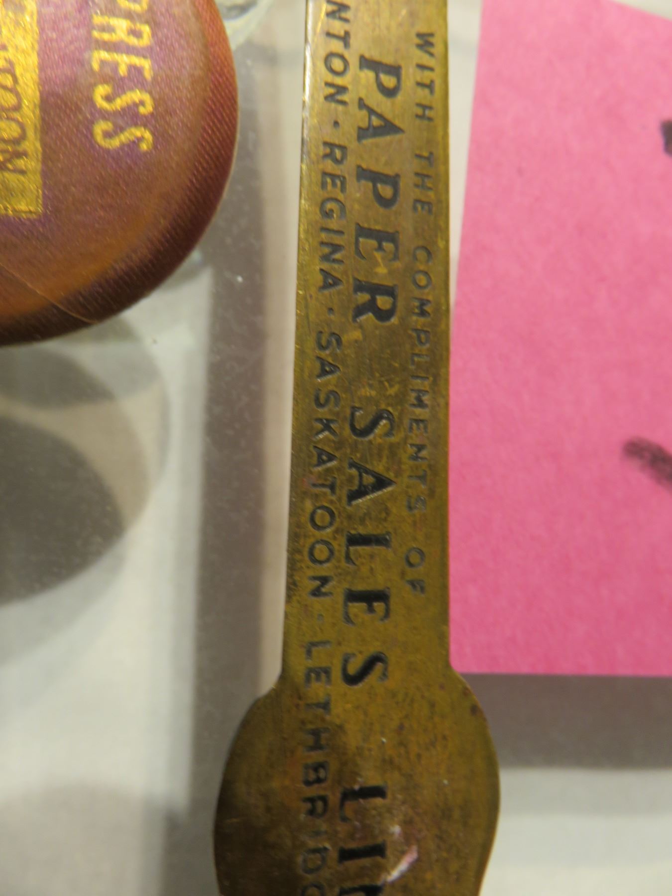 Vintage brass tire gauge - letter opener old Saskatoon business, Press button Saskatoon 1951, footed glass dish, Old Saskatoon magazine