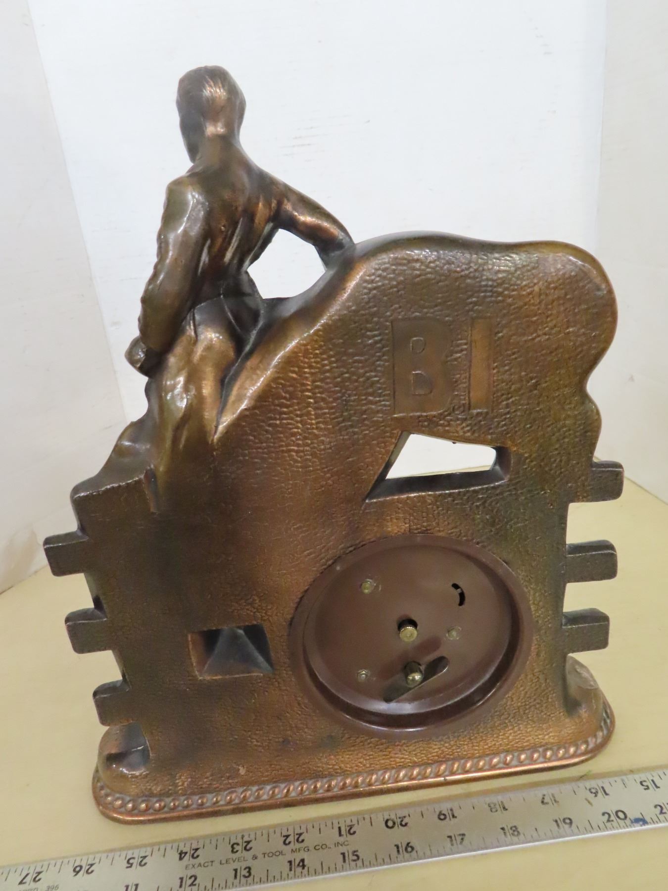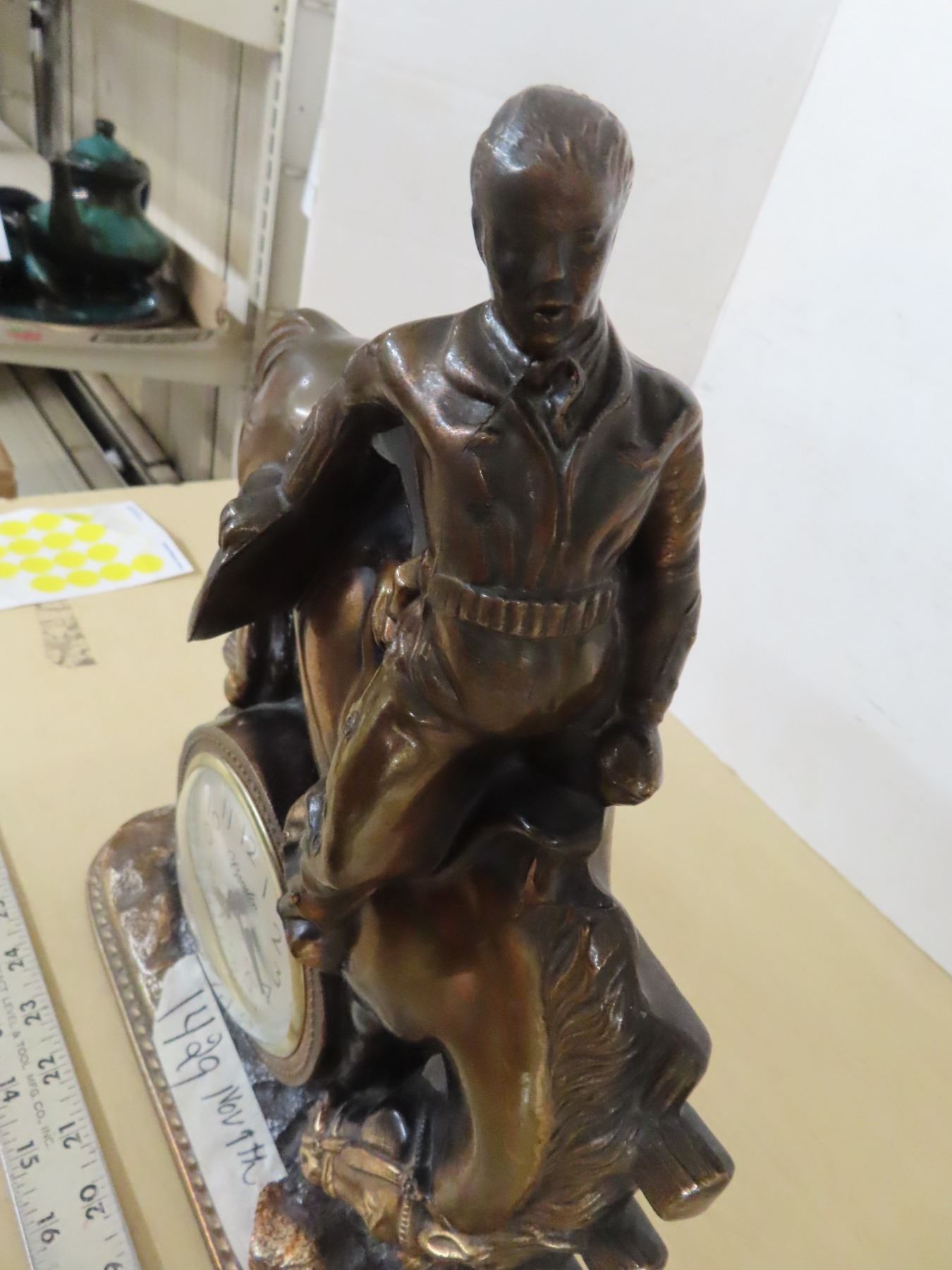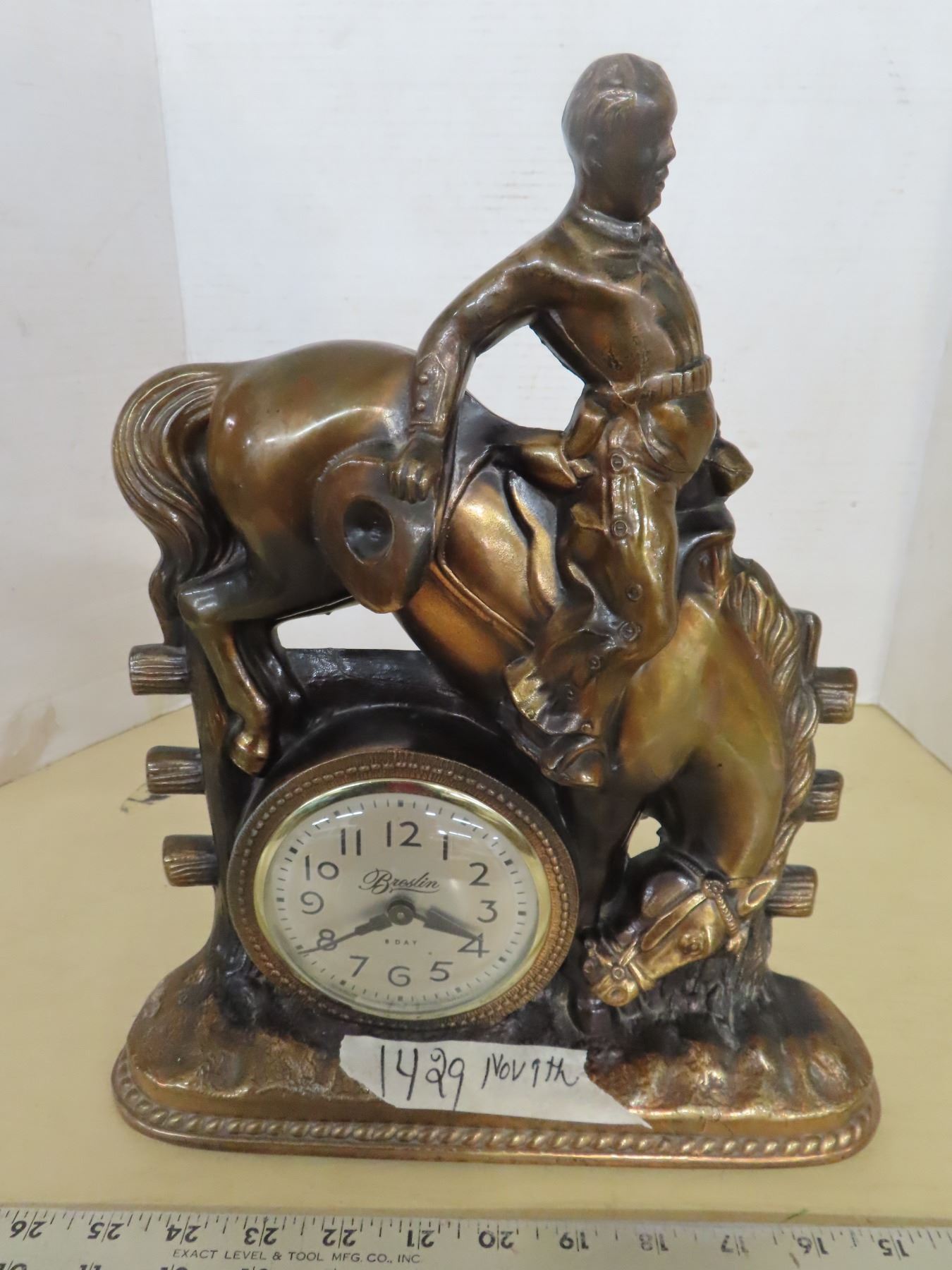Vintage bronze bucking broslin clock, horse and rider clock
