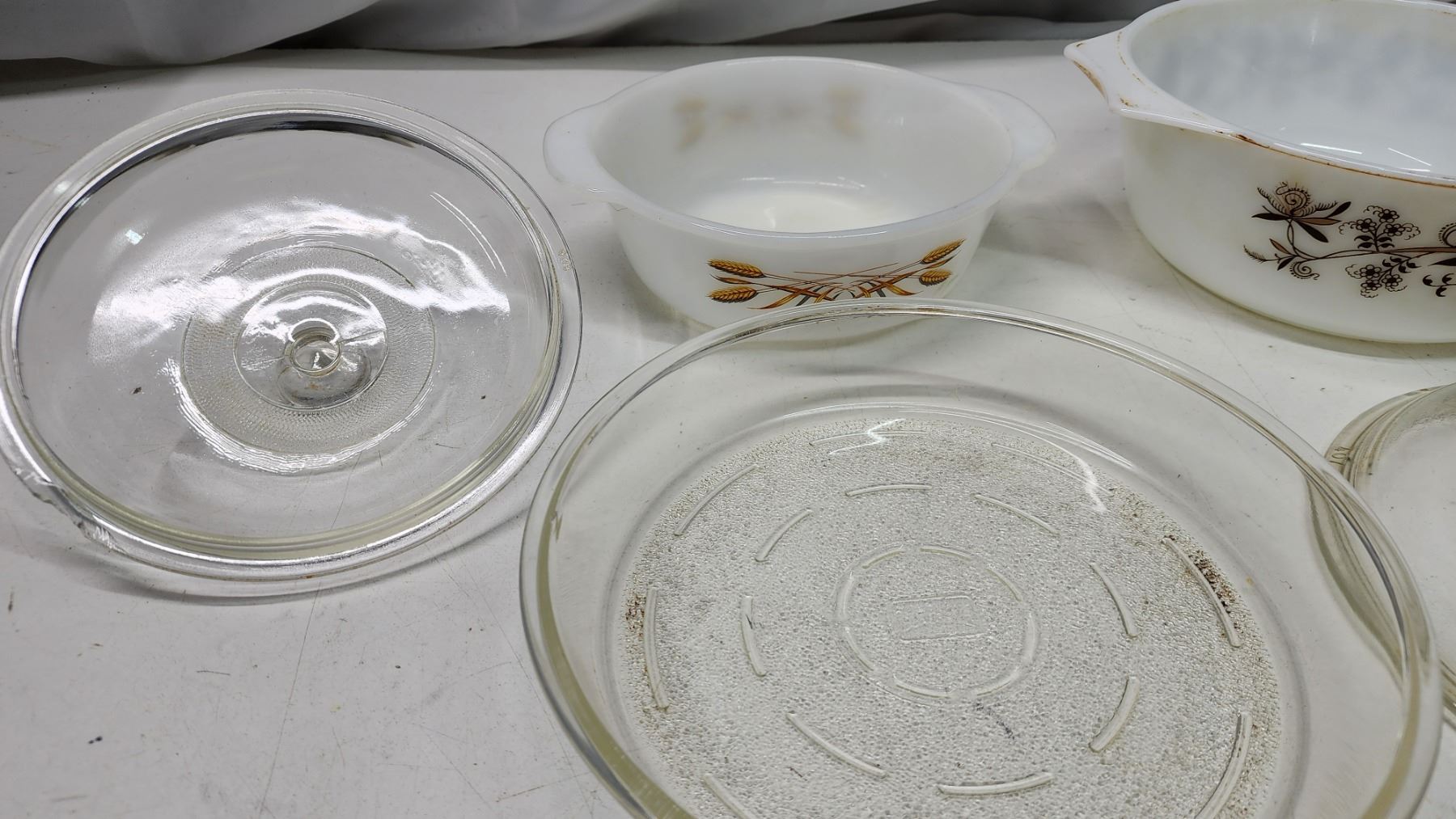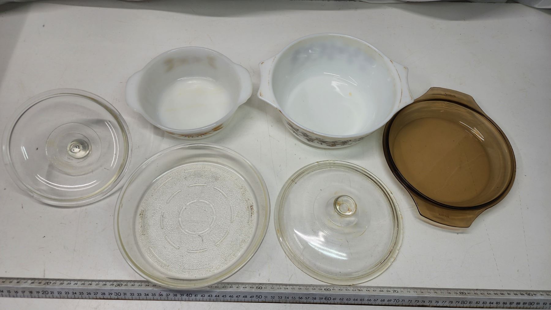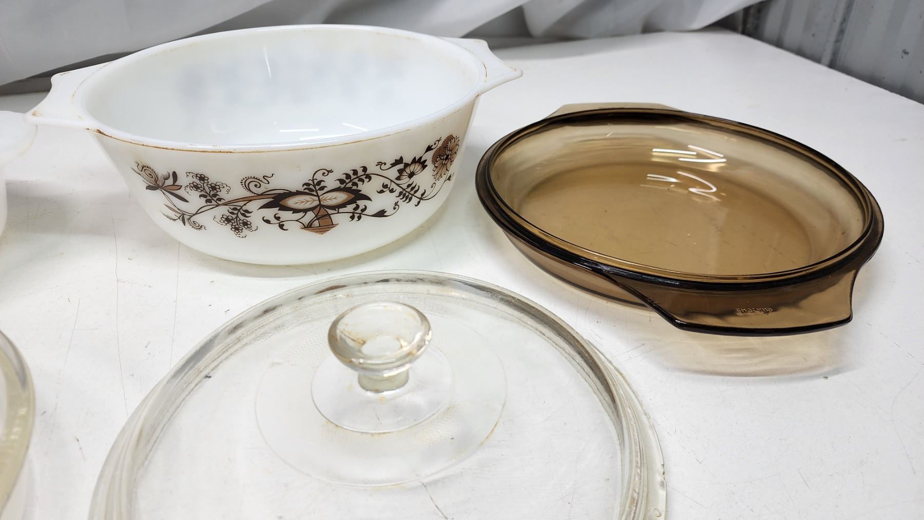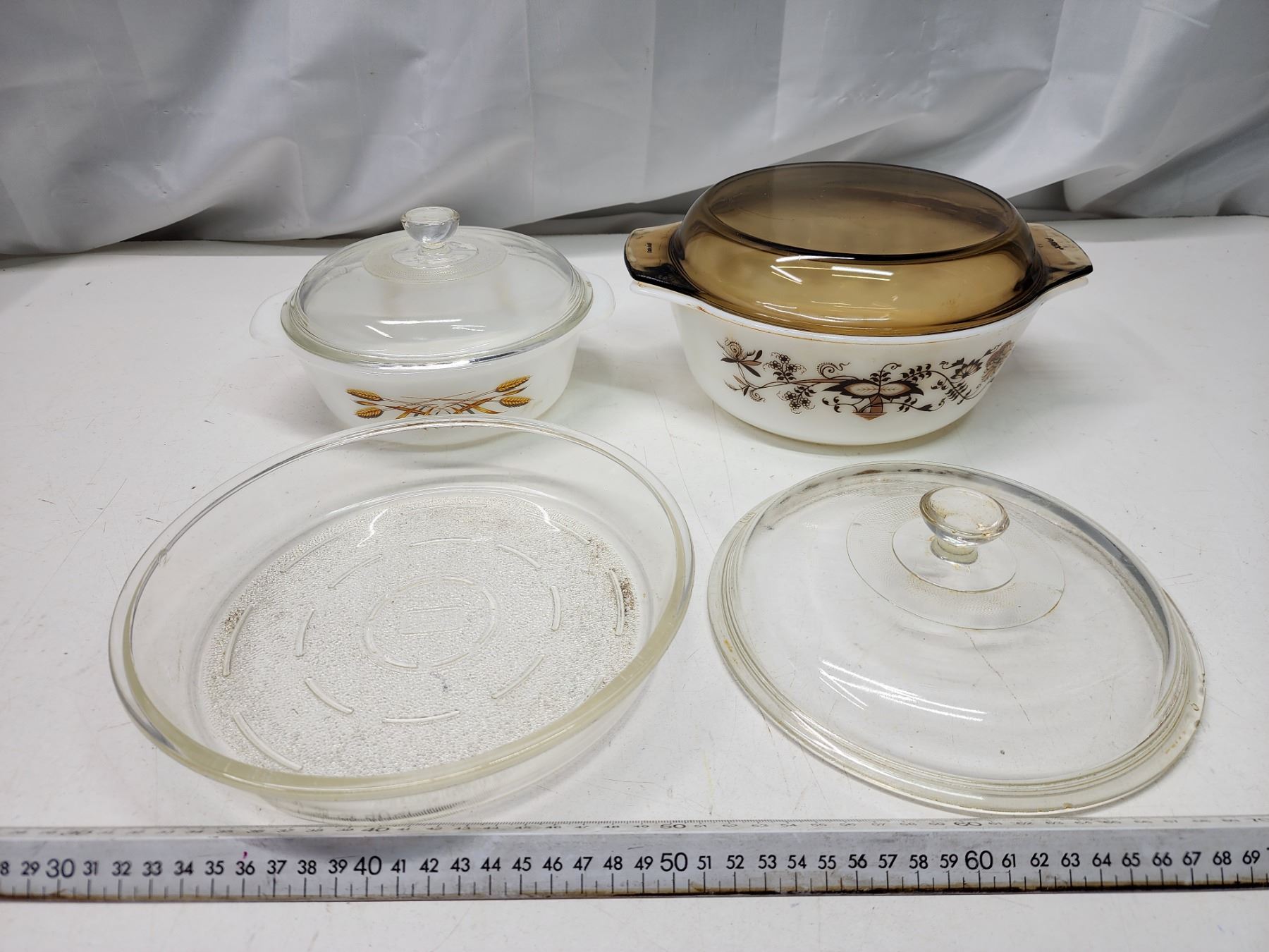 Vintage casserole dishes, and pie plate, w/ extra lid