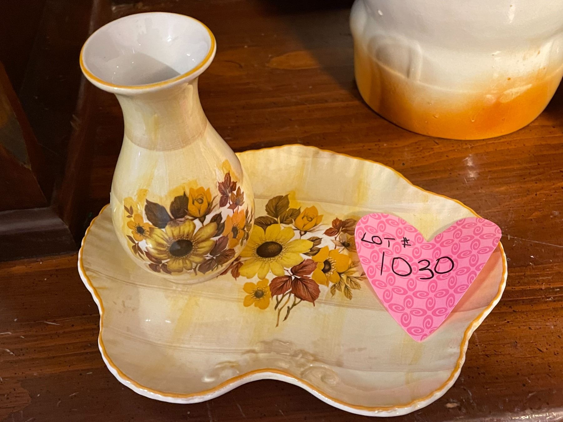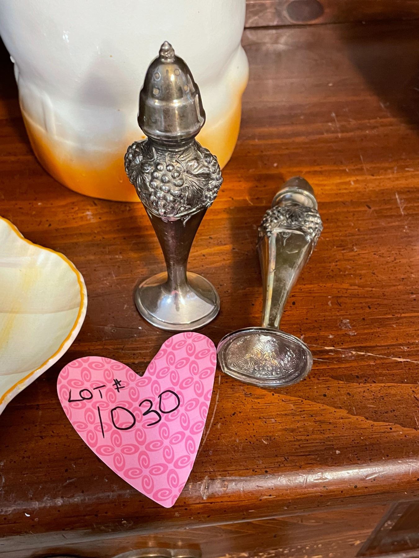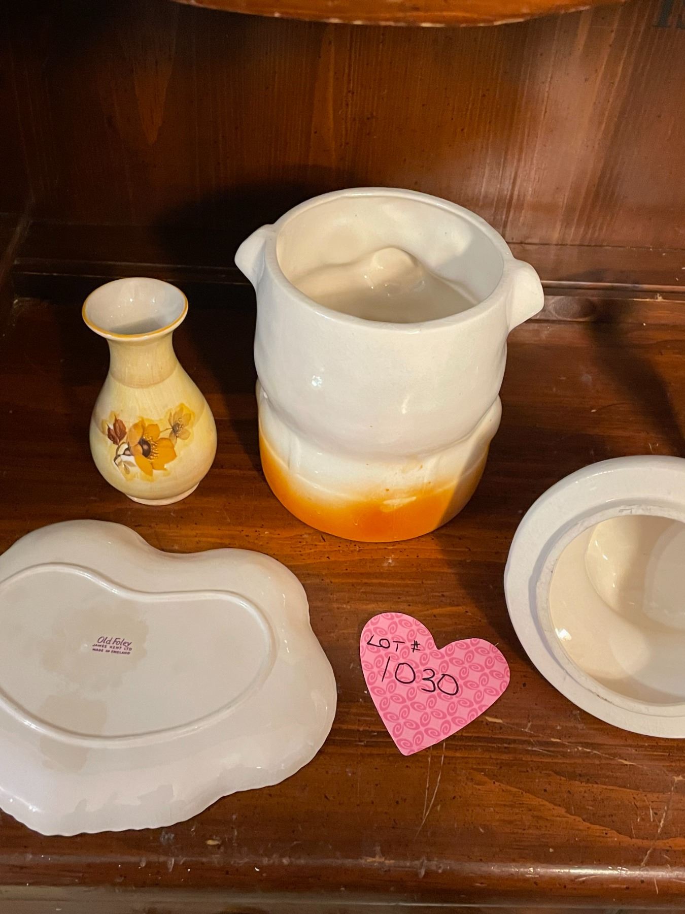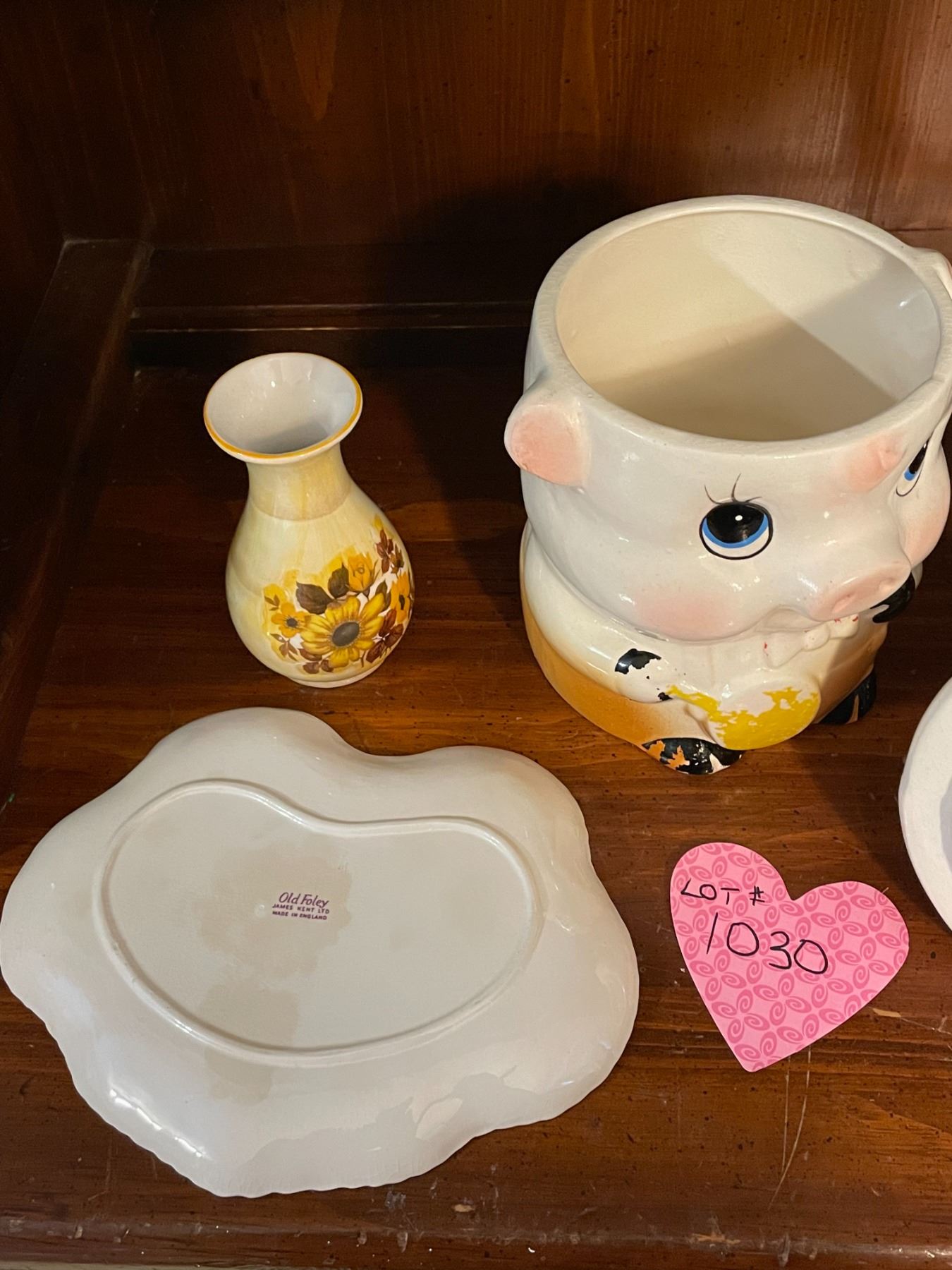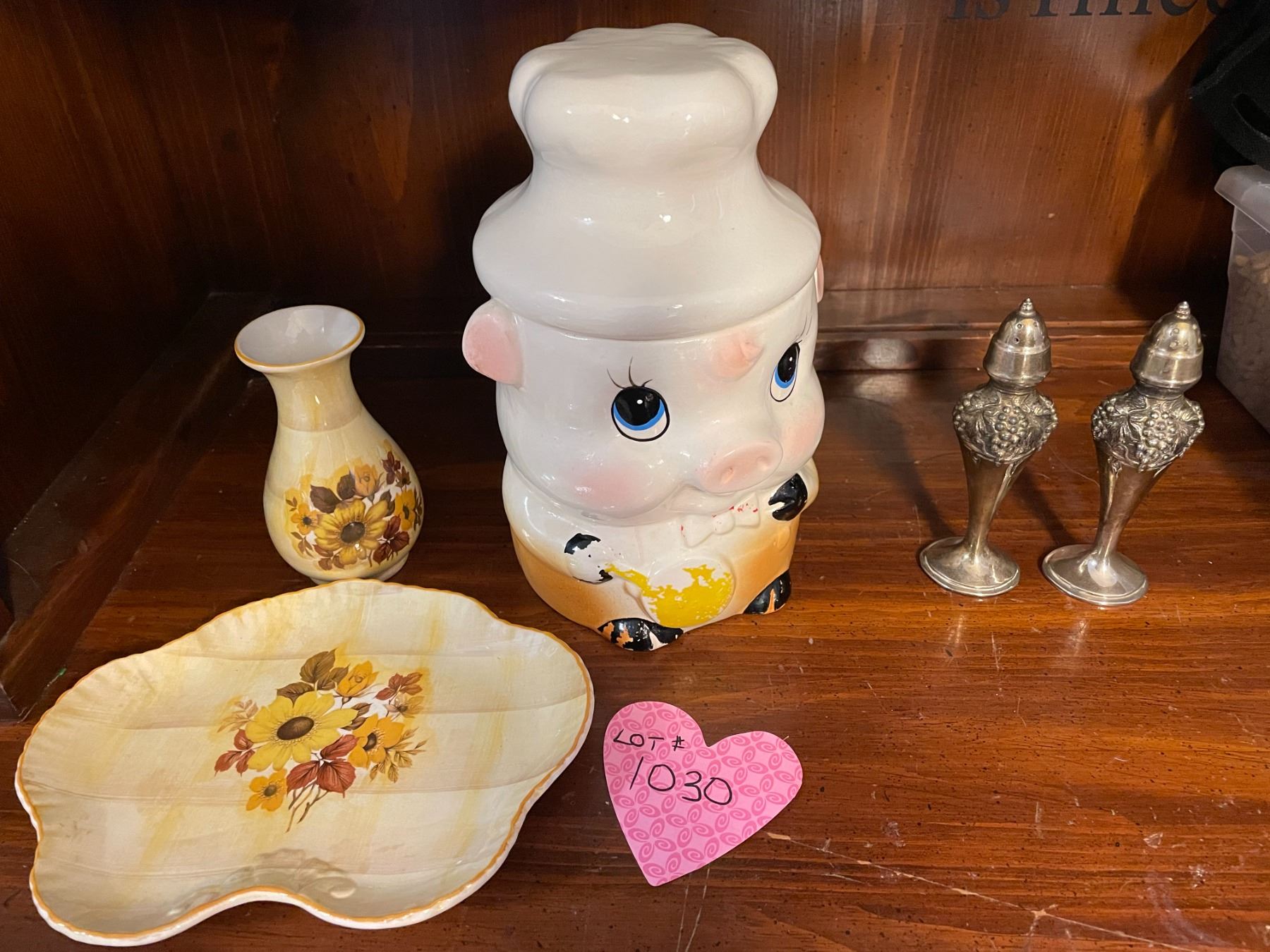 Vintage ceramic, piggy cookie jar, 2 Old Foley pieces, and Viking silver plated salt and pepper shak