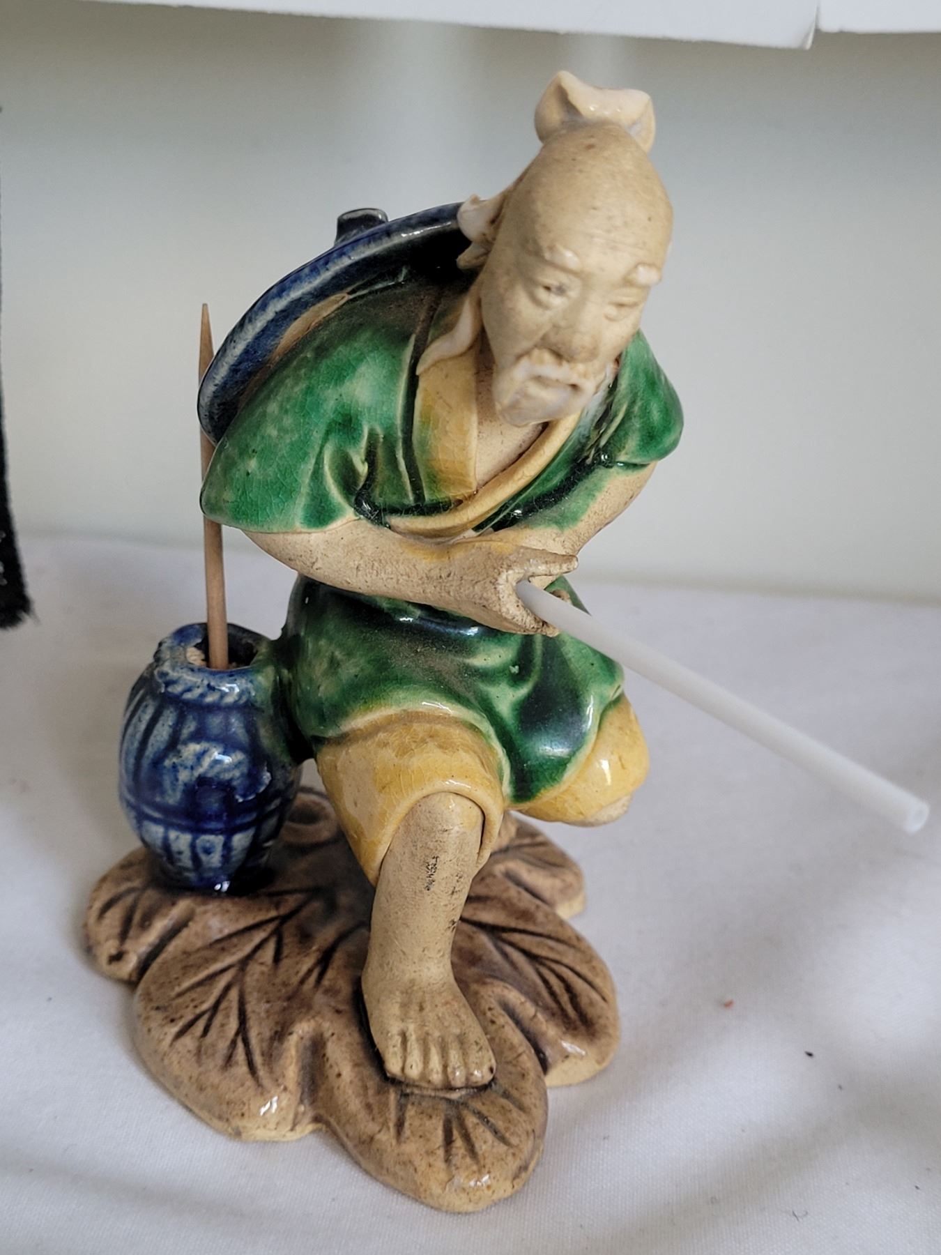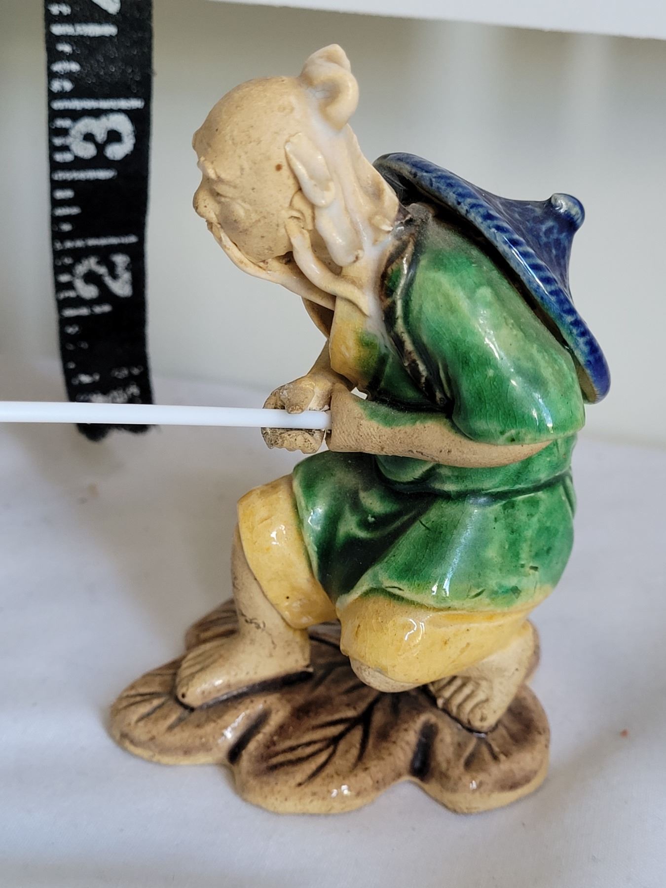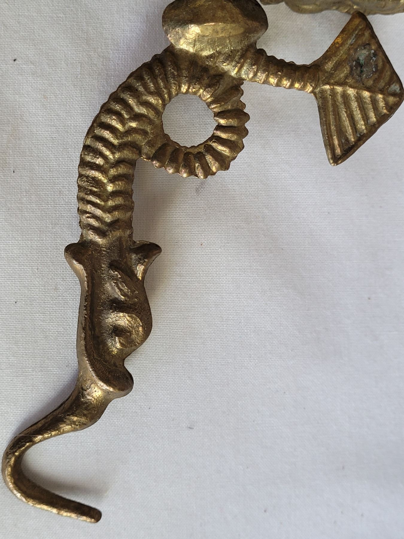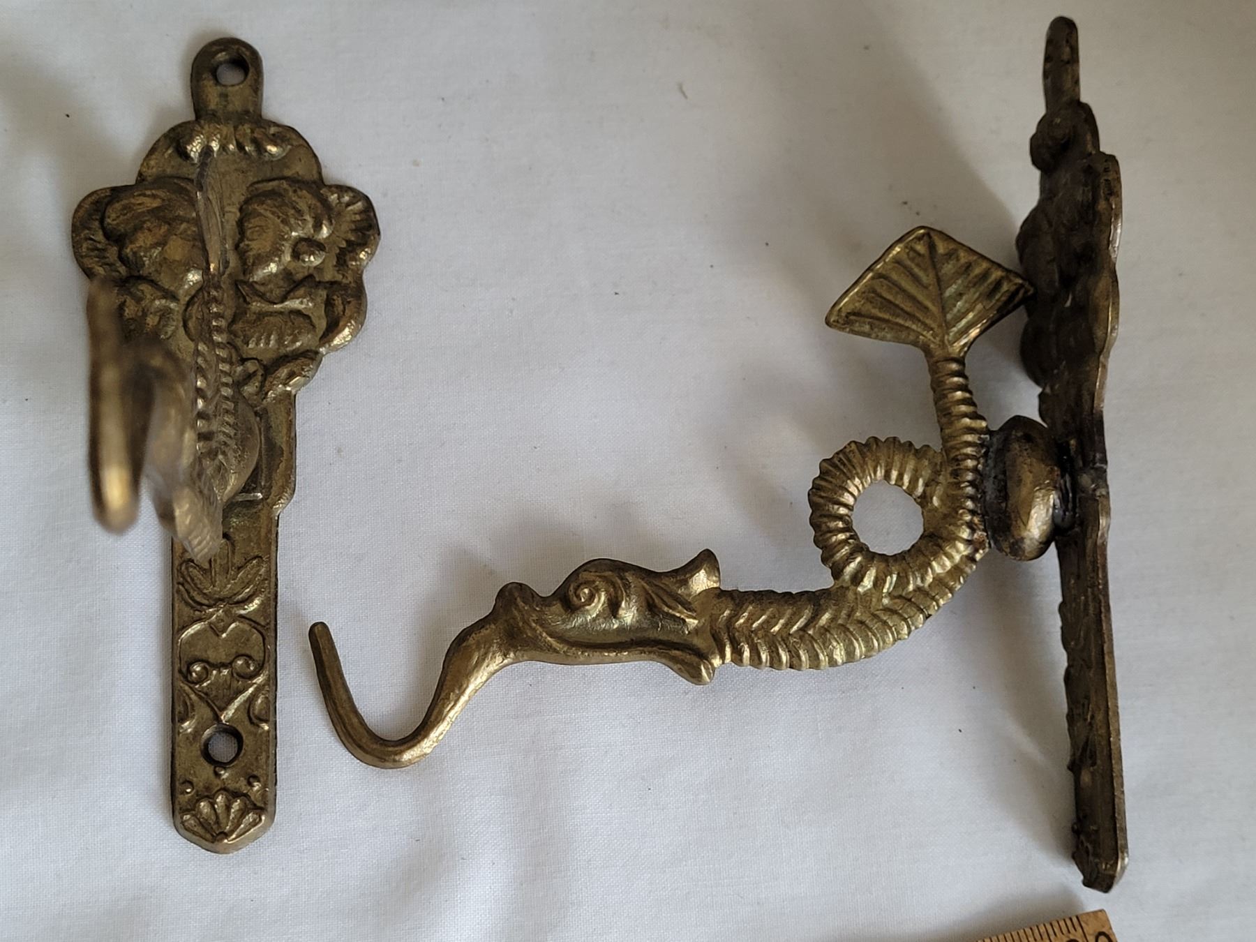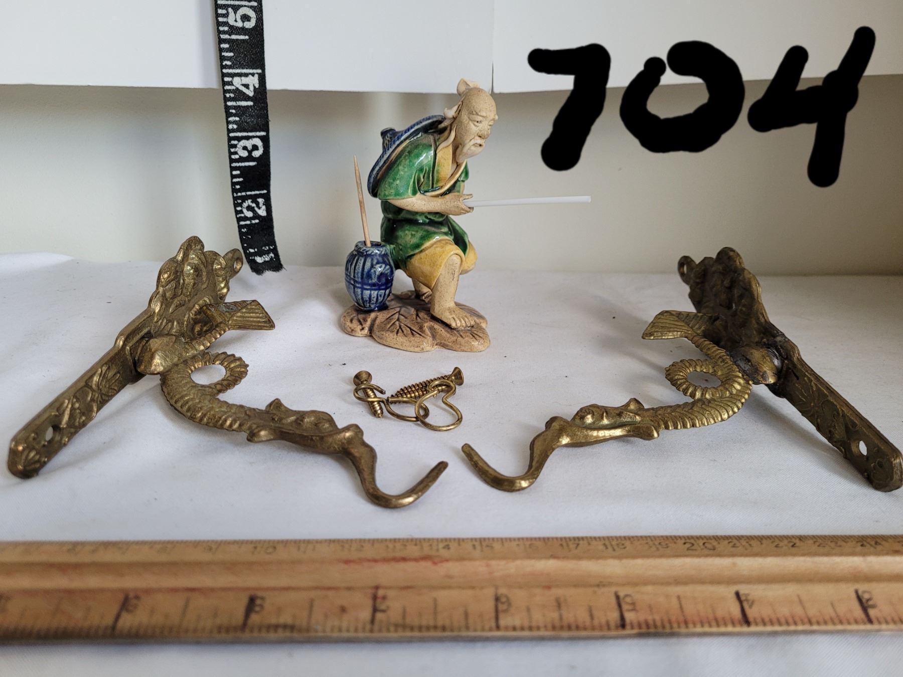 Vintage chinese mud man and brass dragon shelf hooks.