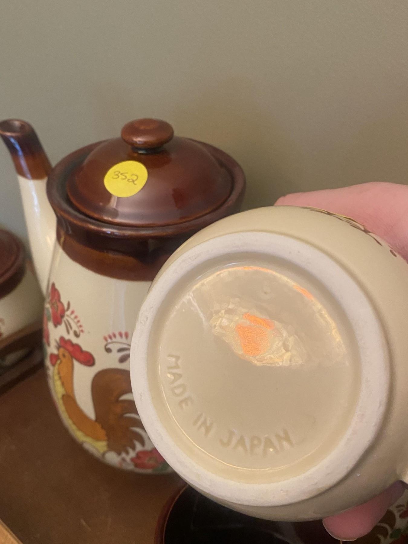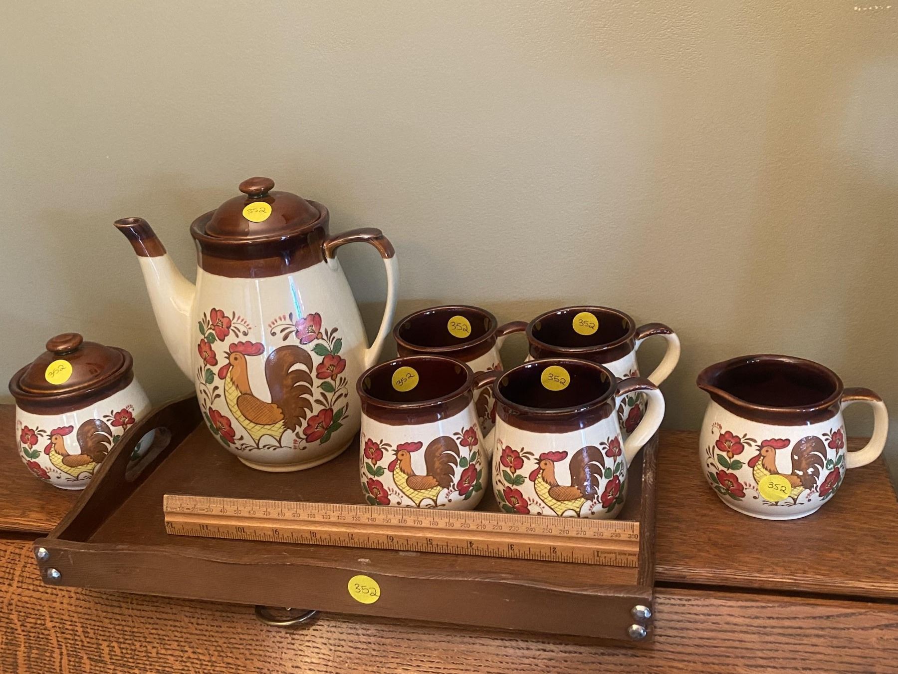 Vintage coffee service set with wooden tray. Ceramic set with rooster and floral, painted design, made in Japan. Includes 4 cups, sugar bowl, creamer and coffee pot with lid. No cracks or chips.