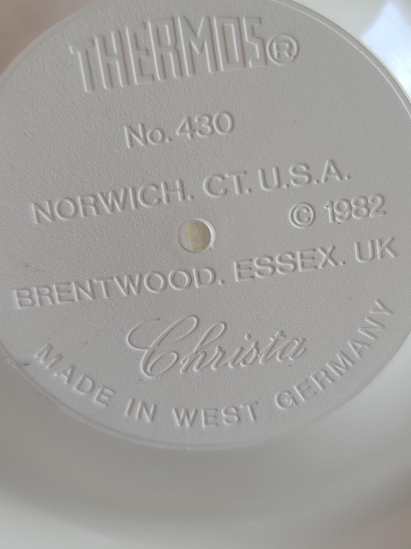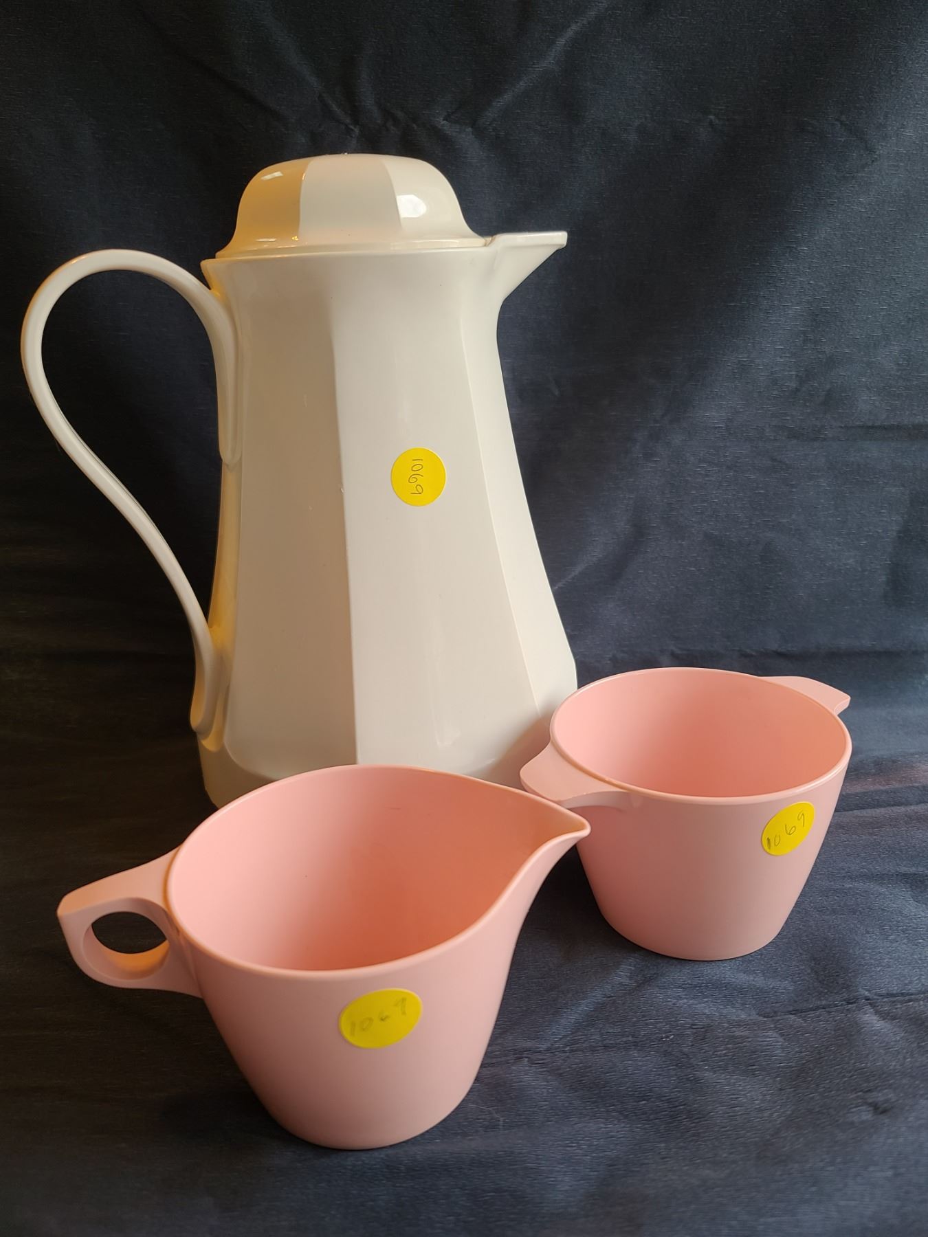 Vintage coffee set: 1982 Vintage Thermos “Christa” No.430 Carafe, Vintage Genuine light pink melmac “Stylized Dinnerware” creamer, Vintage Genuine light pink melmac “Stylized Dinnerware” sugar