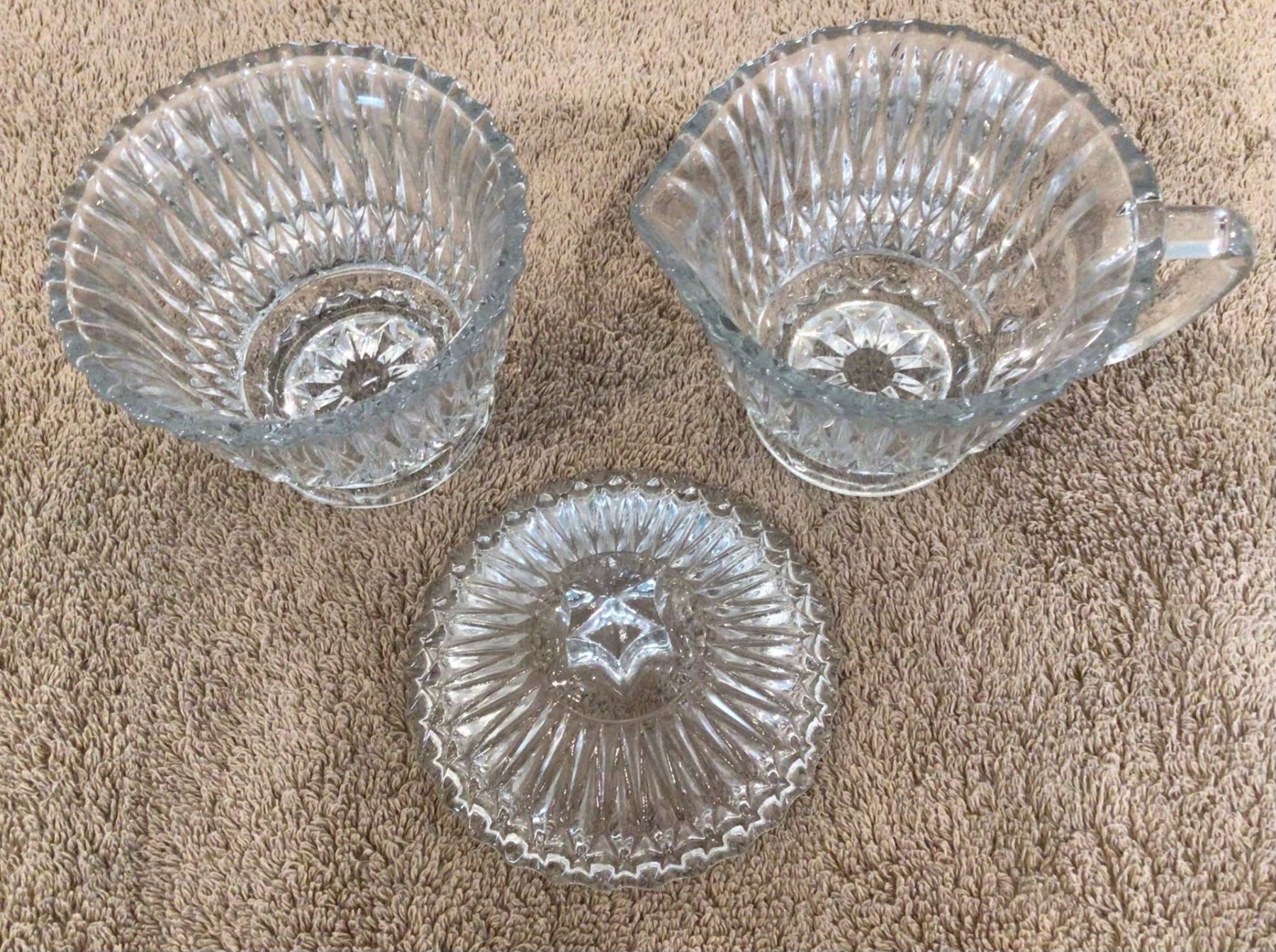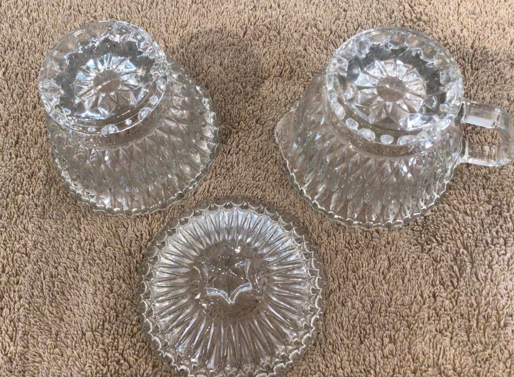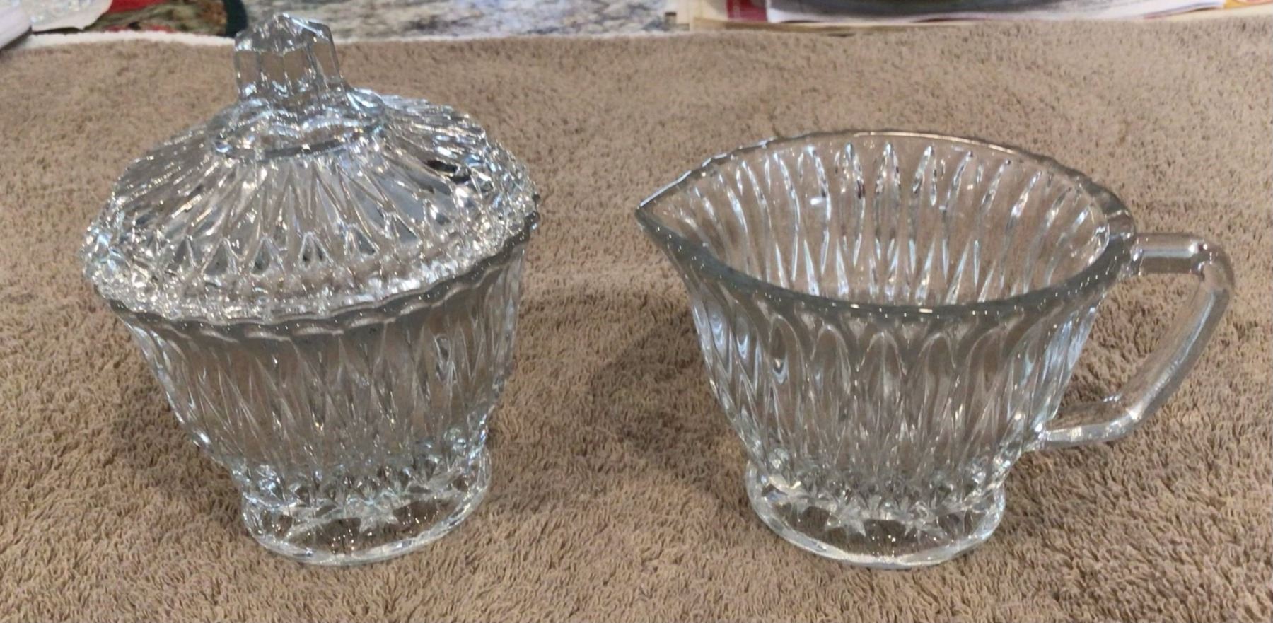 Vintage cut glass, diamond cut covered sugar and creamer set. No chips or cracks.