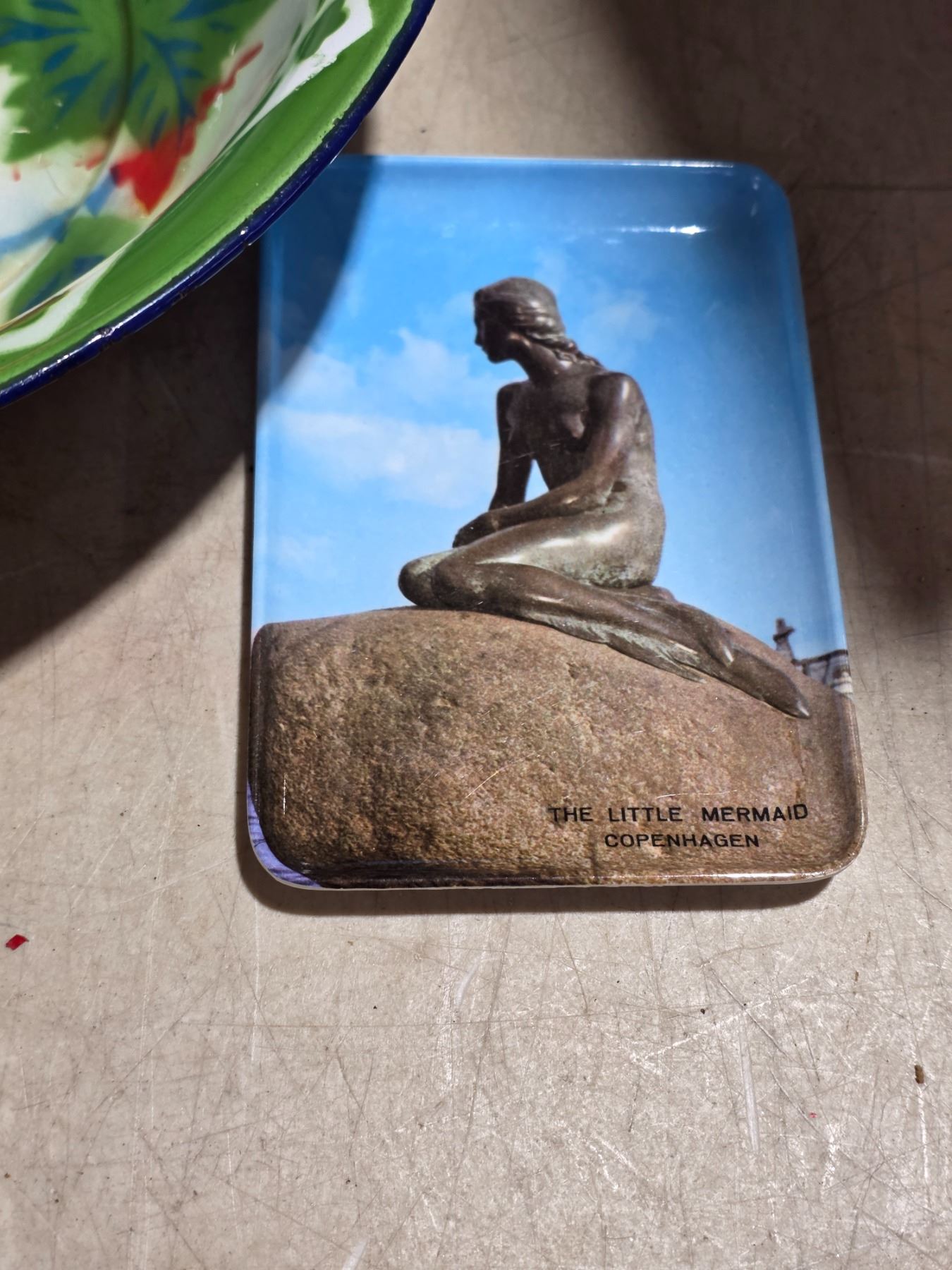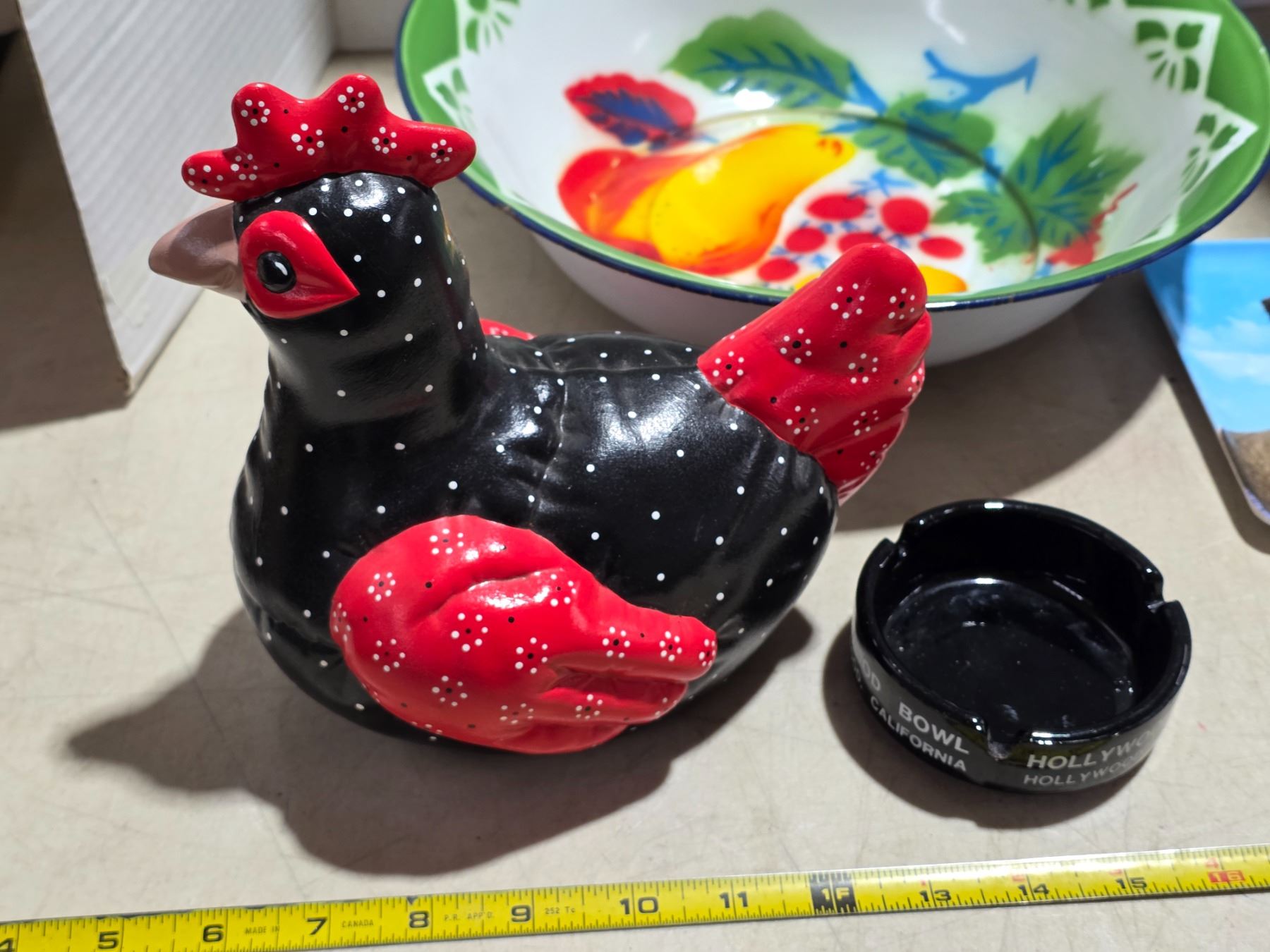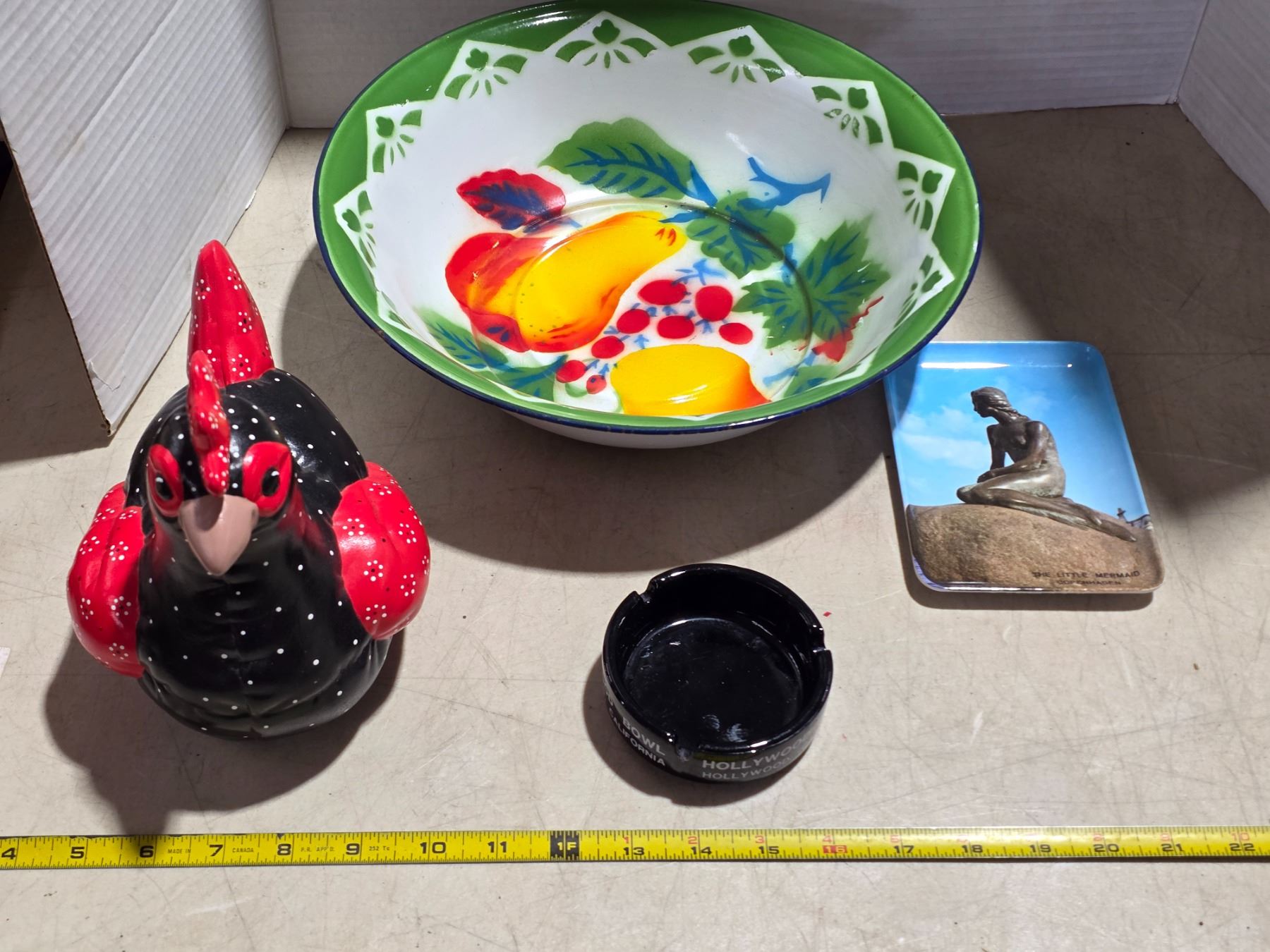 Vintage enamel basin, hand painted ceramic chicken, holly wood ashtray and copenhagen souvenier