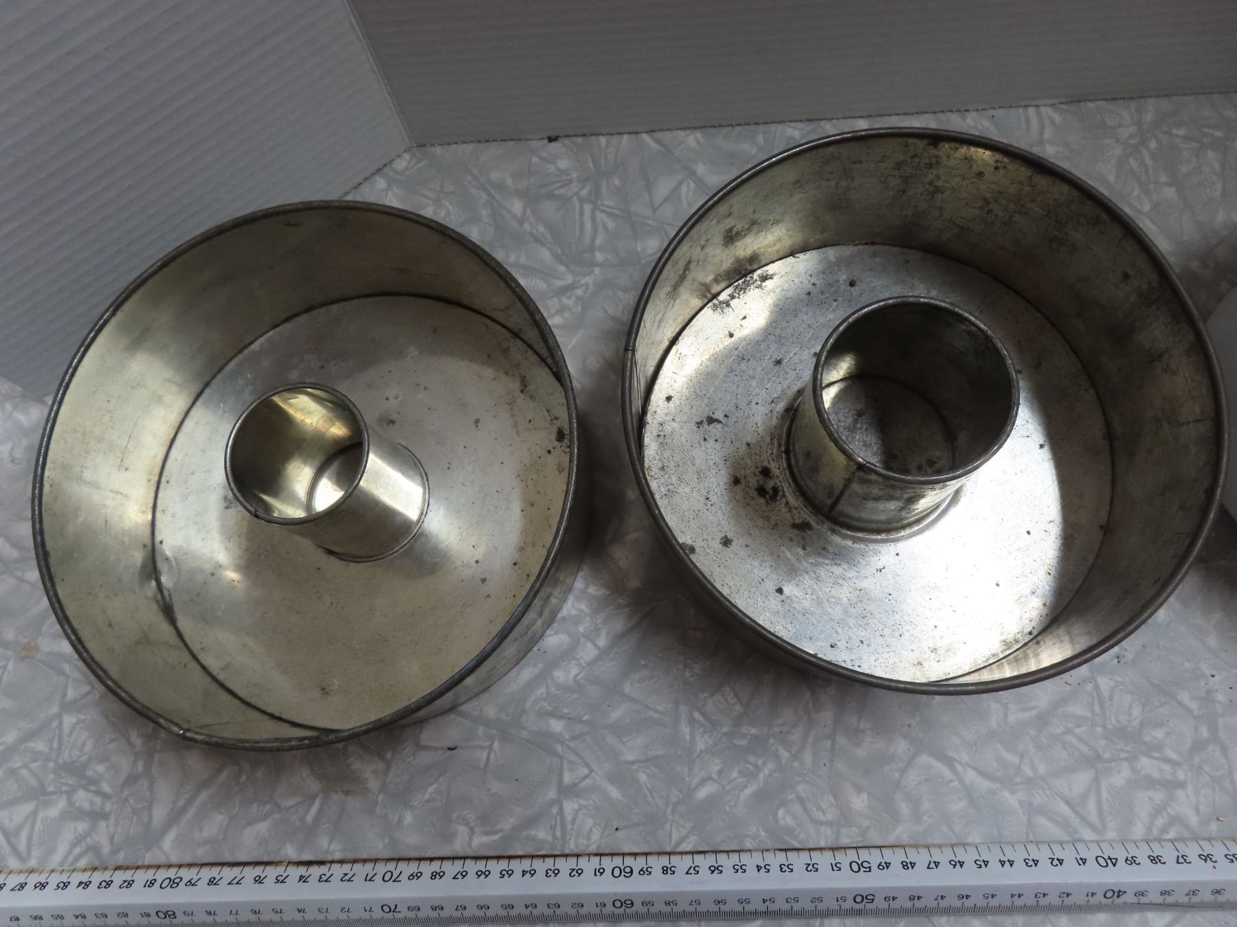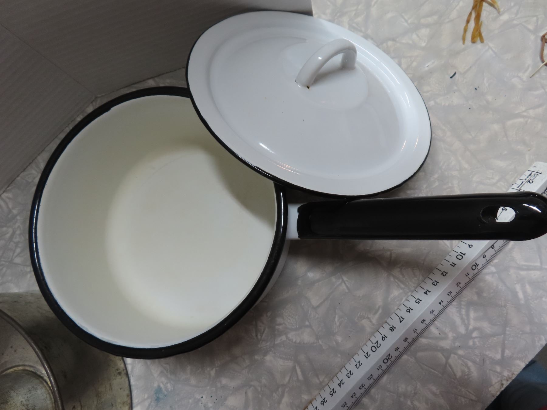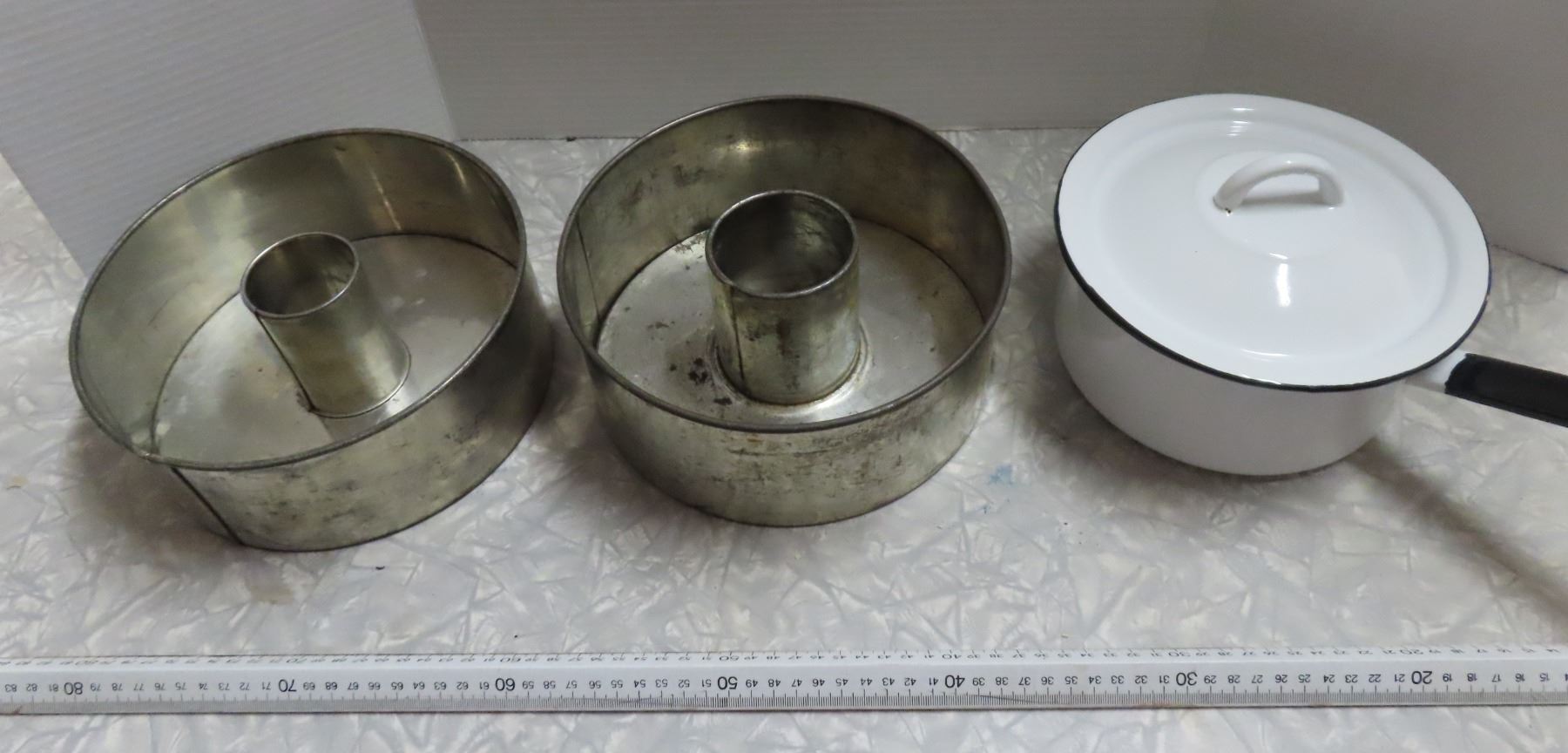 Vintage enamel sauce pan and 2 cake pans