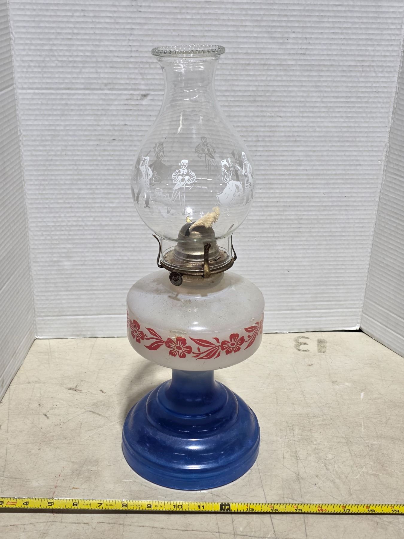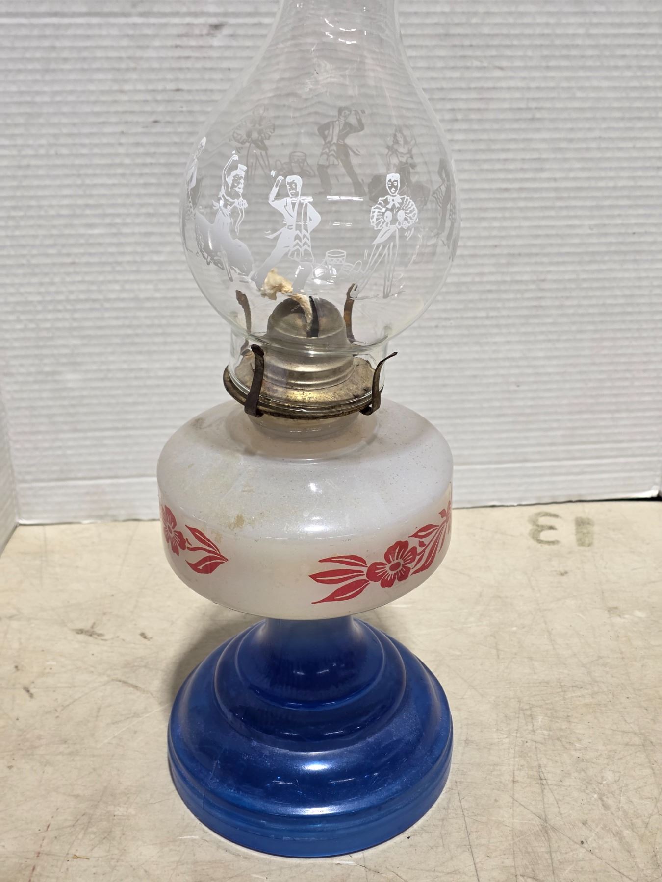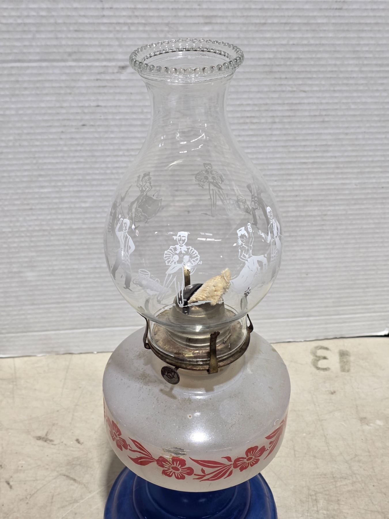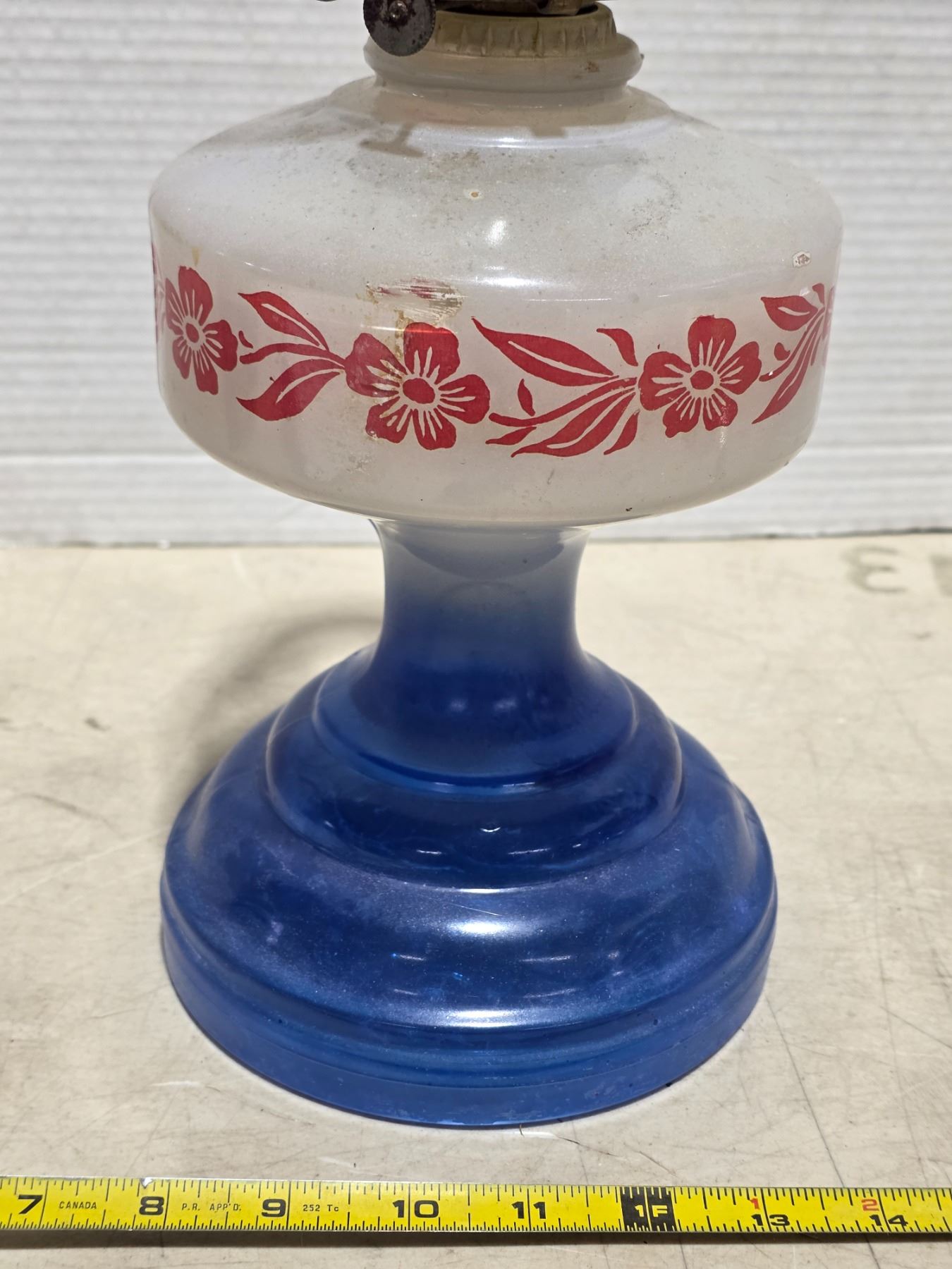 Vintage flower pattern coal oil lamp- blue base with chimney
