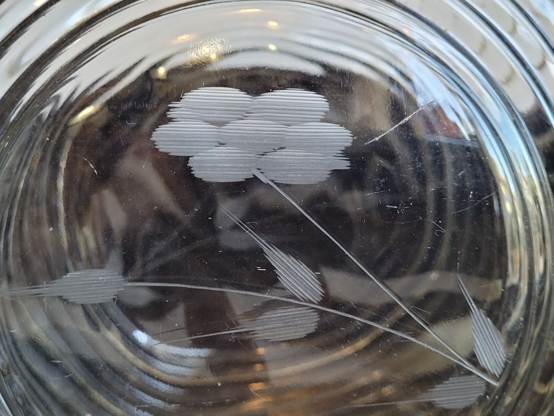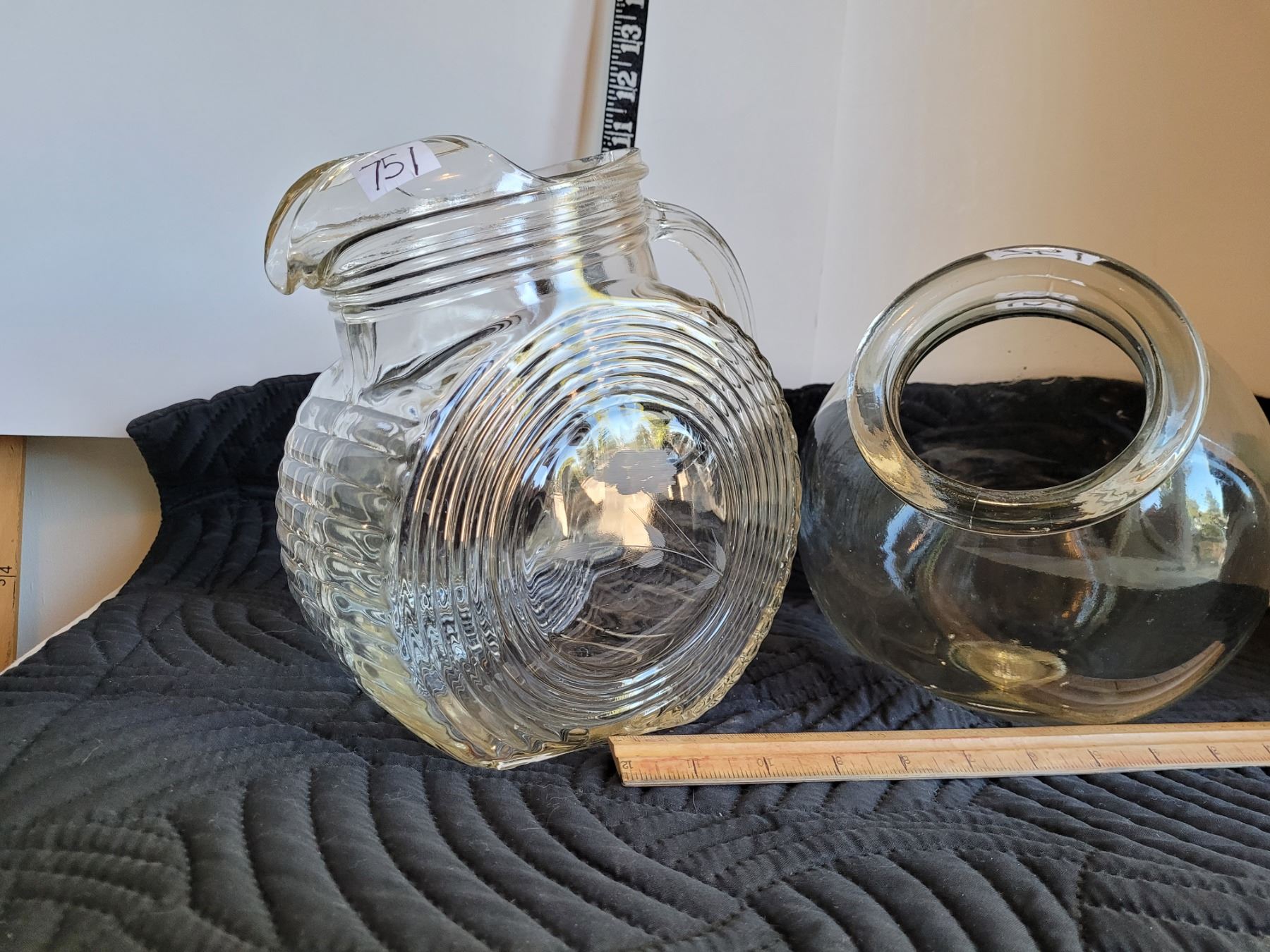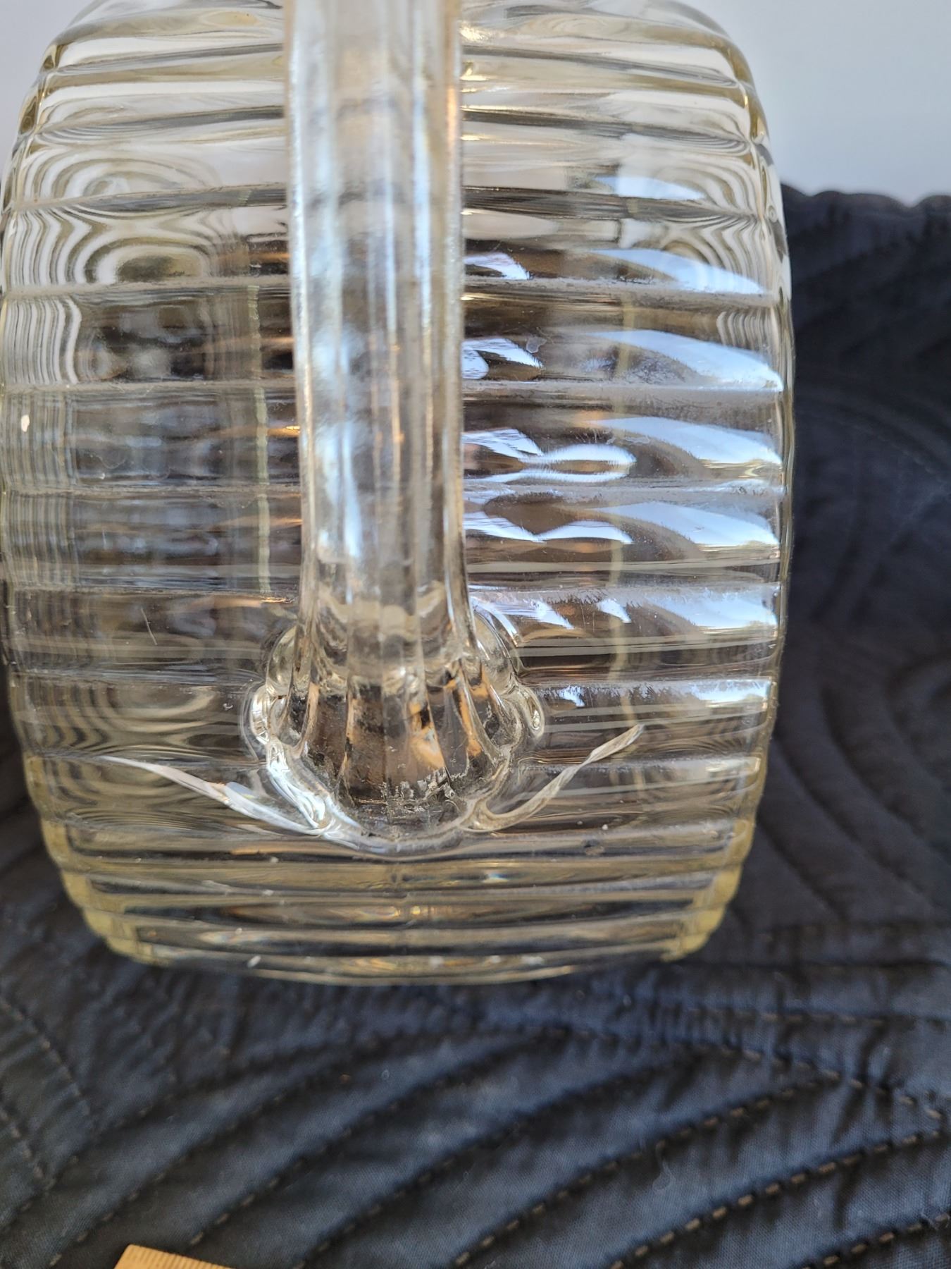 Vintage glass pitcher, etched sides,crack under handle. Old candy bowl.