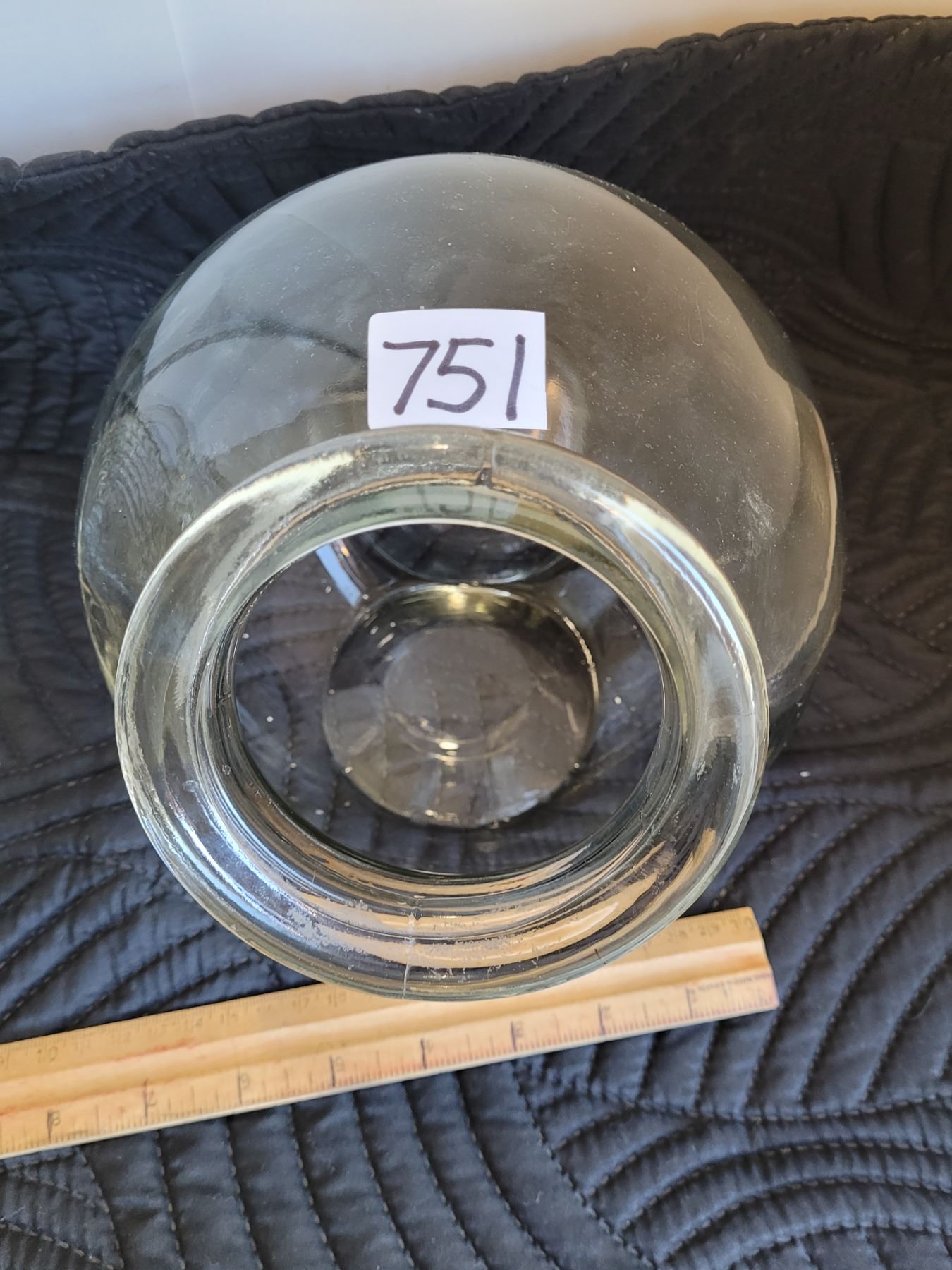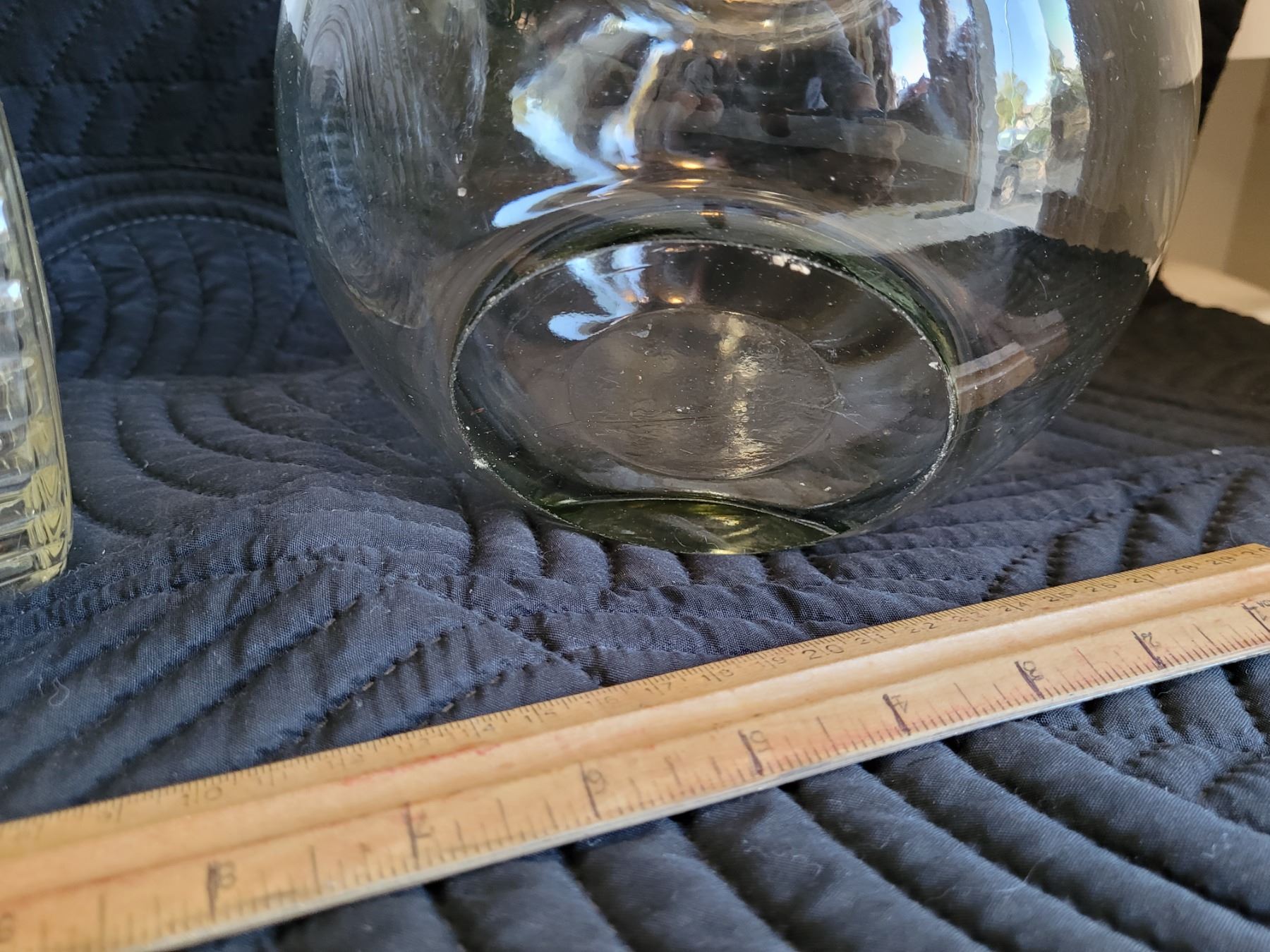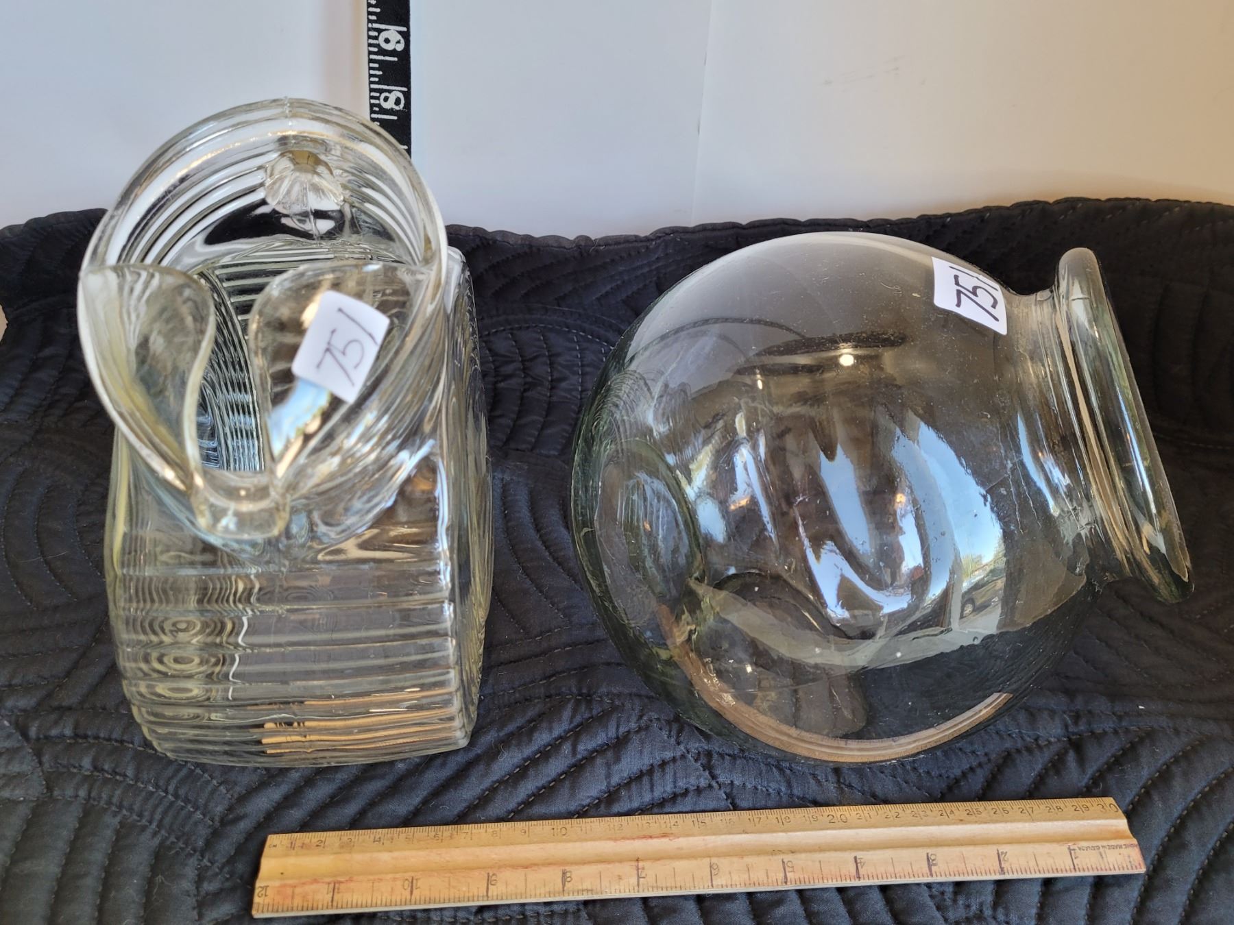 Vintage glass pitcher, etched sides,crack under handle. Old candy bowl.