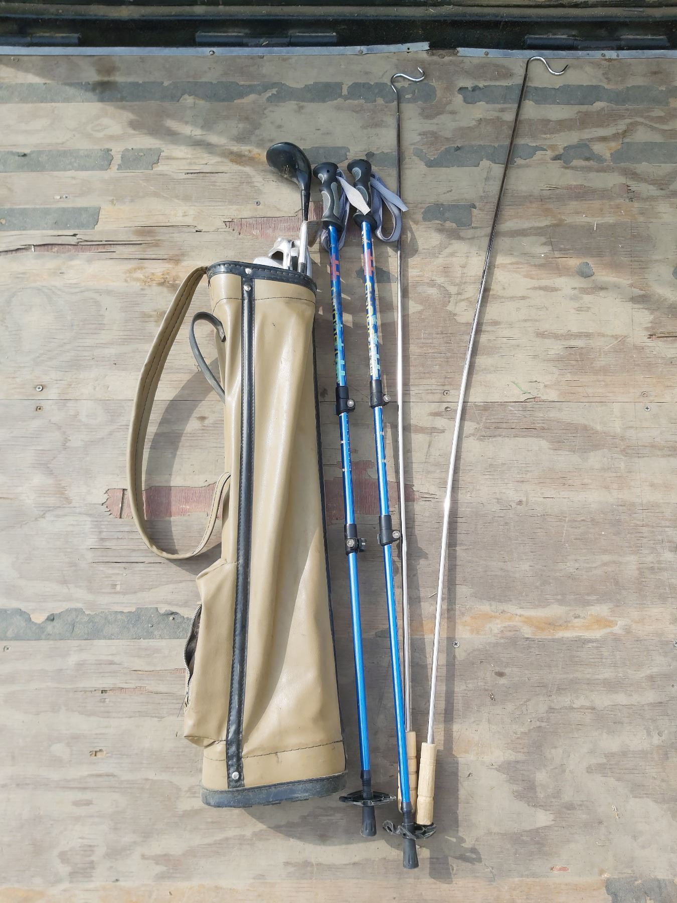 Vintage golf bag with clubs/Blue trekking poles/Metal roasting sticks