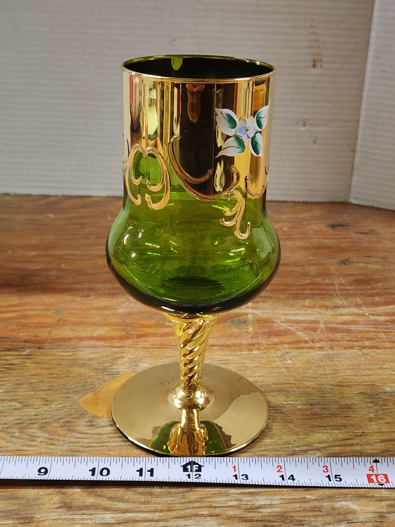Vintage green and gold leaf, hand painted glass goblet - 8"H