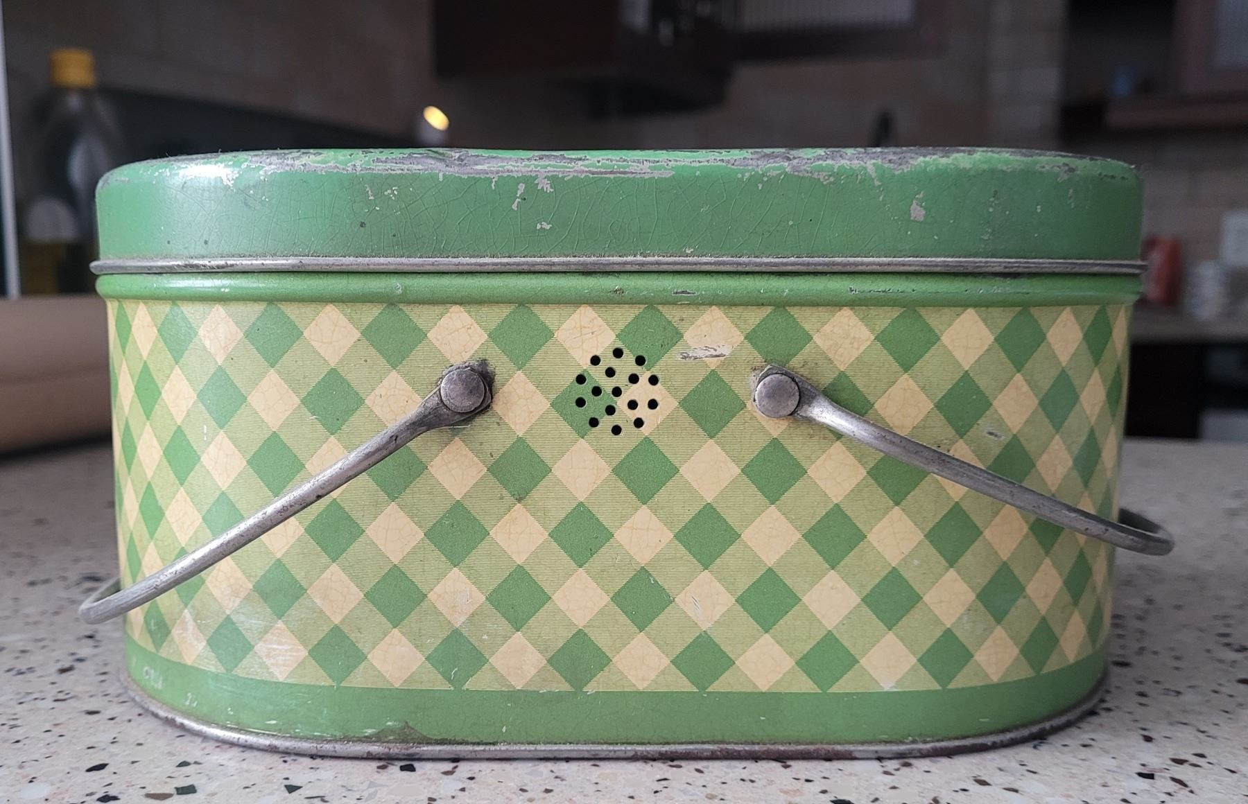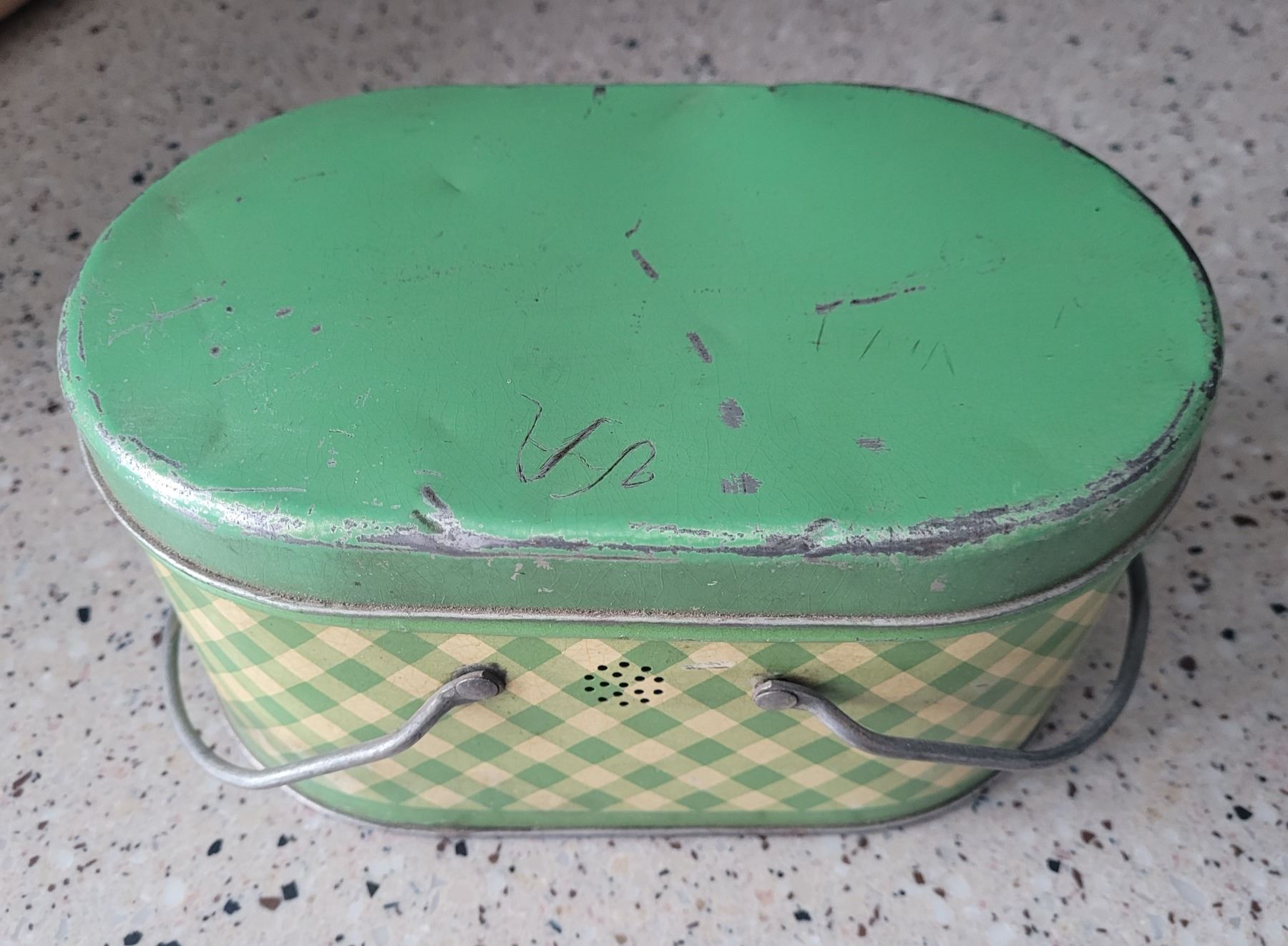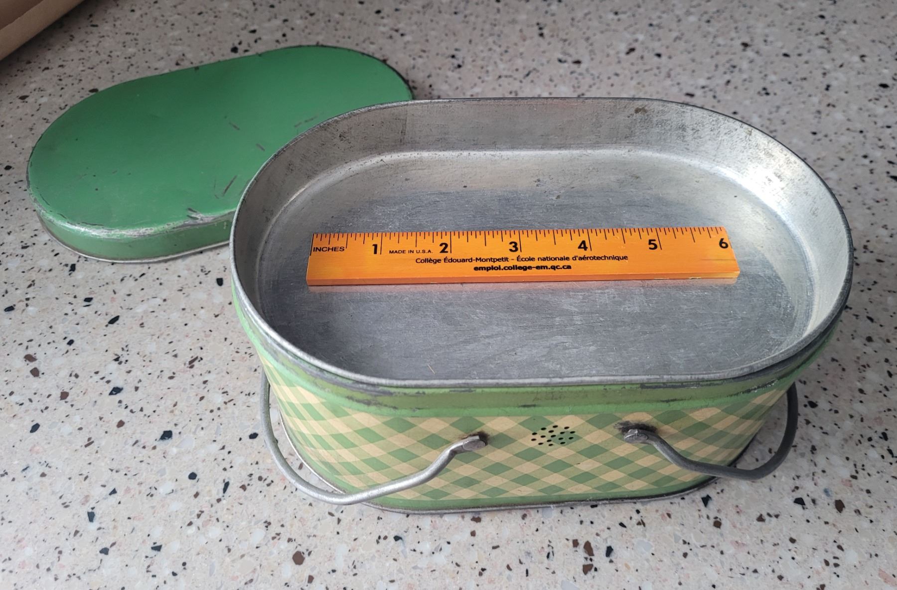 Vintage green and yellow oval metal child's lunch box with handles 8" x 5" x 4" with one inch deep removable insert
