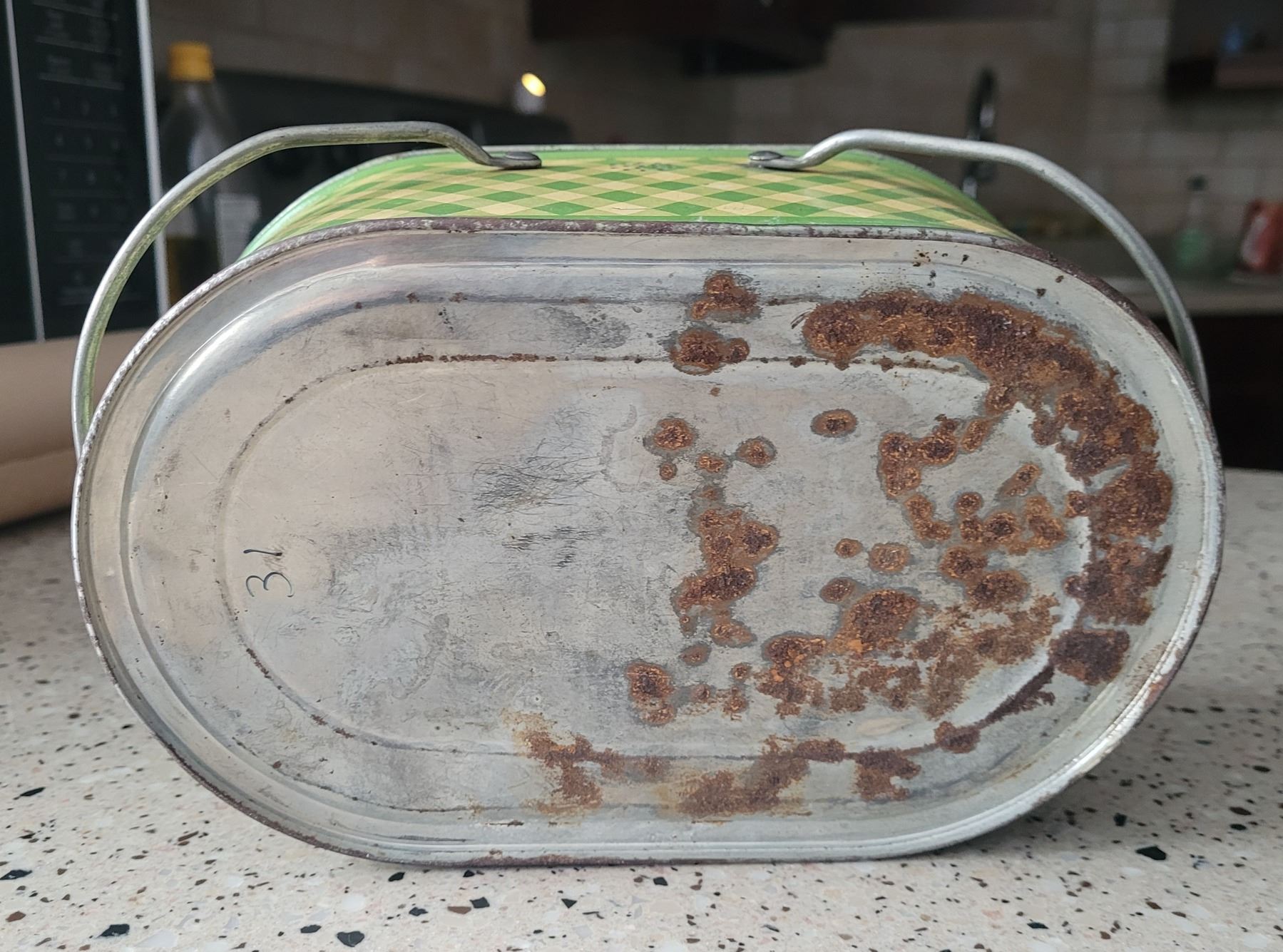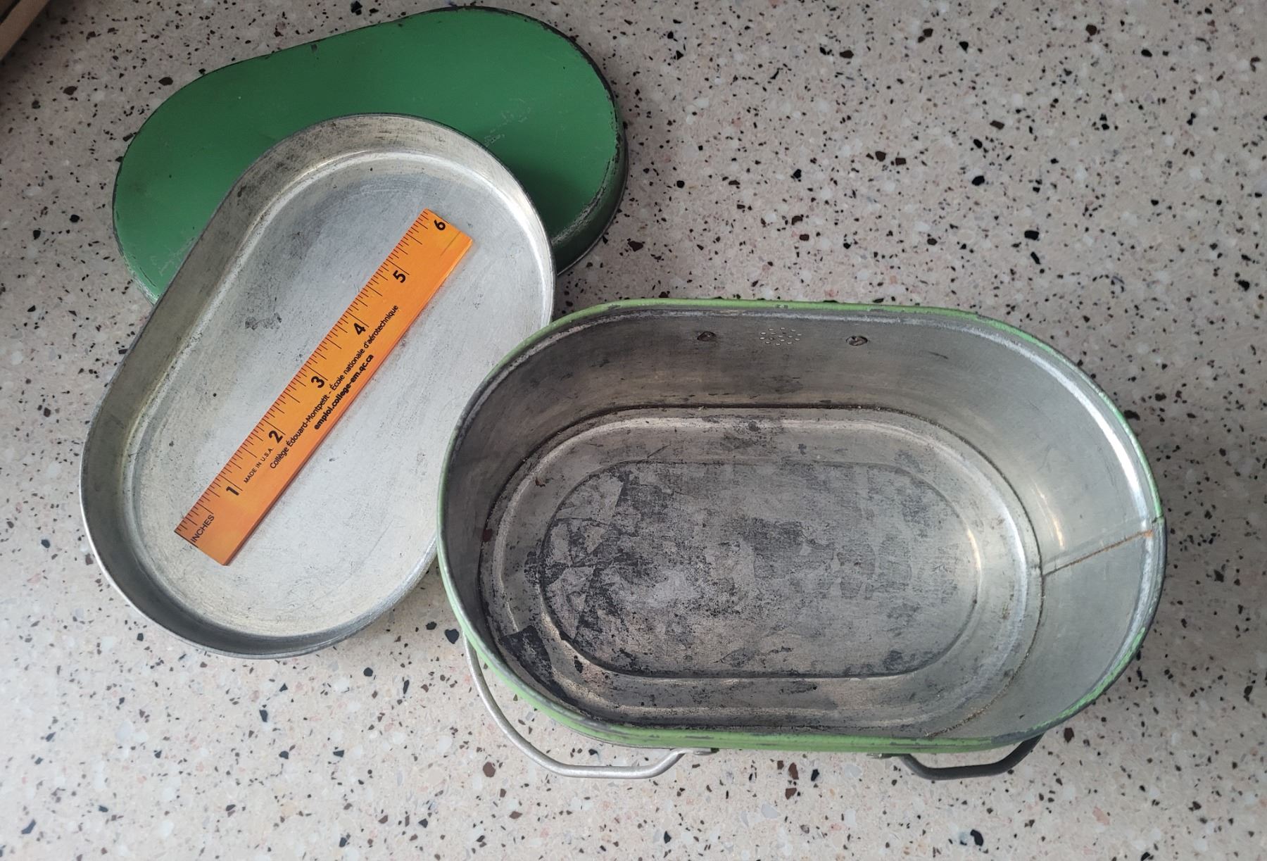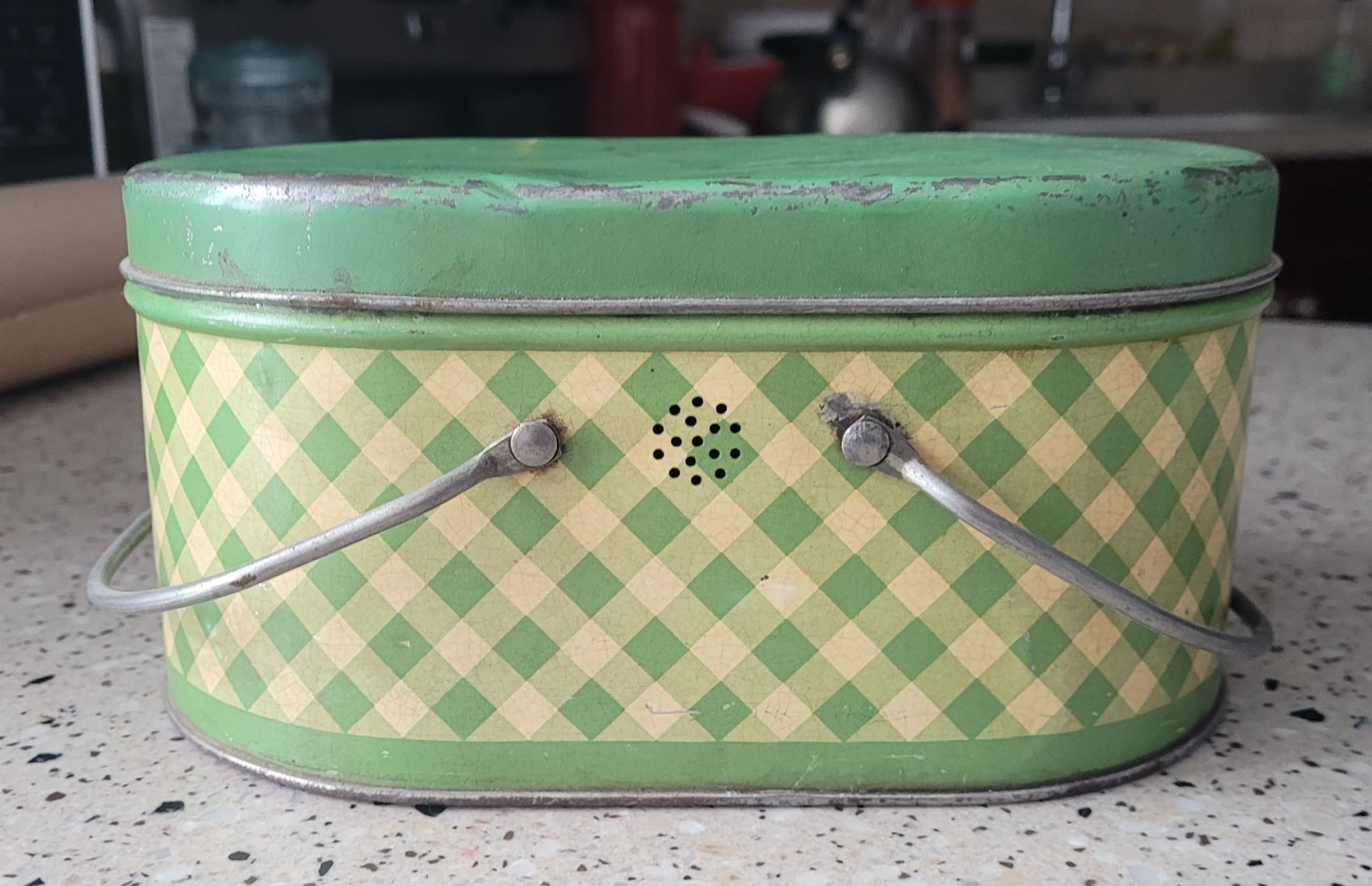 Vintage green and yellow oval metal child's lunch box with handles 8" x 5" x 4" with one inch deep removable insert