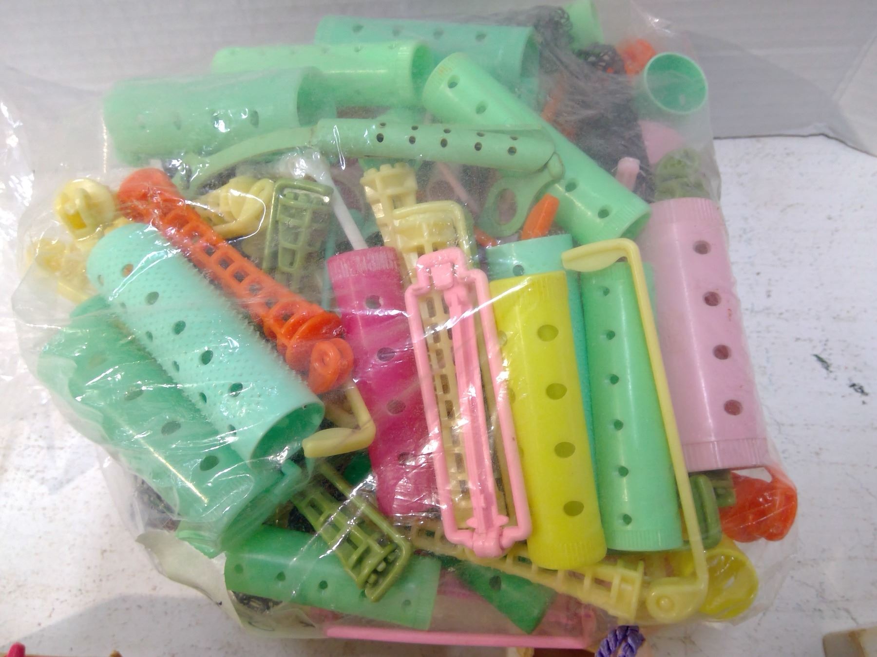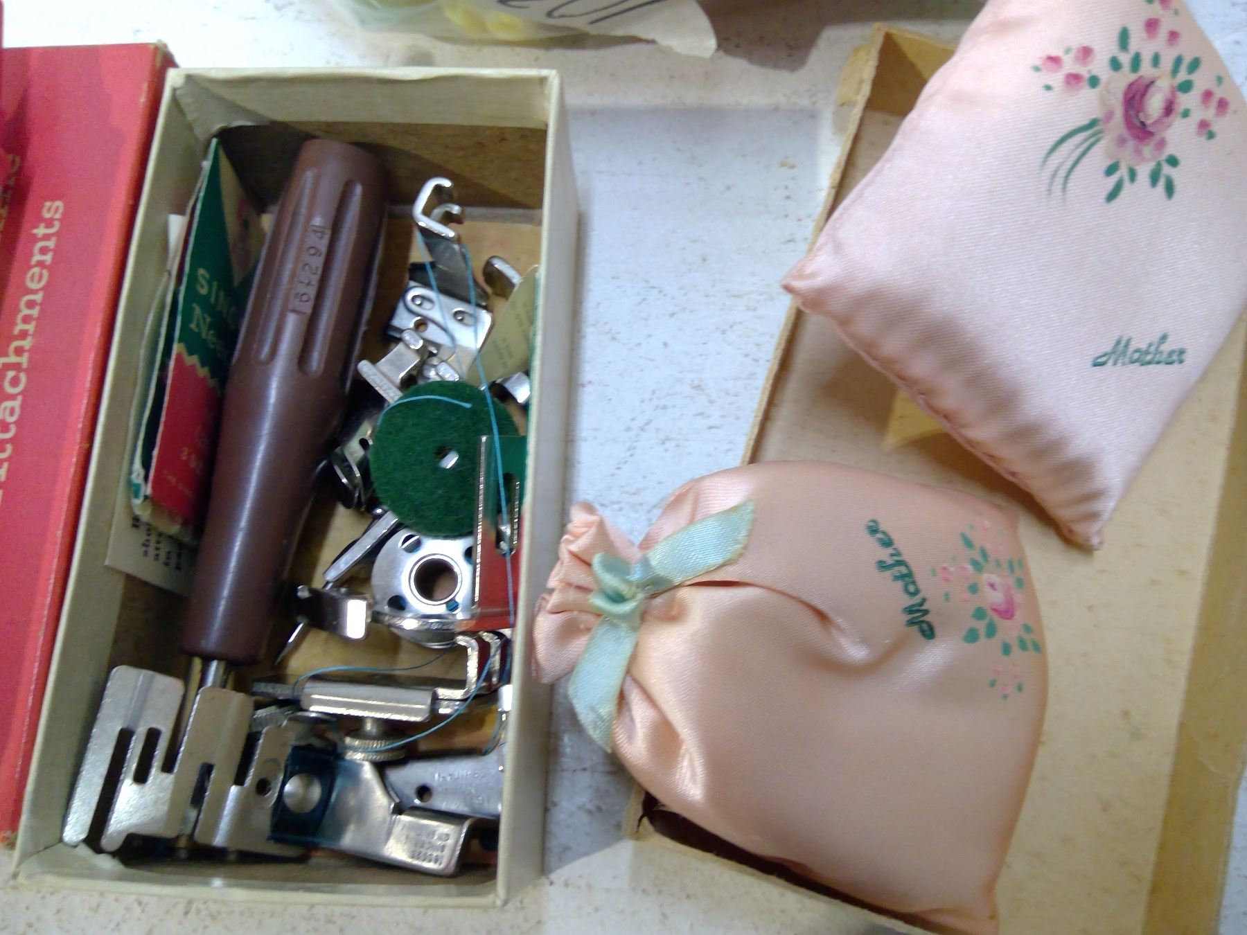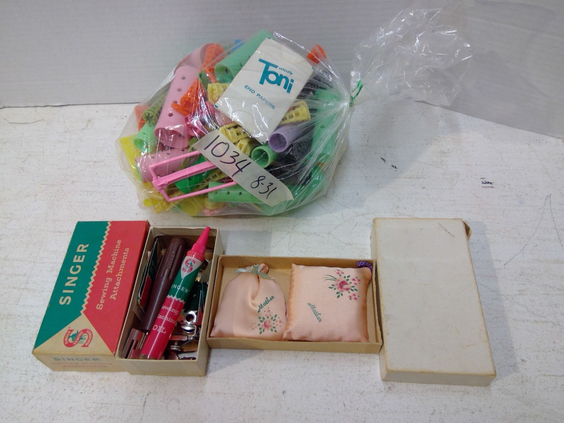 Vintage hair Curler, pincushion in a box and Sewing Machine Attachment
