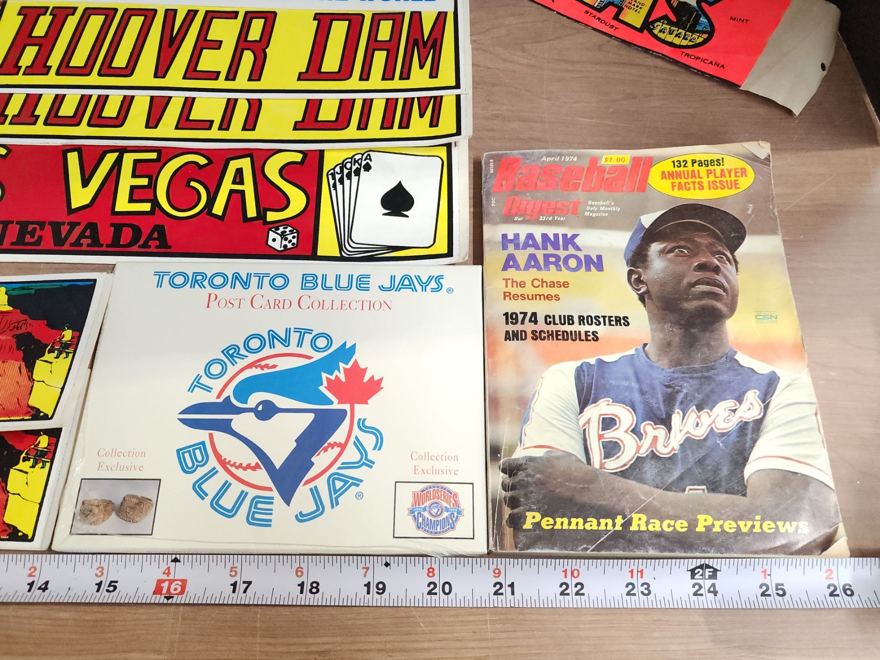Vintage items - 1974 Baseball digest, NOS 1994 Toronto Bluejays postcards, and car stickers