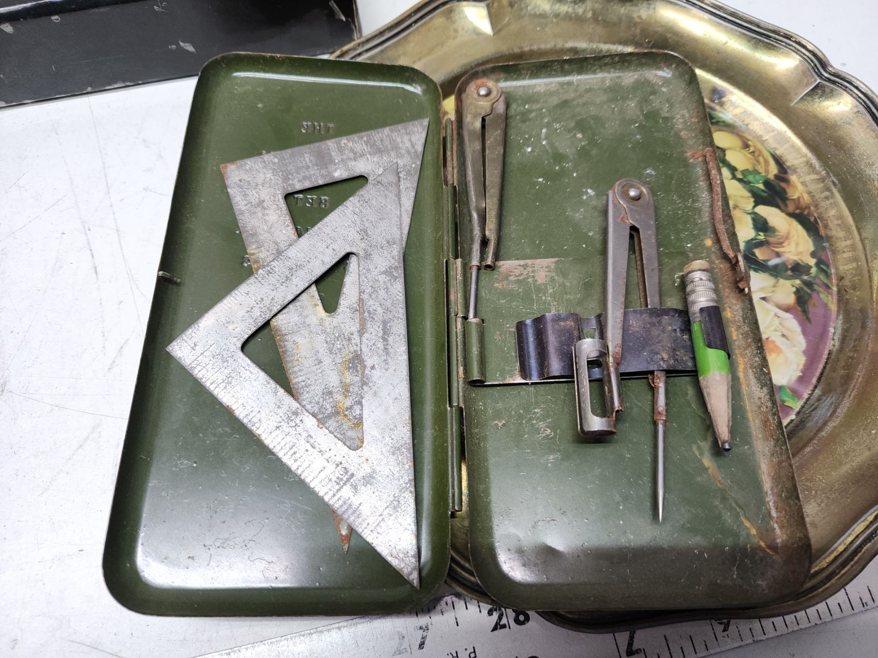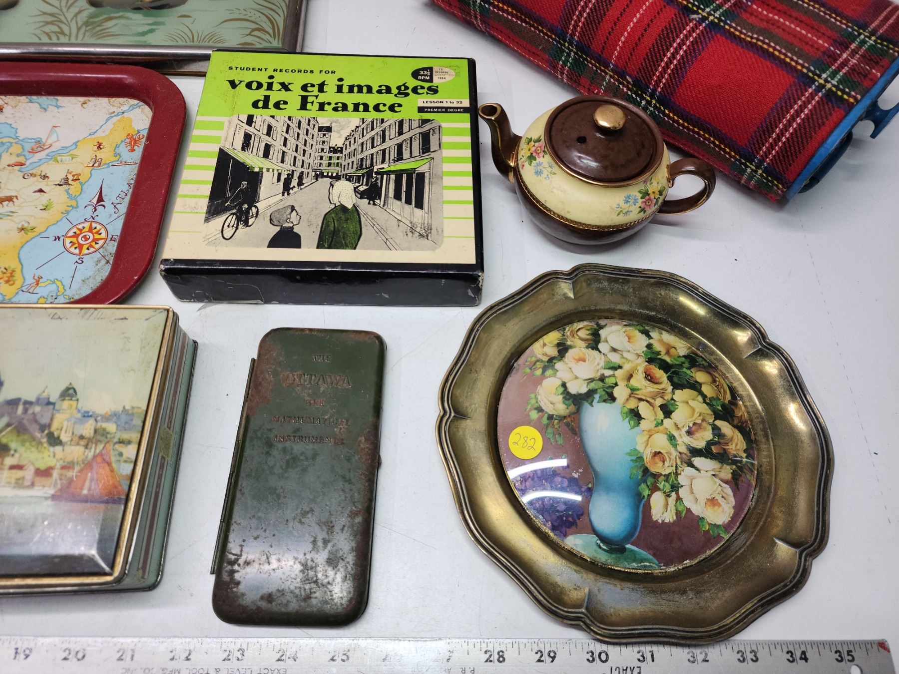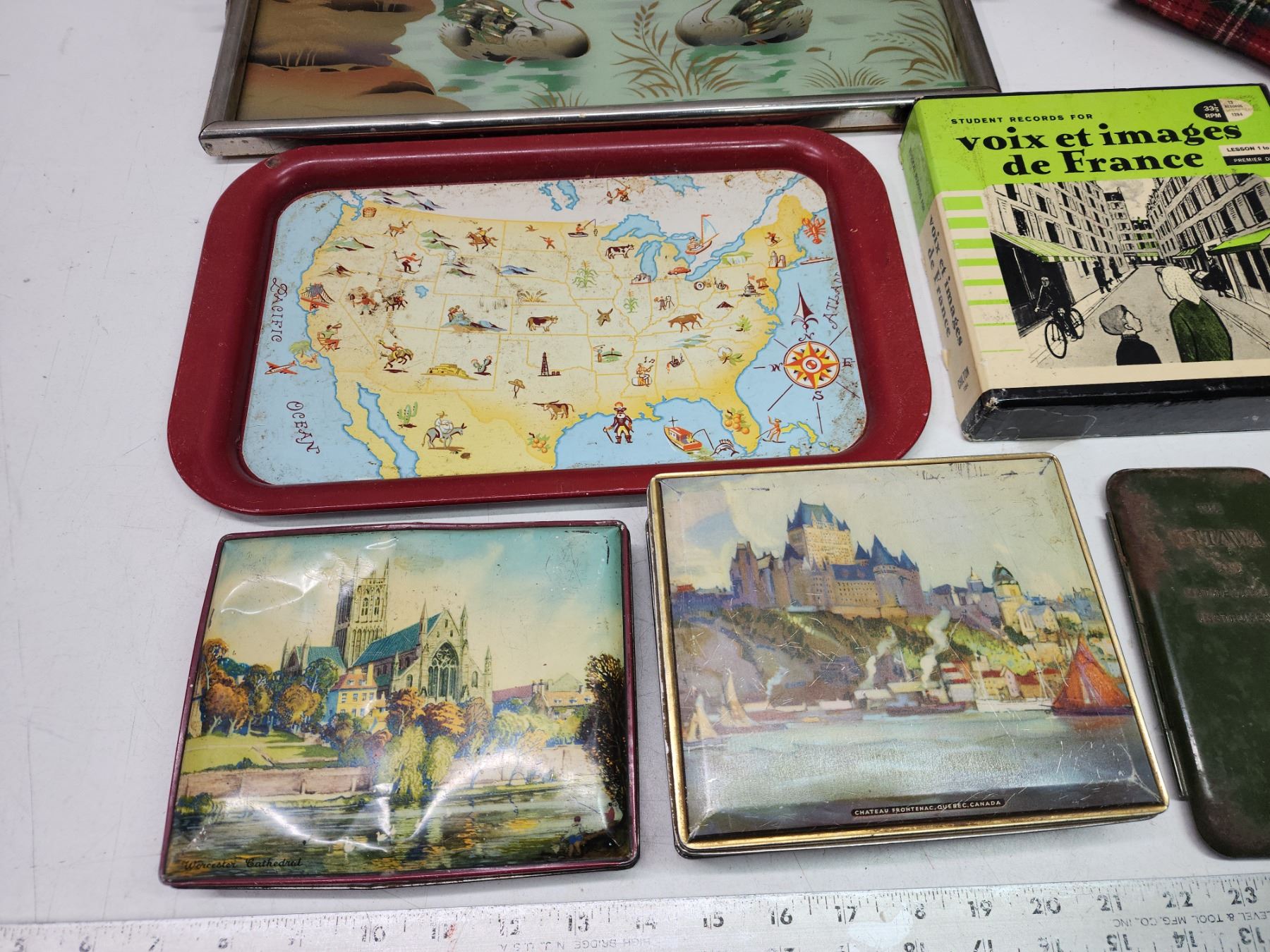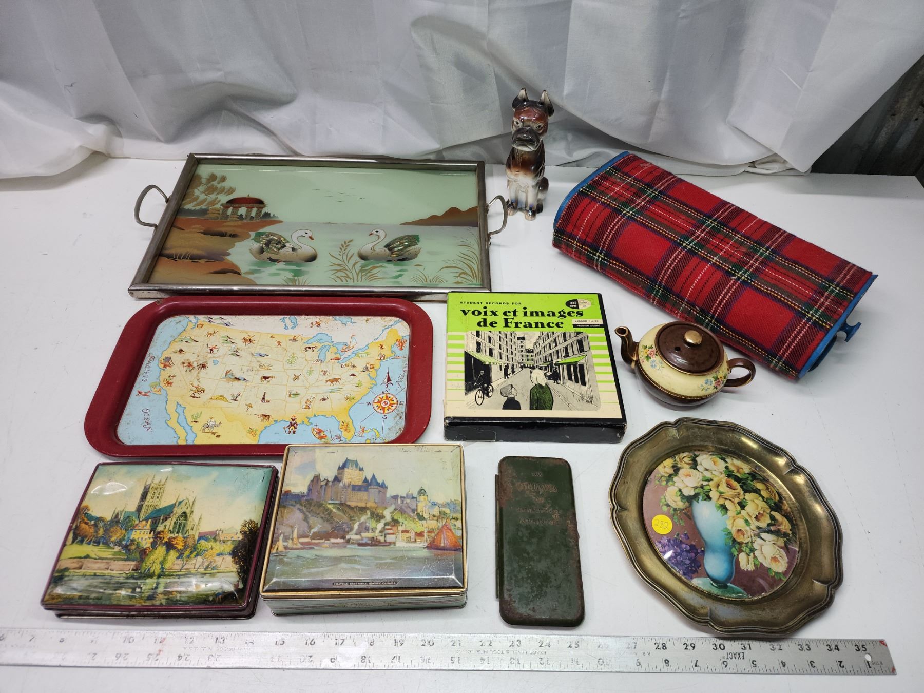 Vintage items - Tins, serving trays, flower picture, etc.