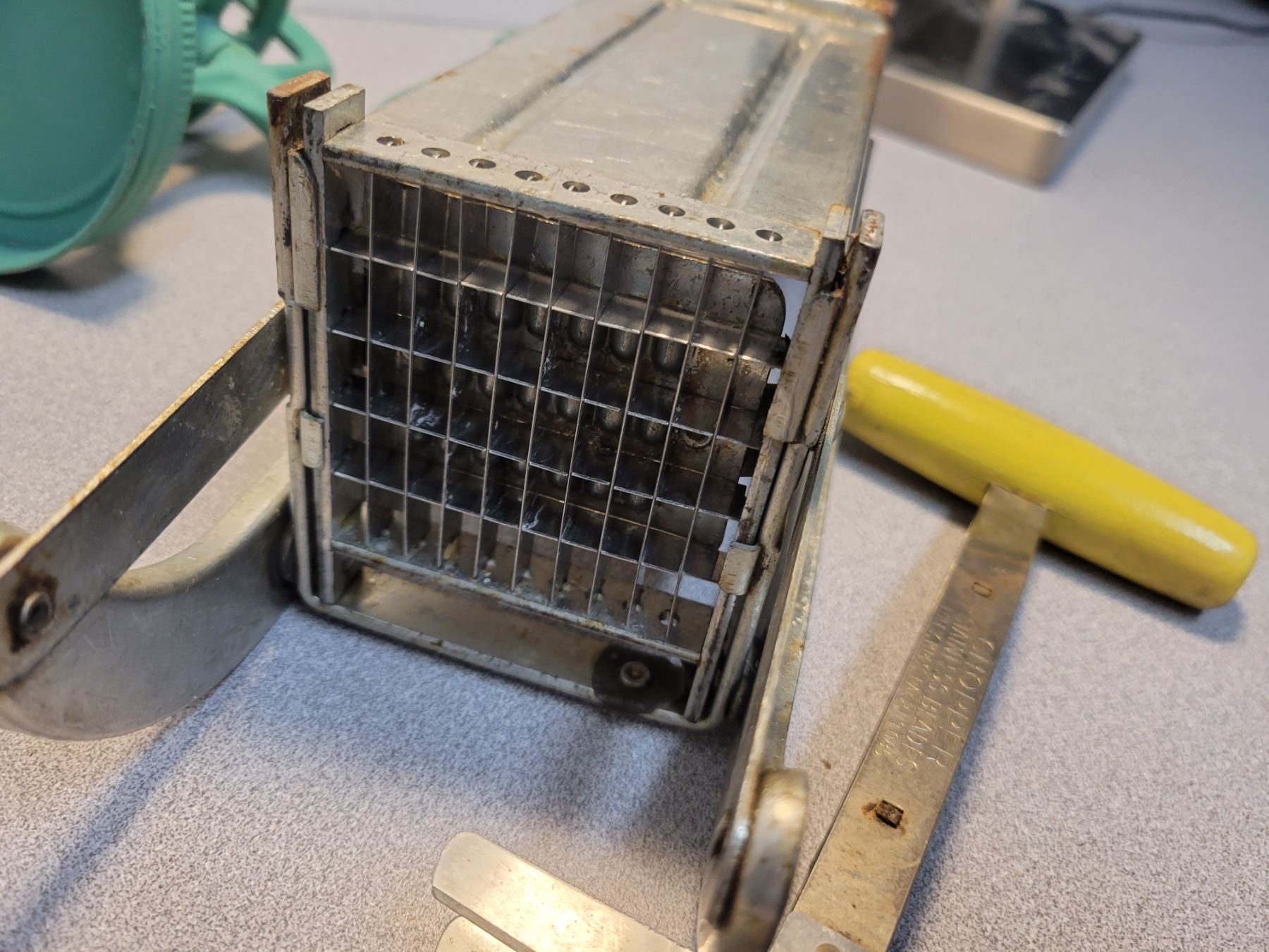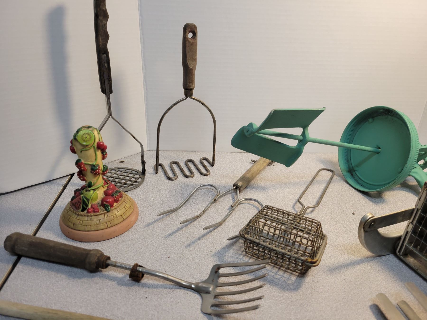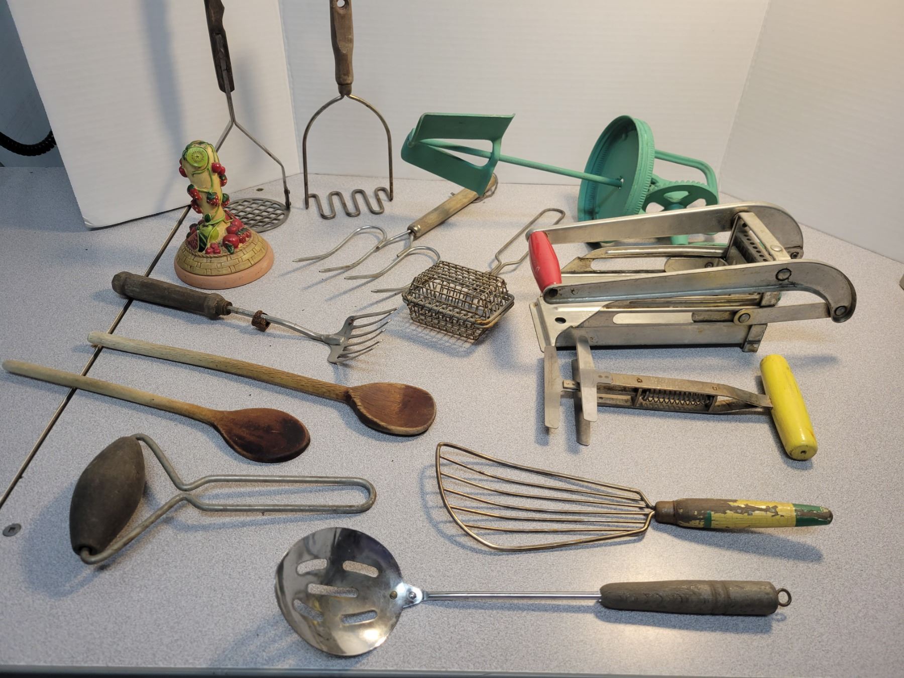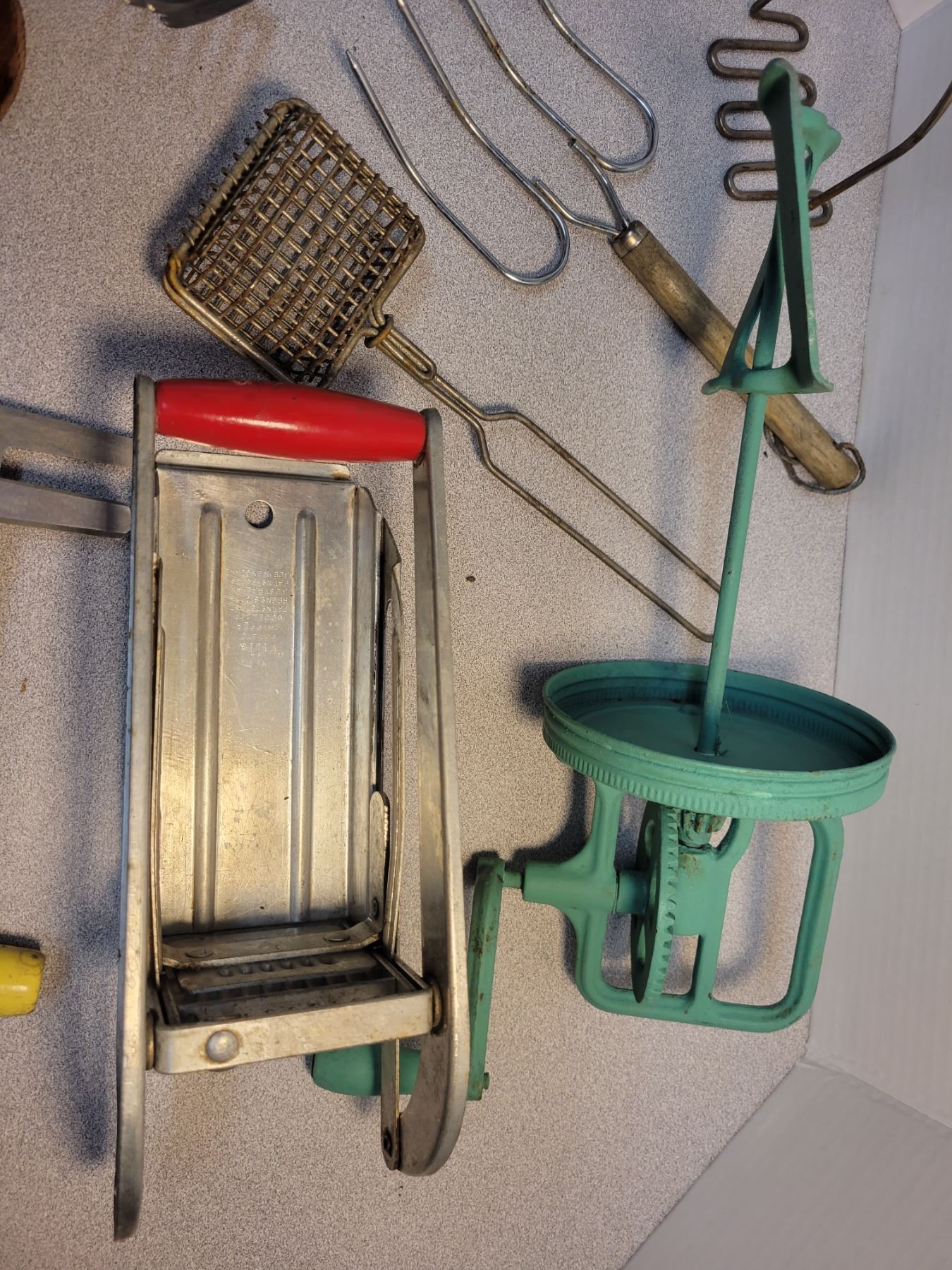Vintage kitchen utensils including butter press and potato chipper