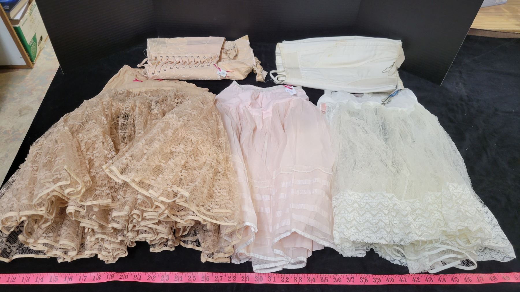 Vintage lingerie, 3 crinolines and 2 corsets, one pink, one white