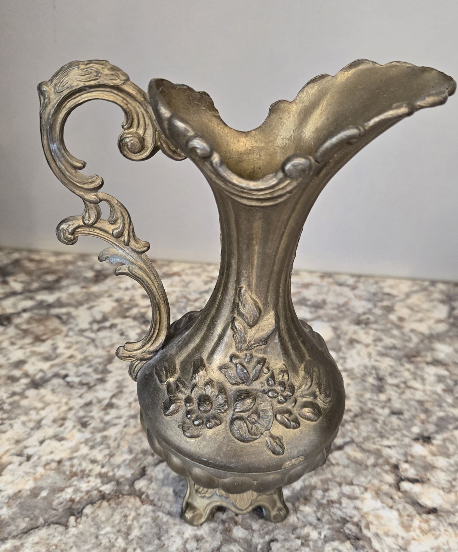 Vintage made in Italy 7" floral design footed brass pitcher/vase.