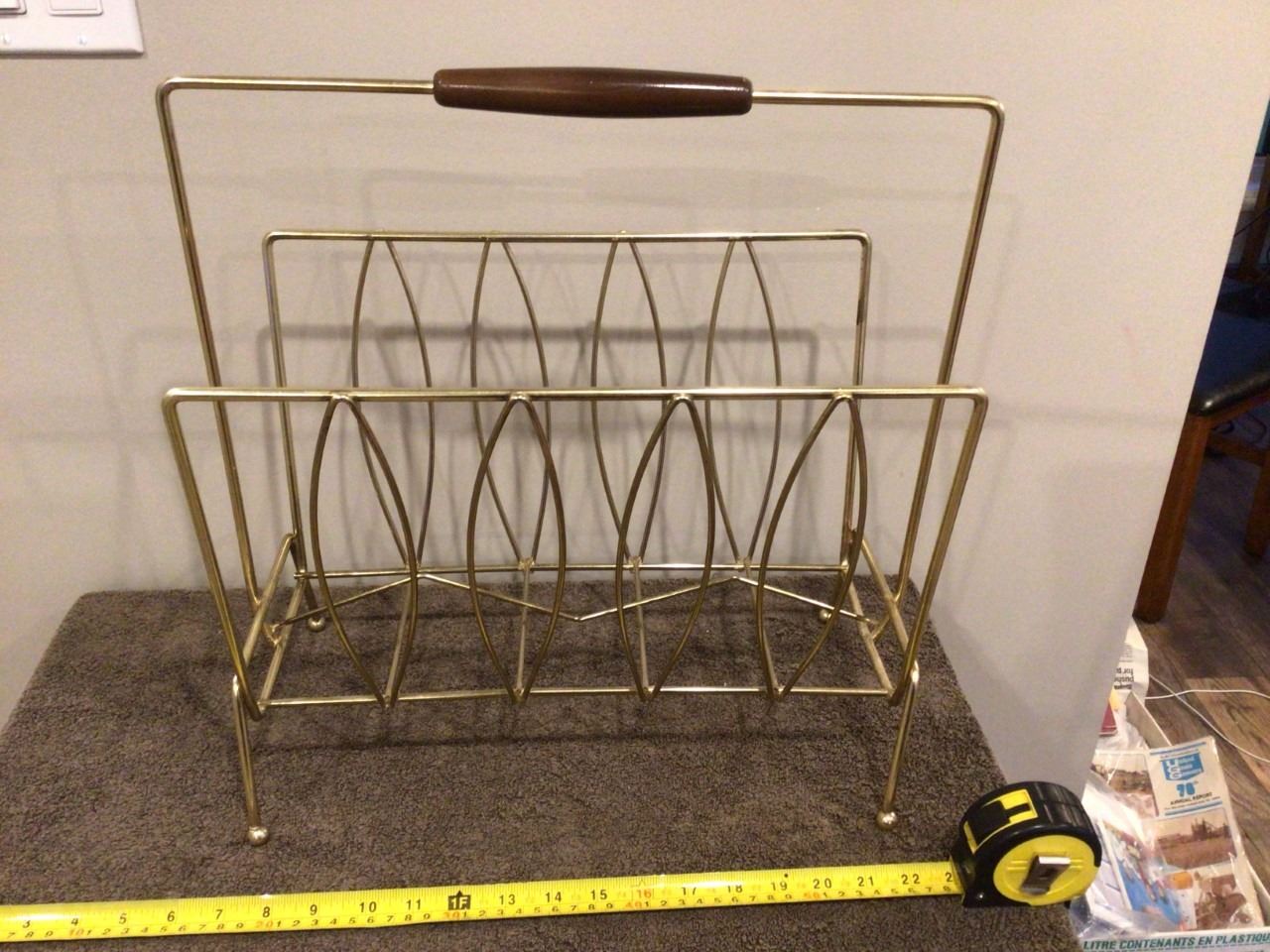 Vintage magazine rack, gold wire Mid-century. Wood handle. 16" high