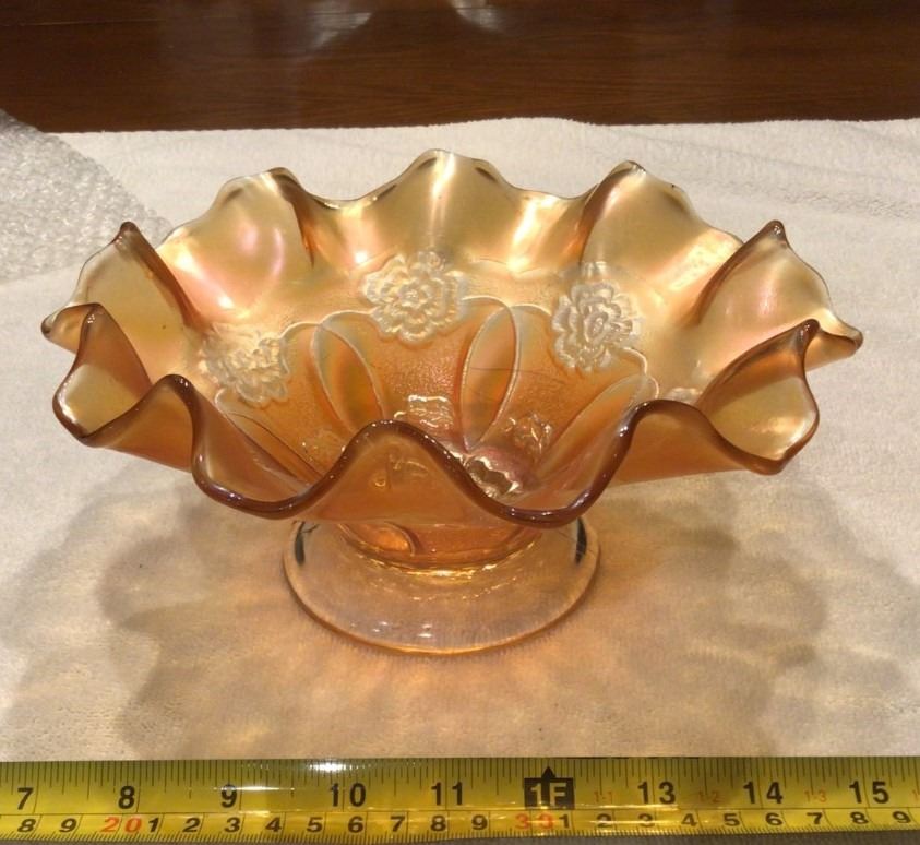 Vintage marigold carnival glass bowl with fluted edge. 8"