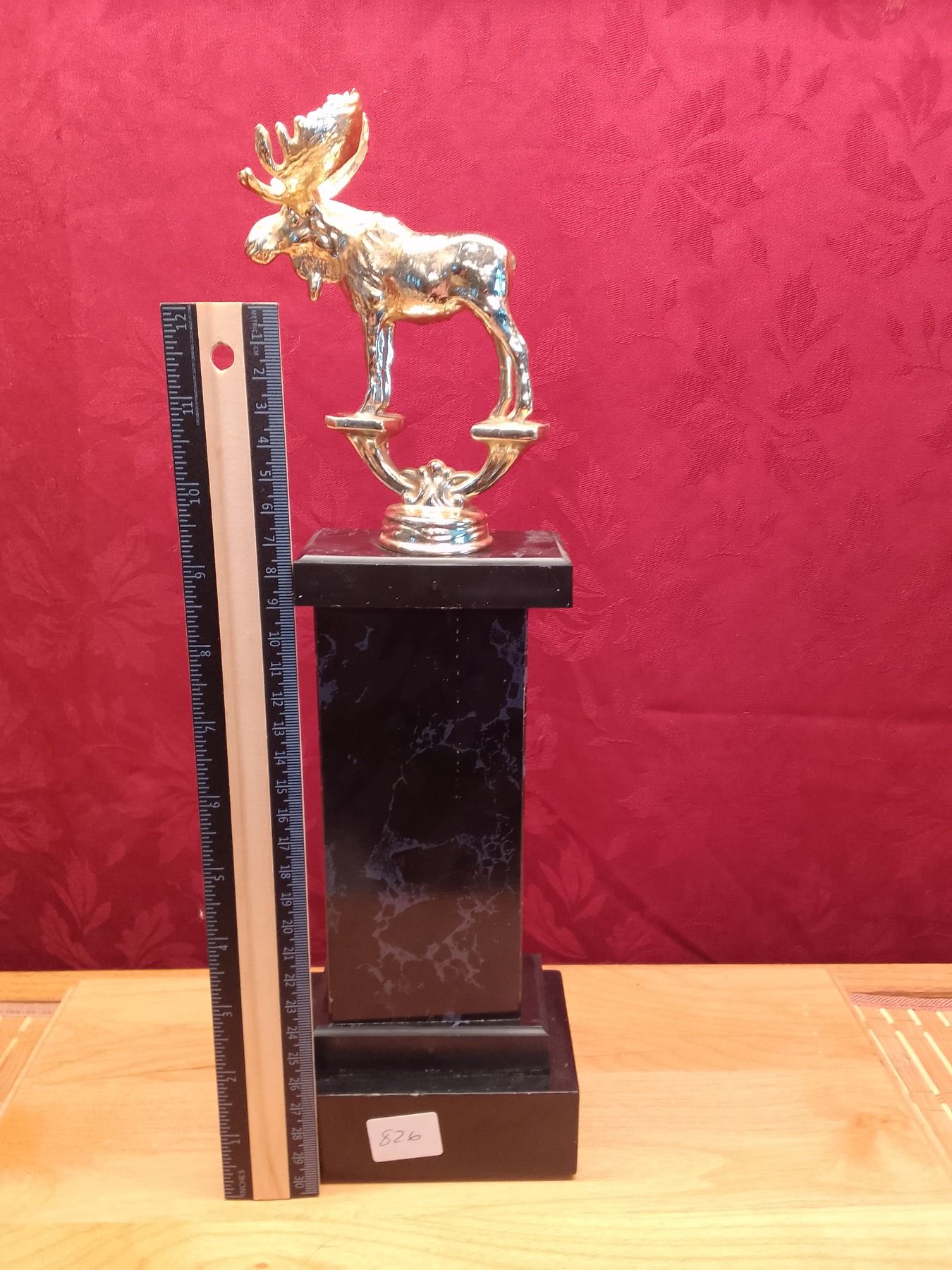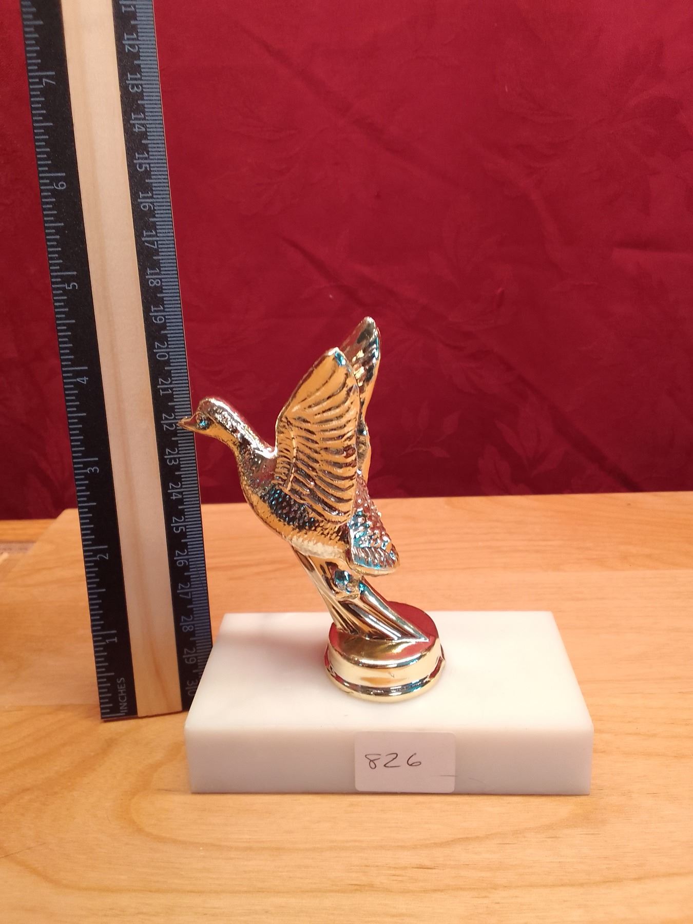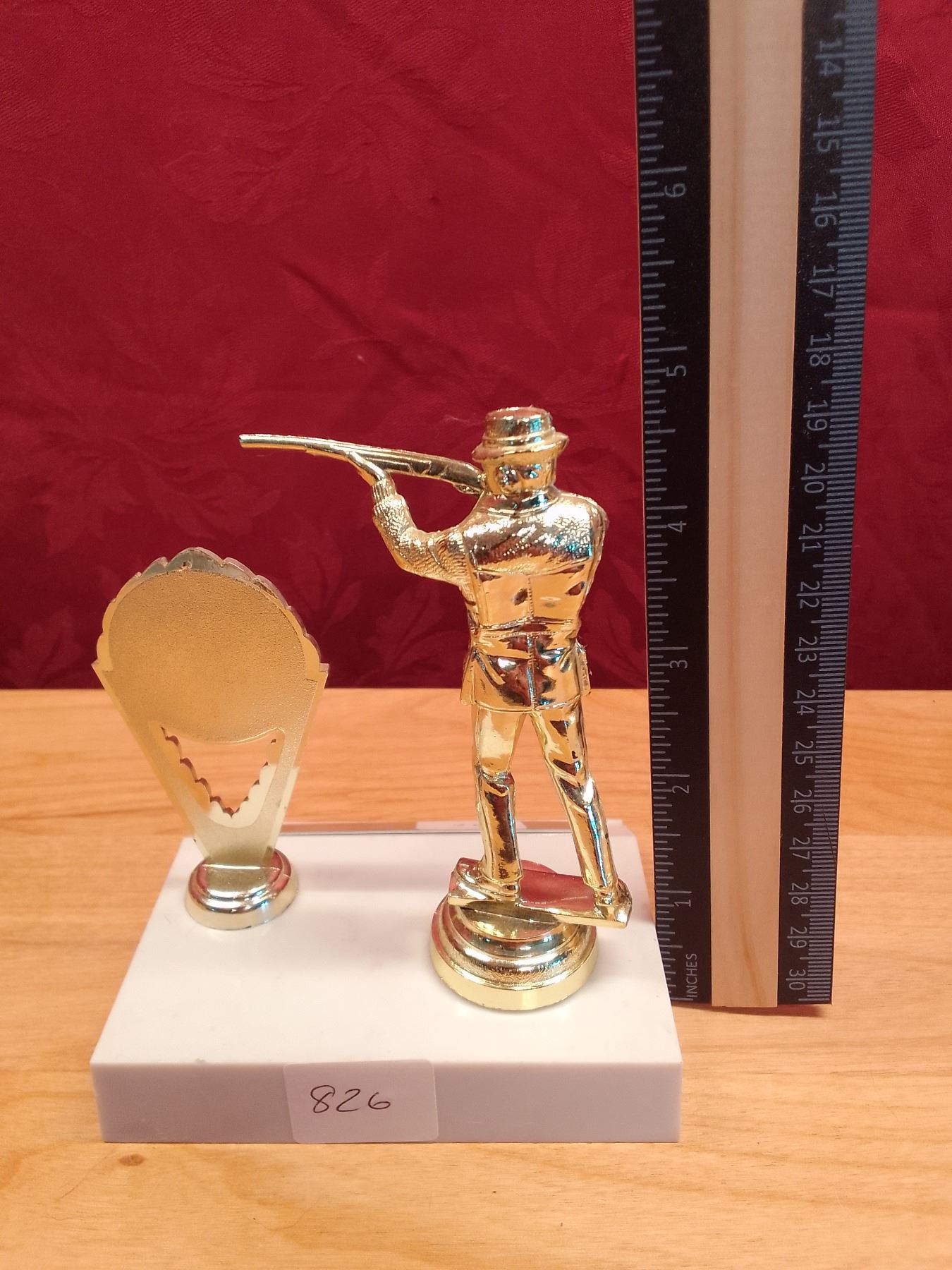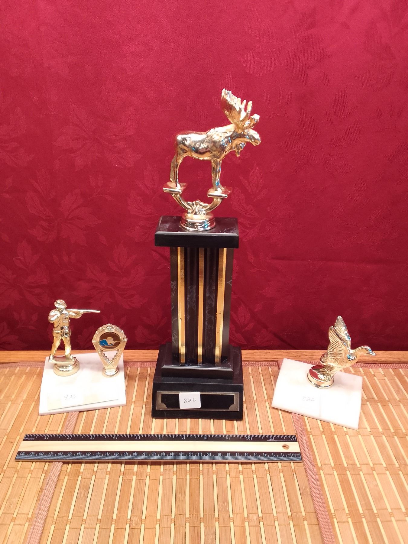 Vintage metal Hunting Trophy Toppers: Moose, Duck, Rifleman & Column - Lot of vintage gold-tone trophy figures ideal for custom awards or decor: tall moose topper on black/gold column, flying duck, rifleman shooter, and small wreath insert. Perfect for hunting enthusiasts or trophy builders.