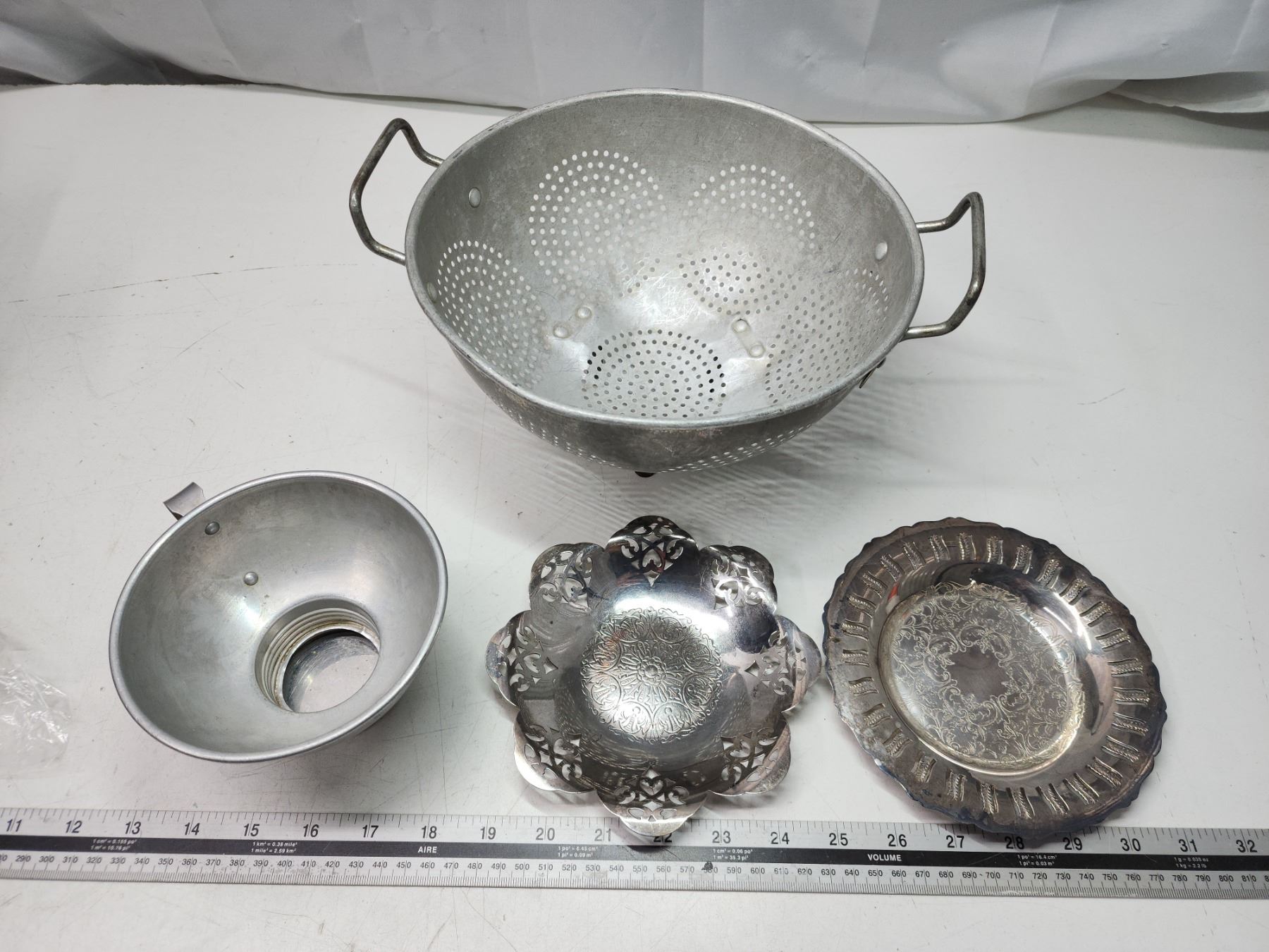 Vintage metal collander, sifter and plates