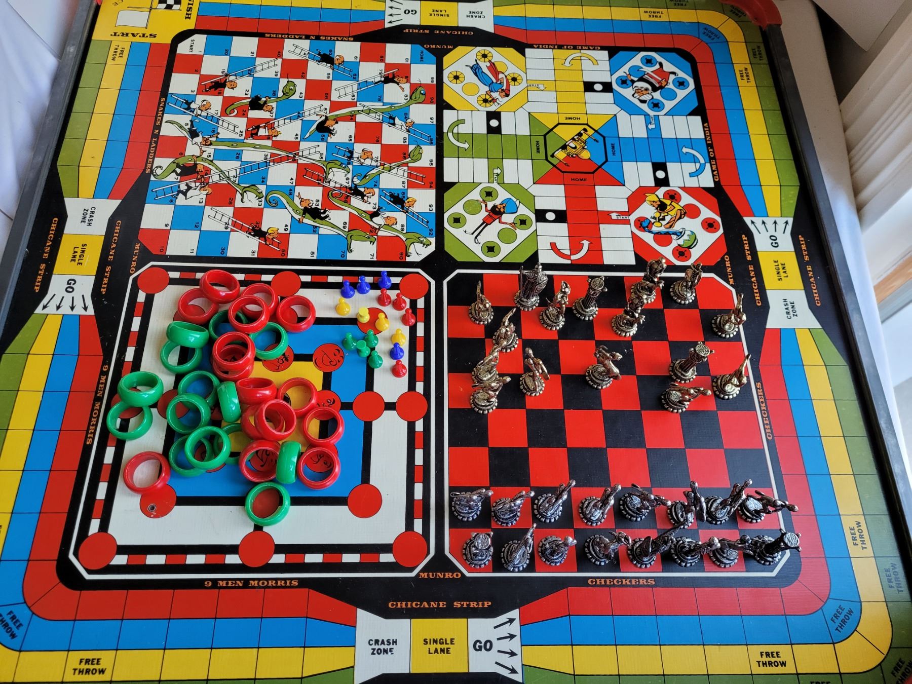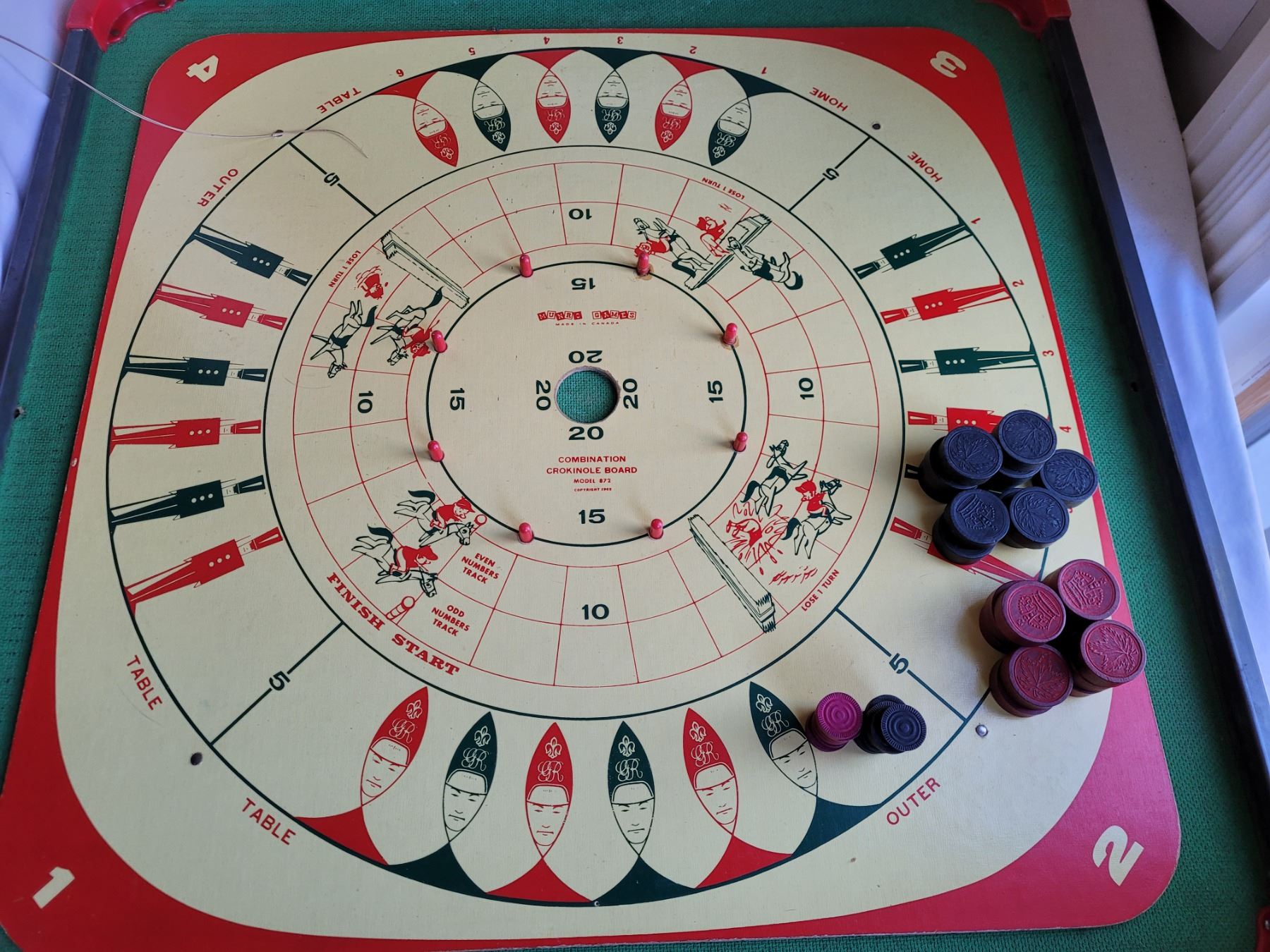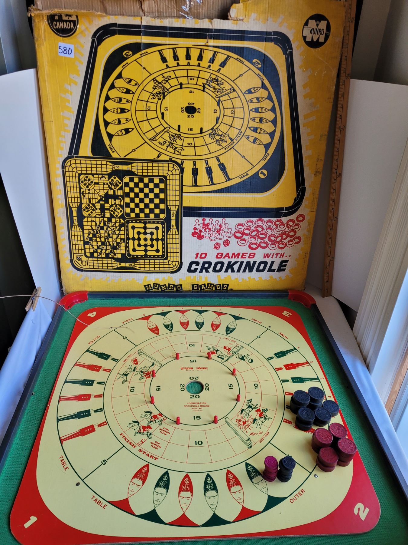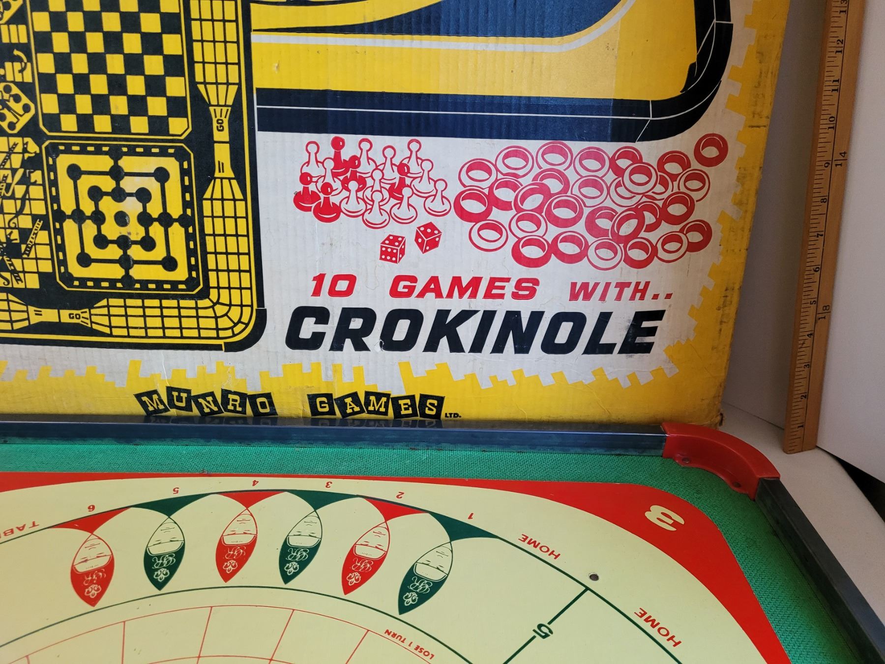 Vintage metal edged Crokinole board+10 games on reverse. Wood, metal, plastic game pieces.