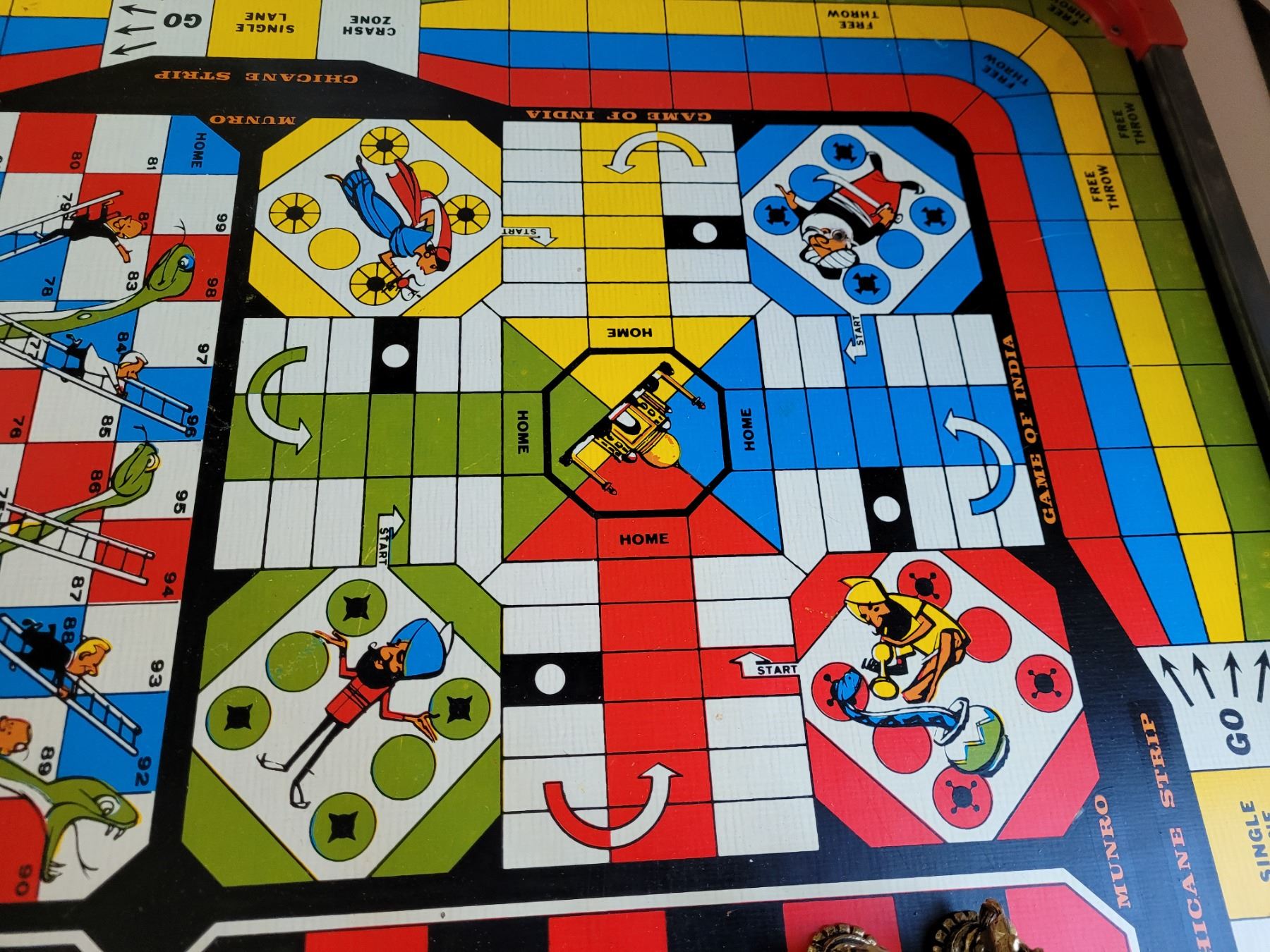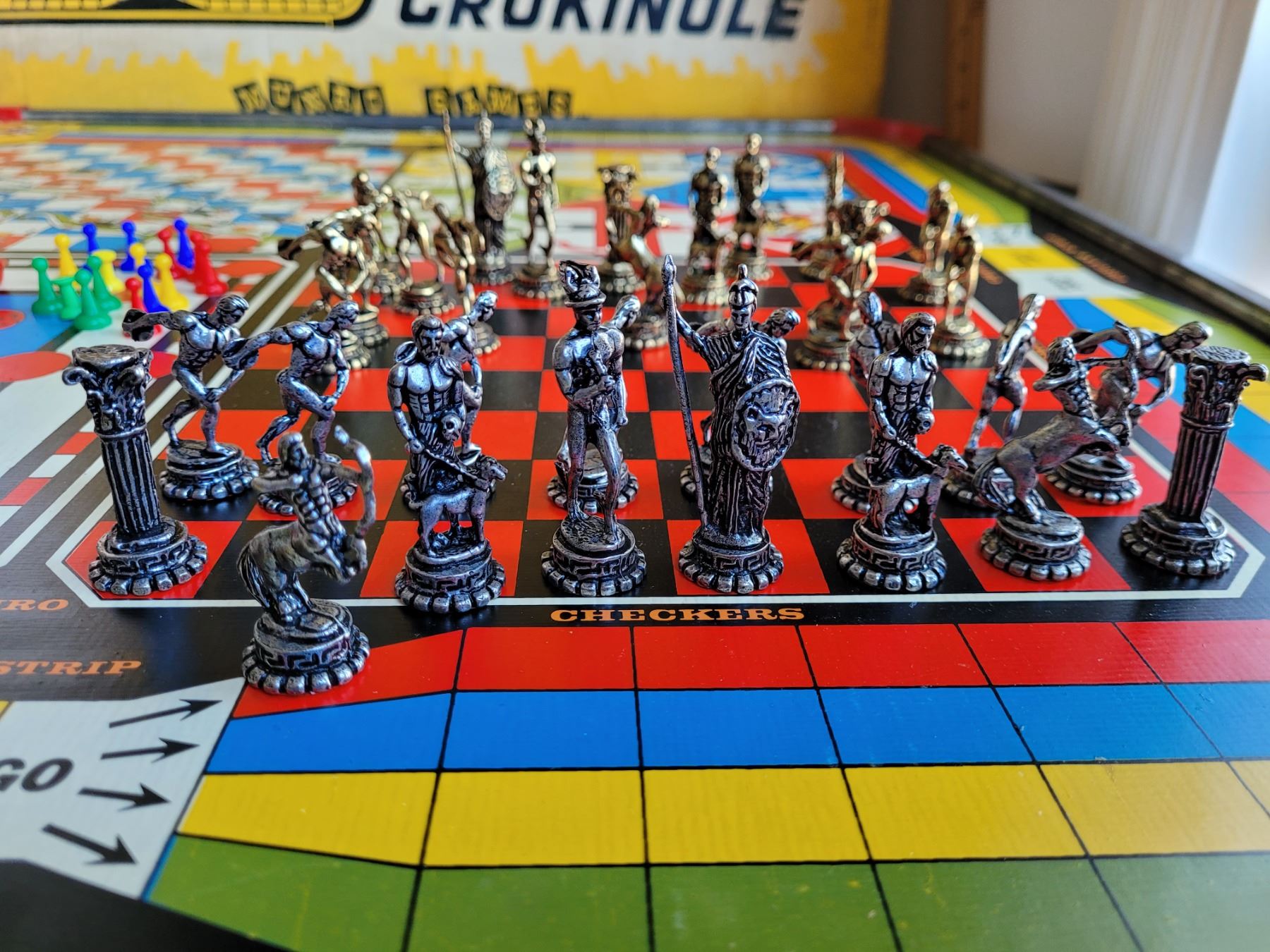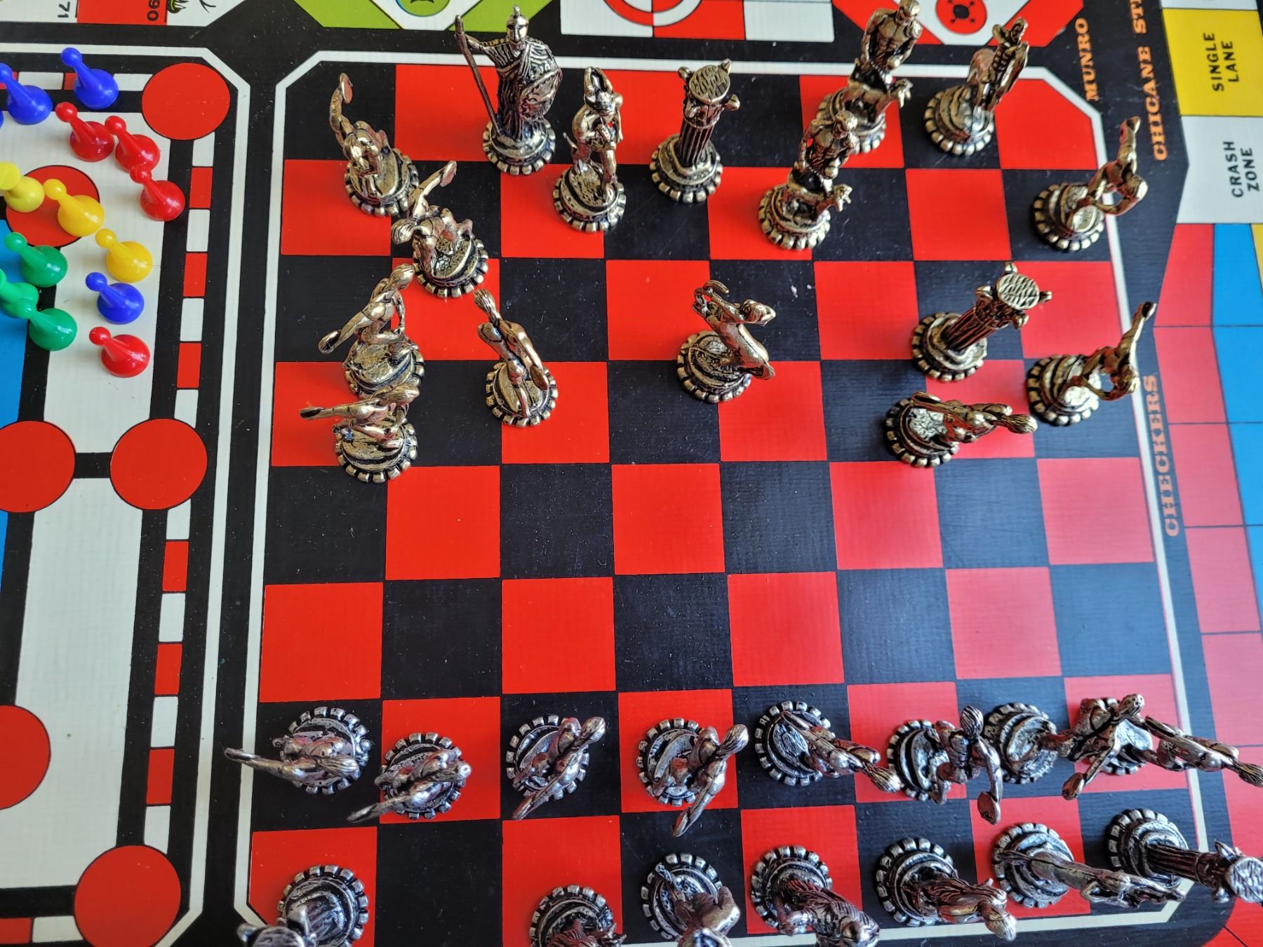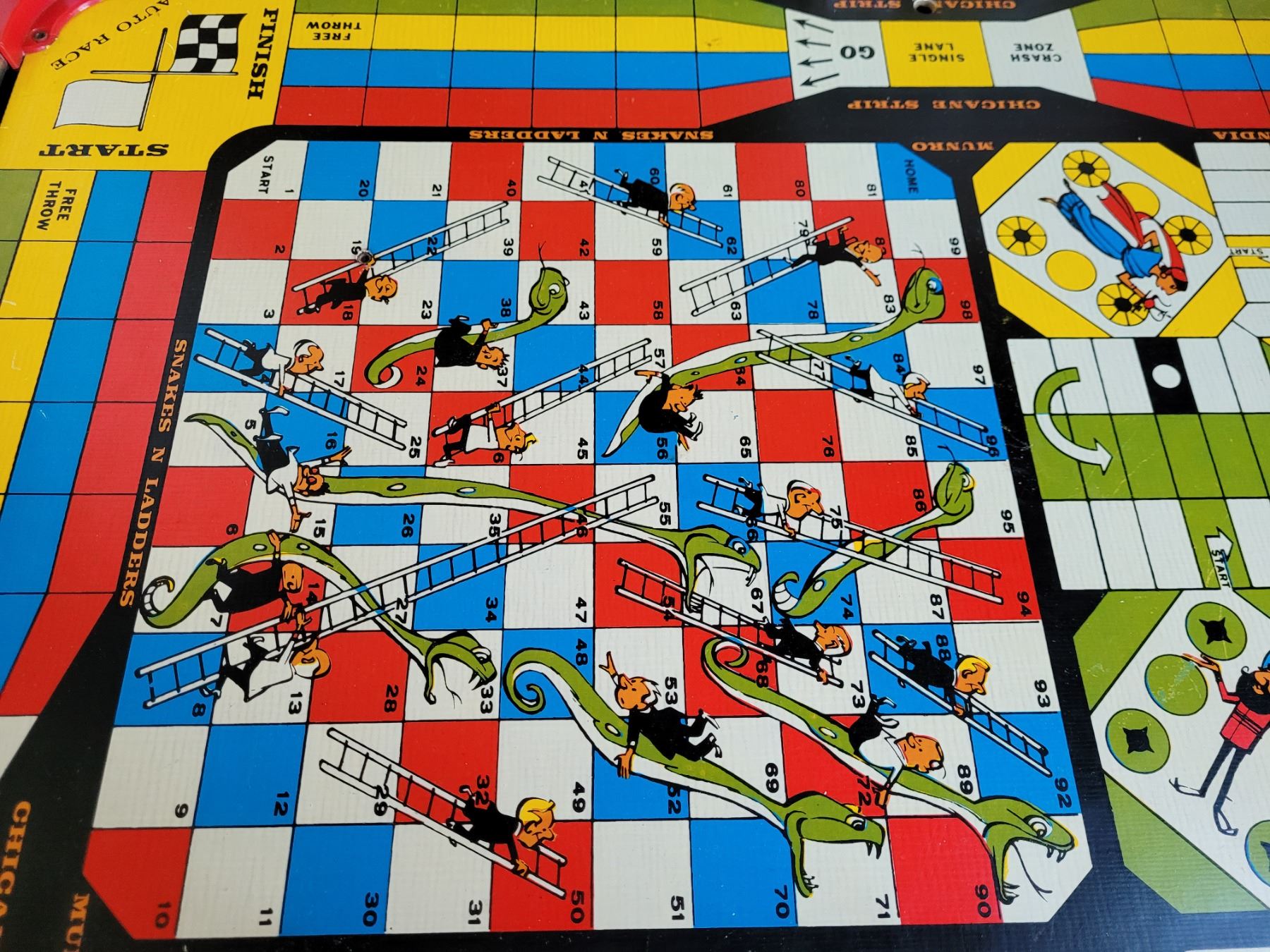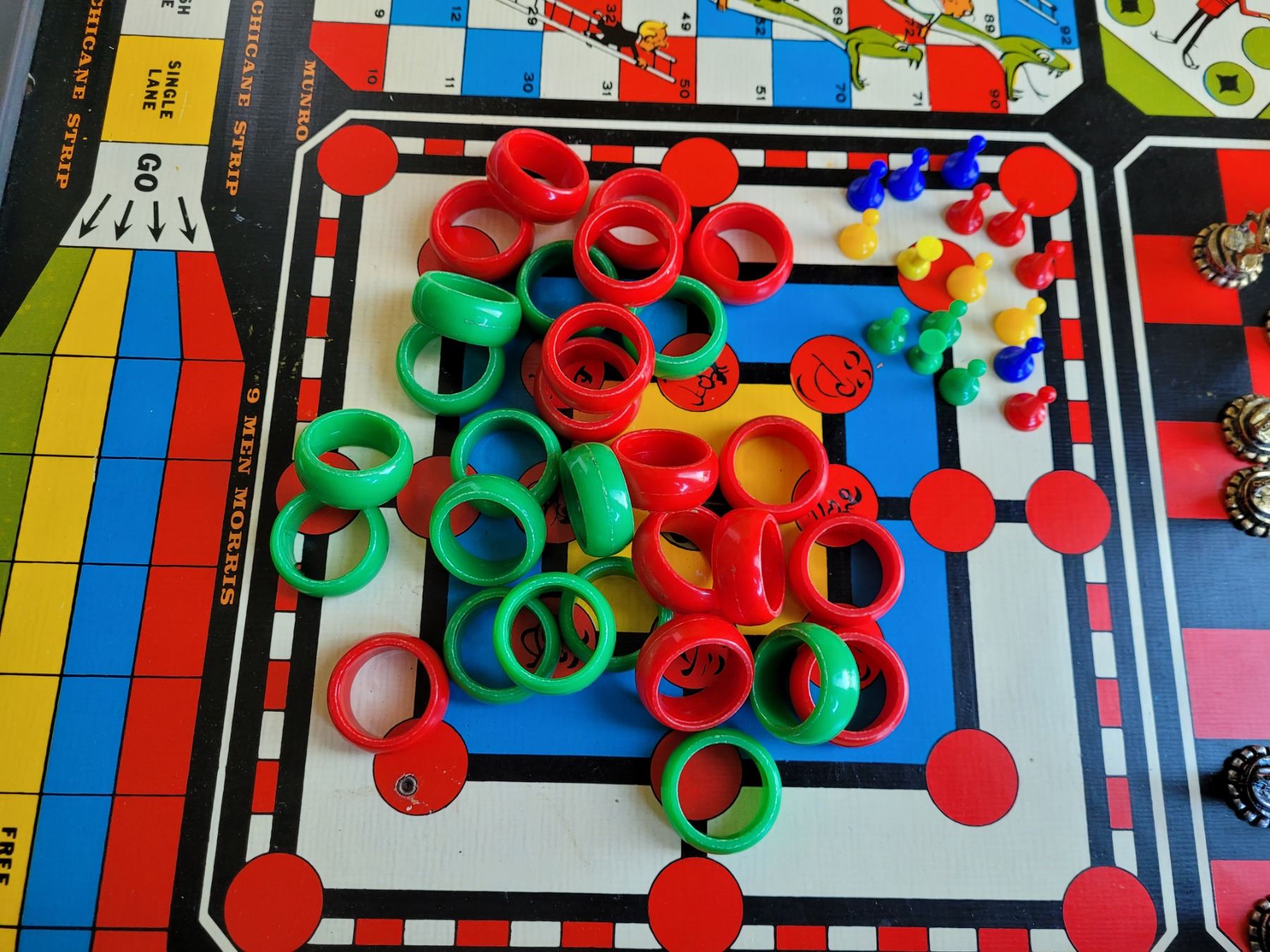 Vintage metal edged Crokinole board+10 games on reverse. Wood, metal, plastic game pieces.