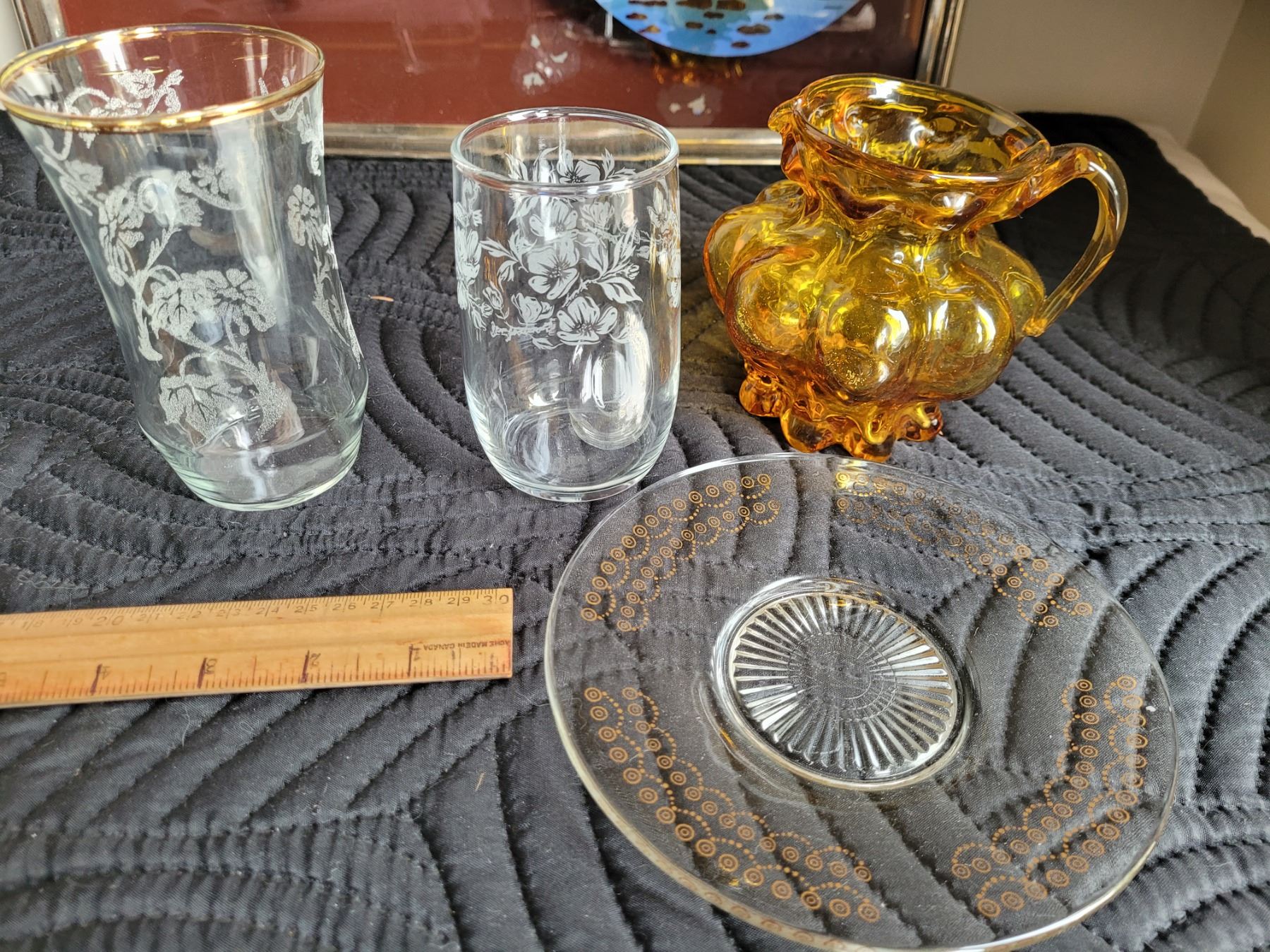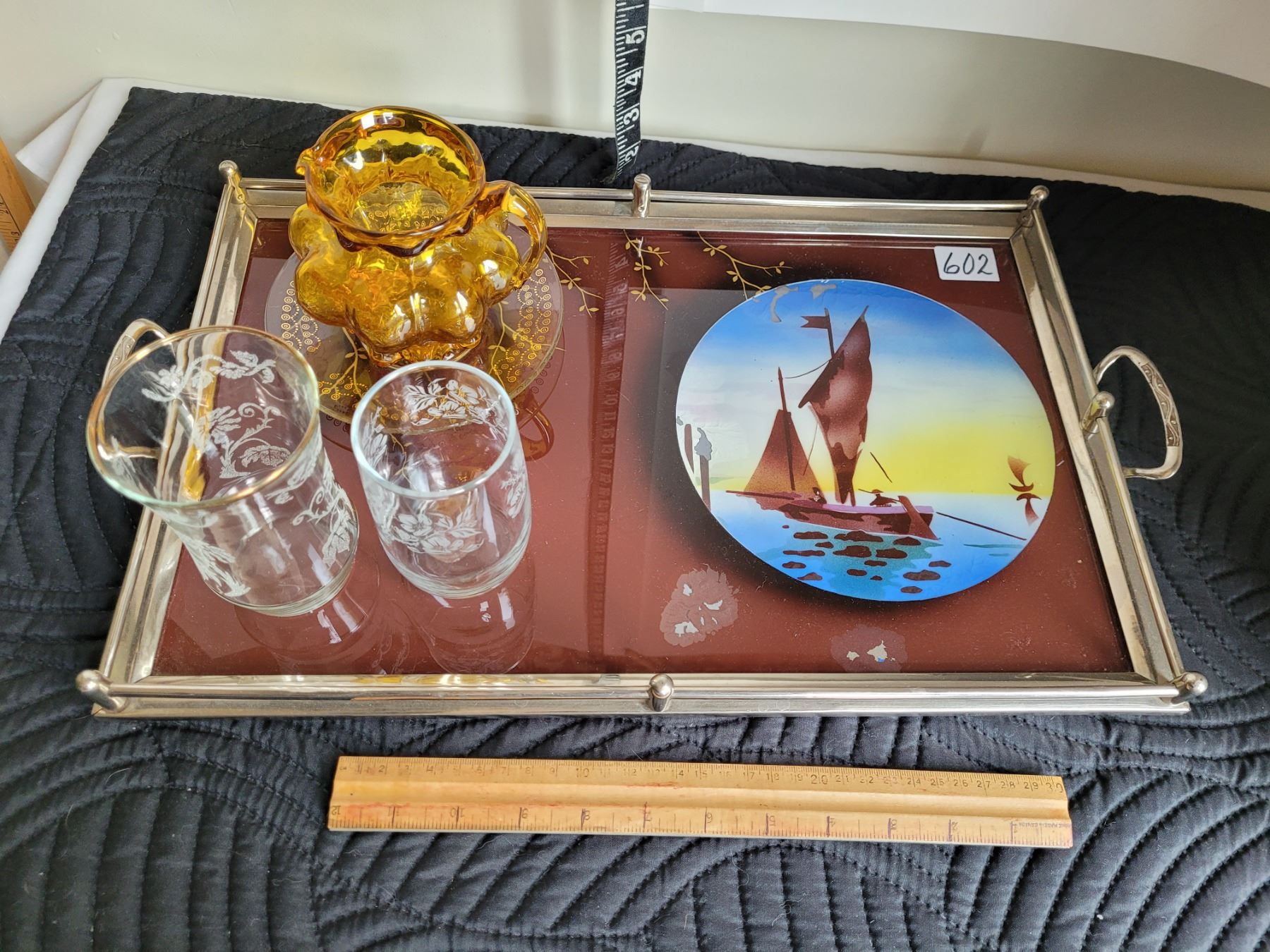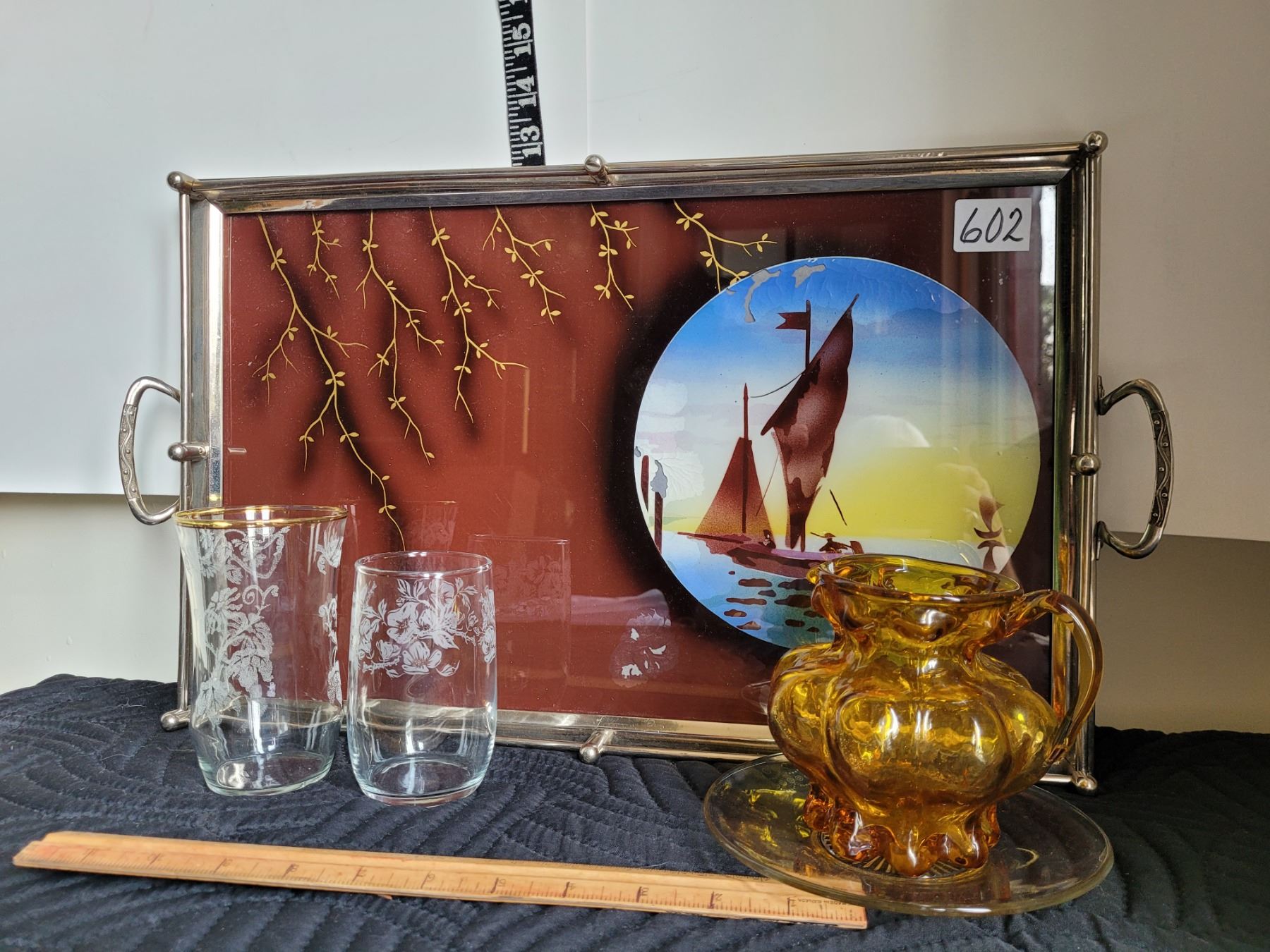 Vintage metal rim, glass top tray, etched glasses, amber creamer
