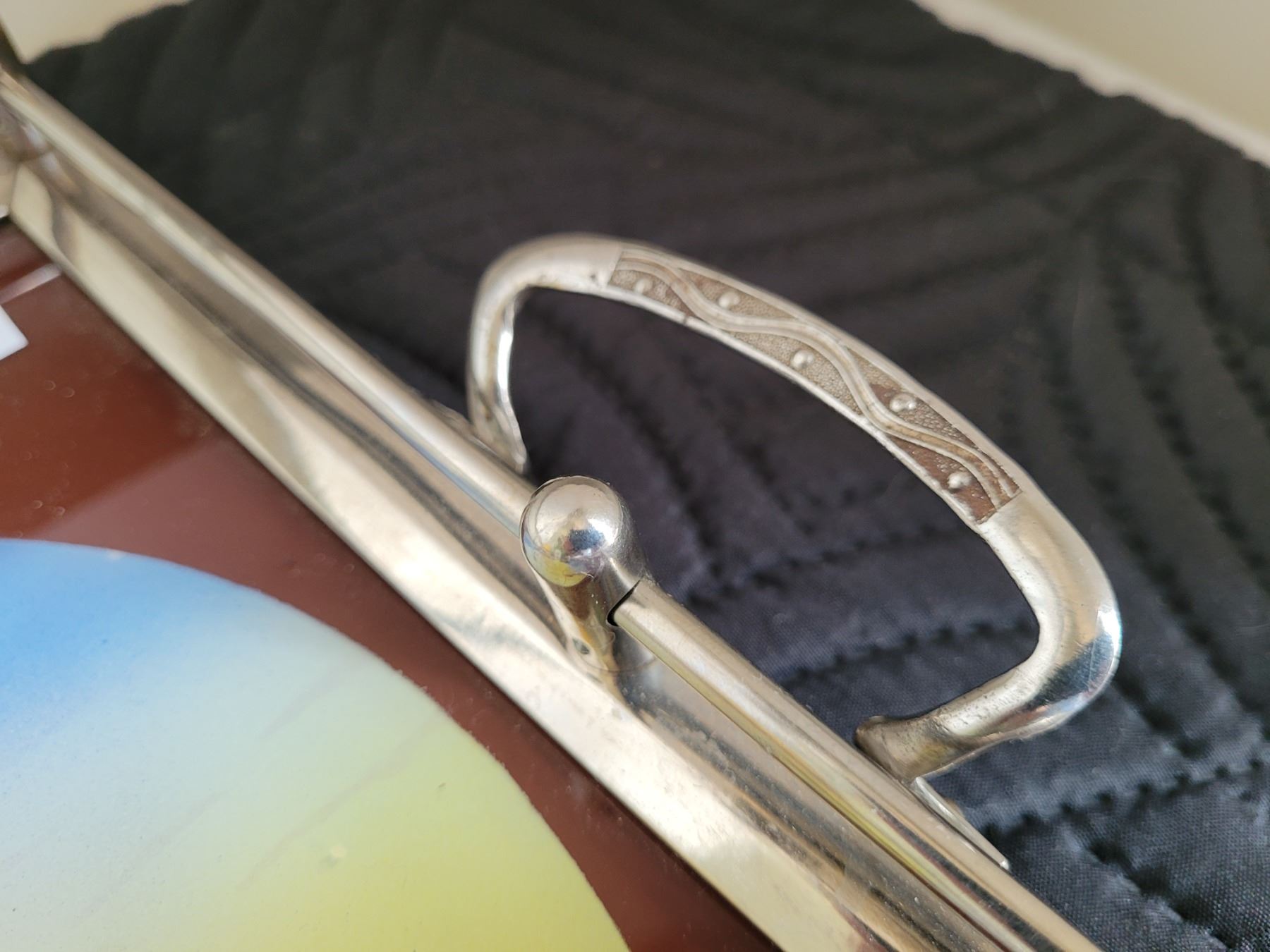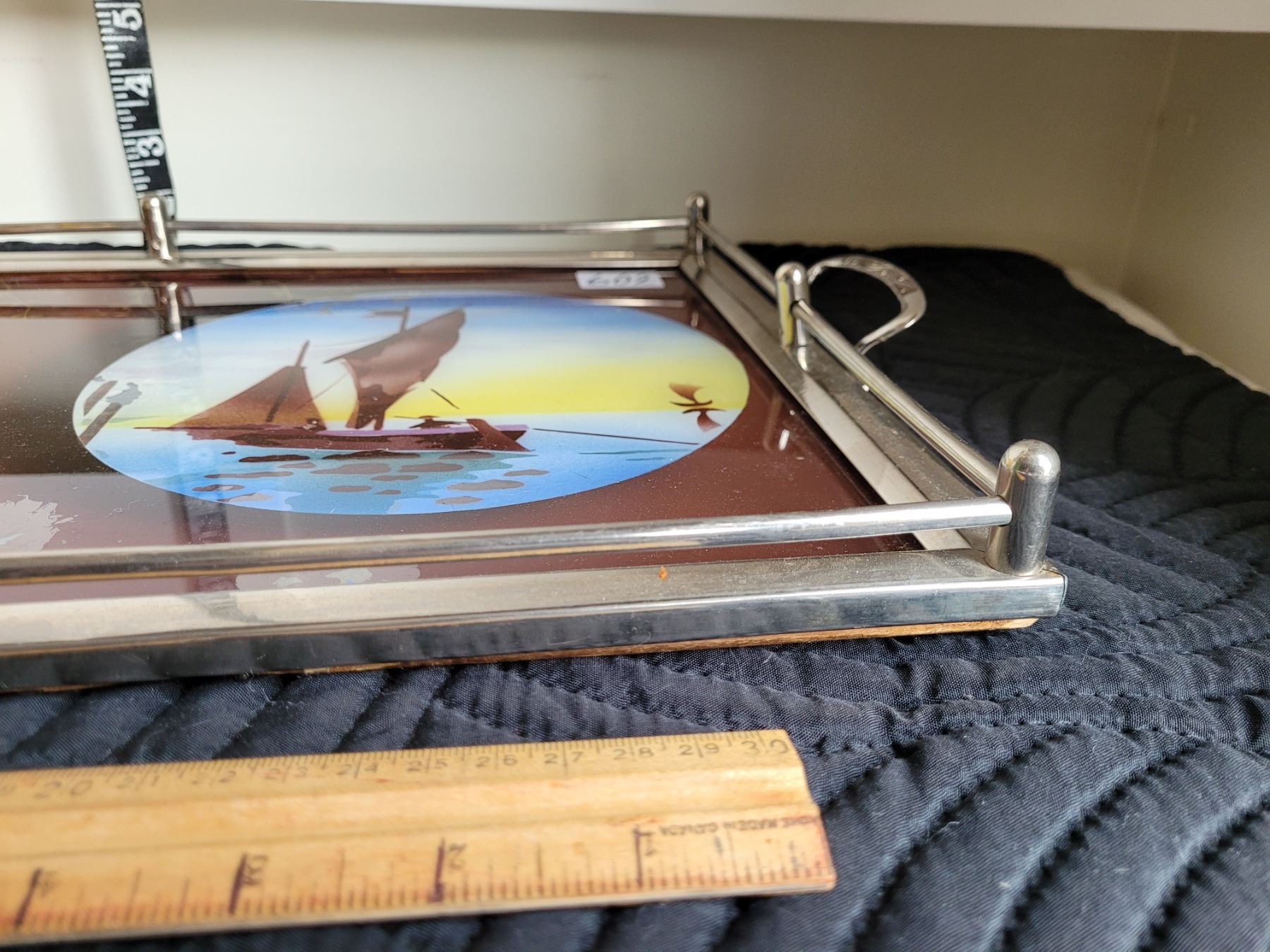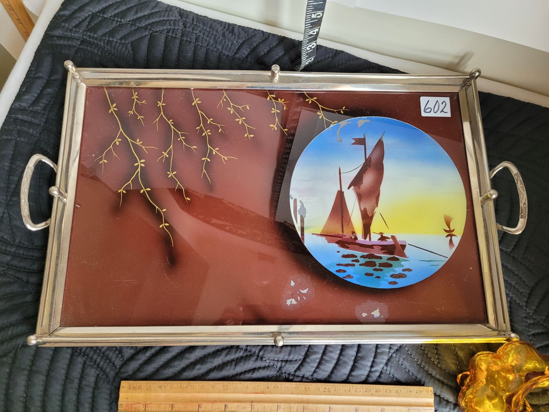 Vintage metal rim, glass top tray, etched glasses, amber creamer
