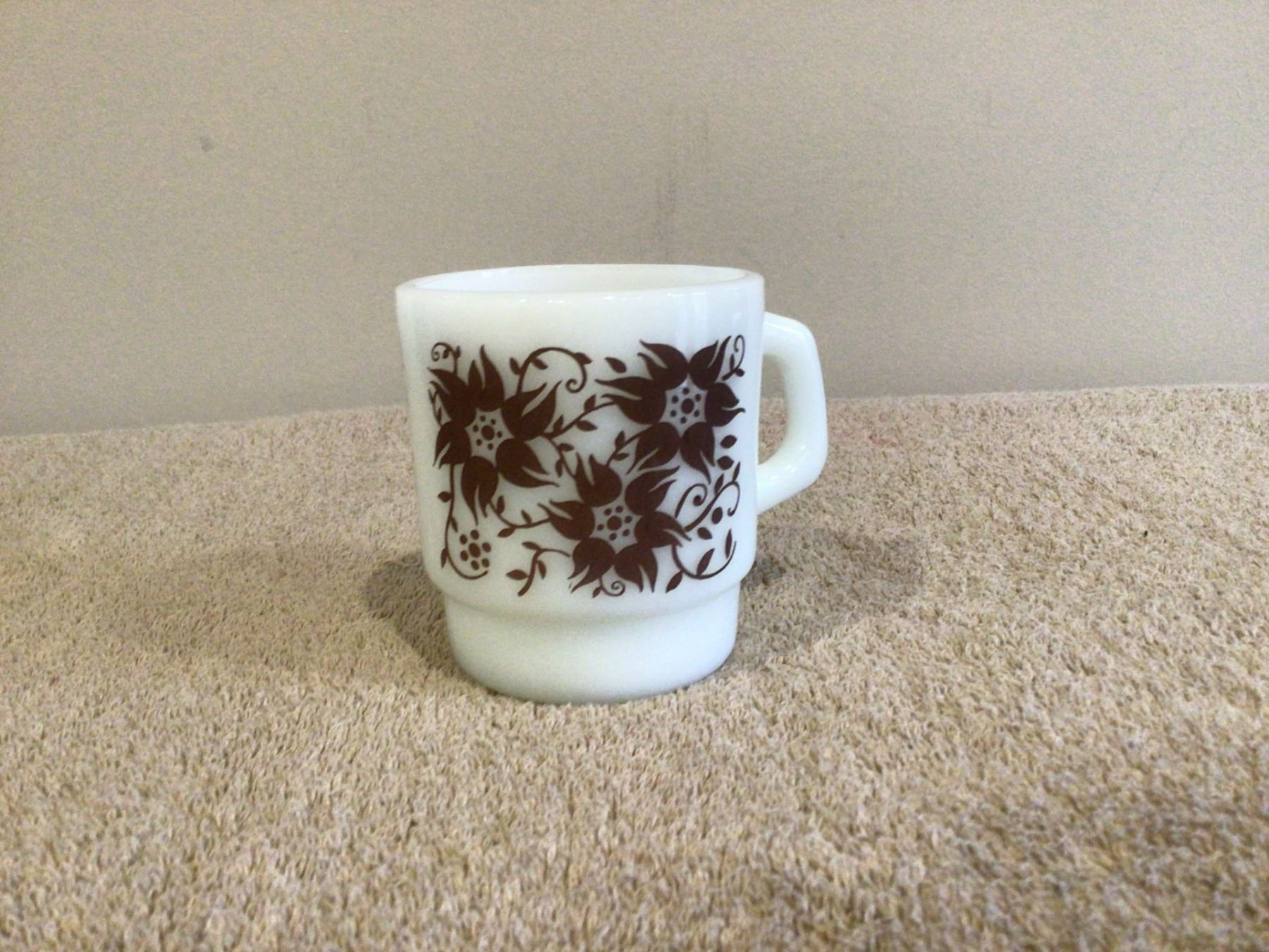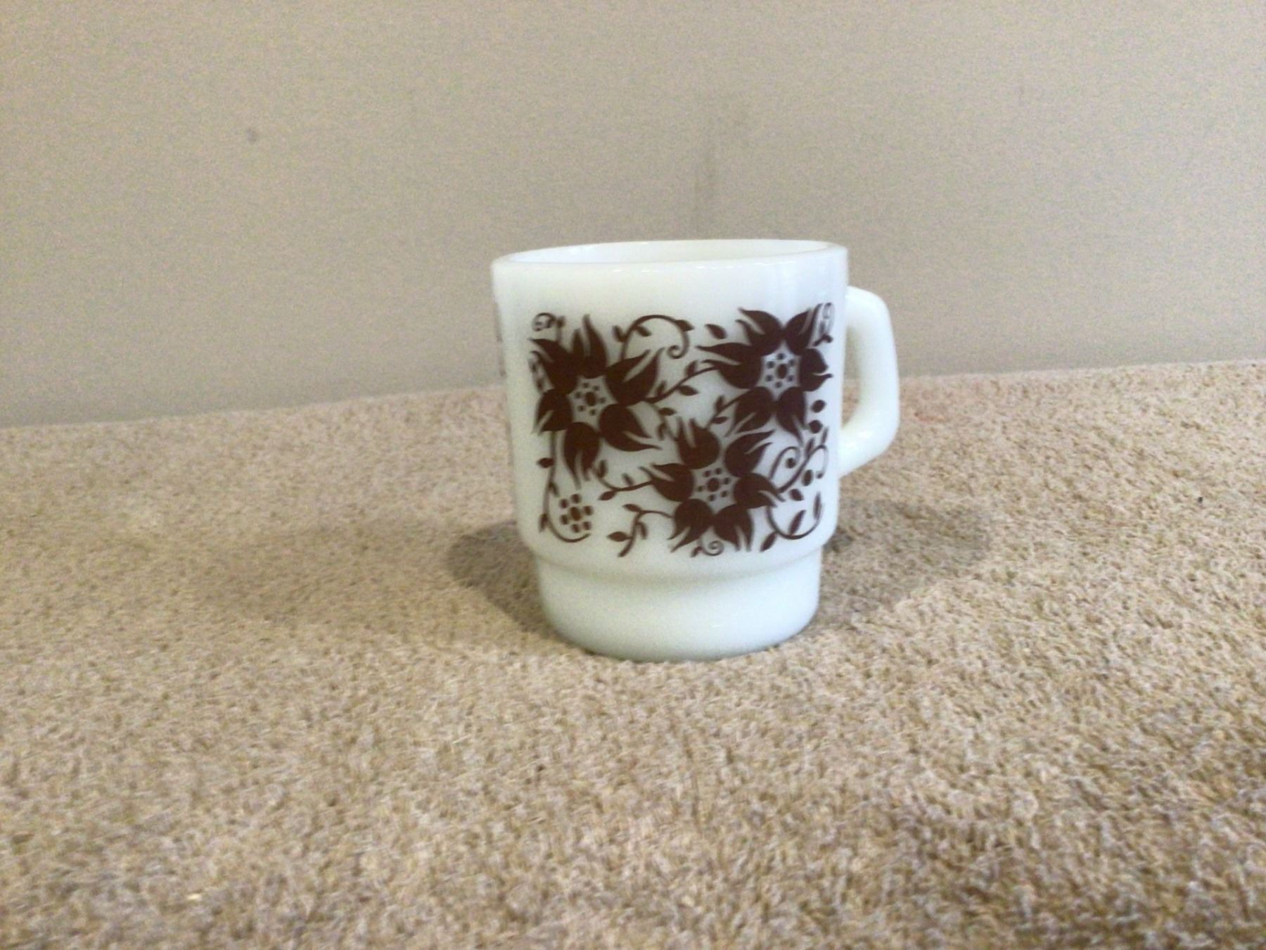 Vintage milk glass anchor hocking mug with brown flowers. Exc. condition.