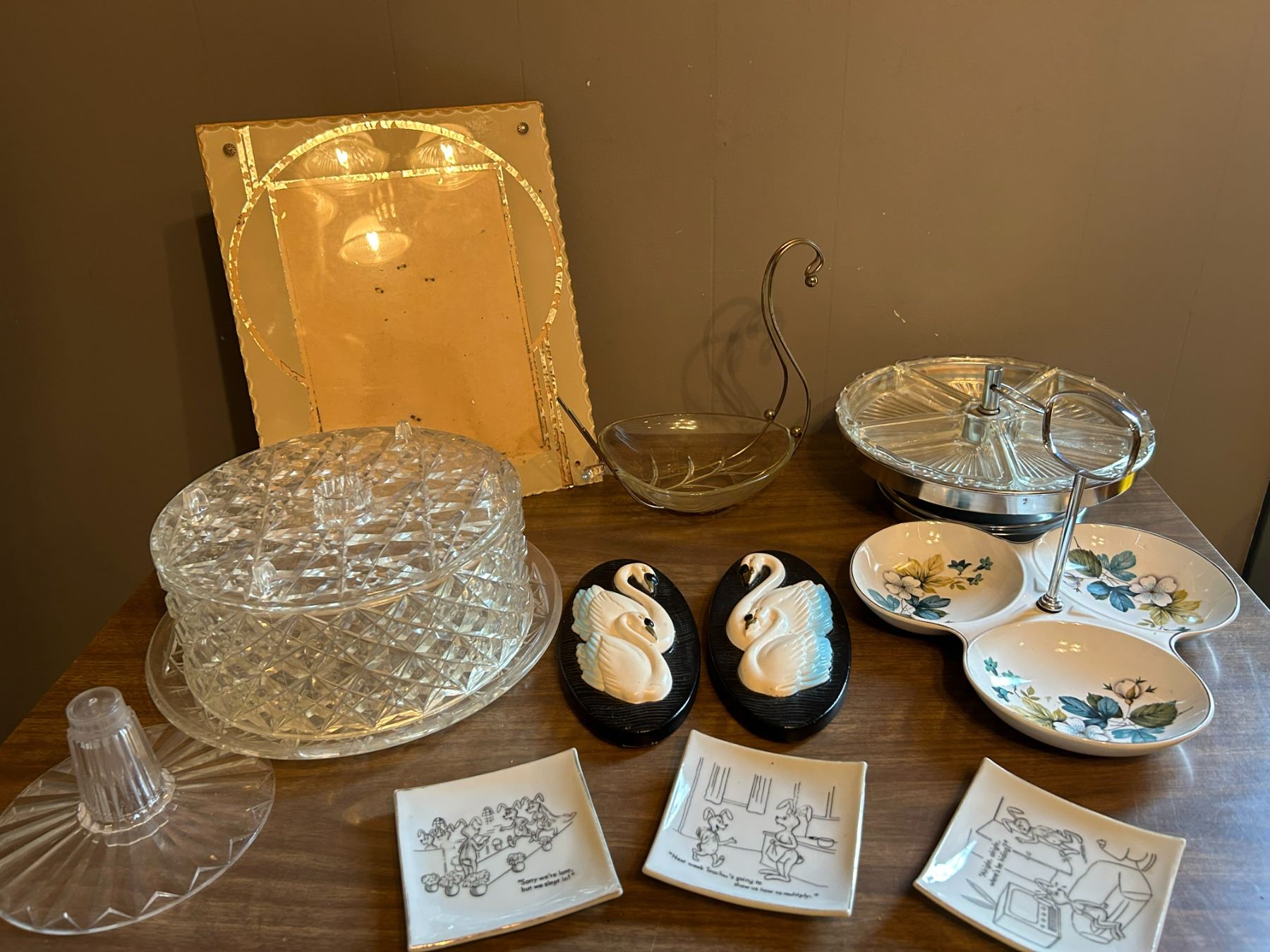 Vintage mini lazy Suzan removable glass, unique glass frame, Sean pics , bunny novelty, cake display