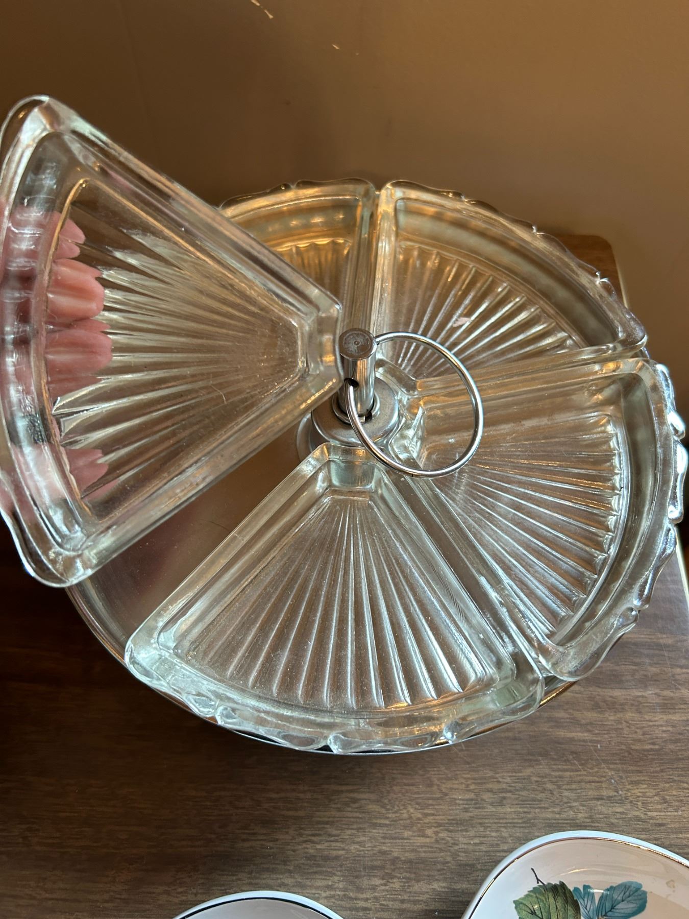 Vintage mini lazy Suzan removable glass, unique glass frame, Sean pics , bunny novelty, cake display dainty tray