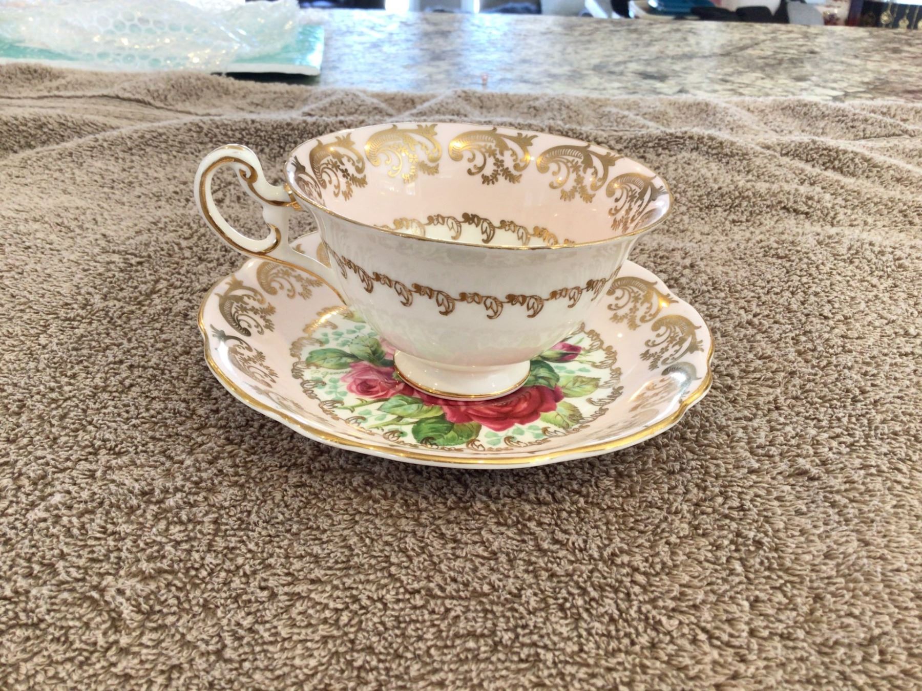 Vintage pale pink EB Foley scalloped teacup and saucer, pink, red roses and gold trim. England