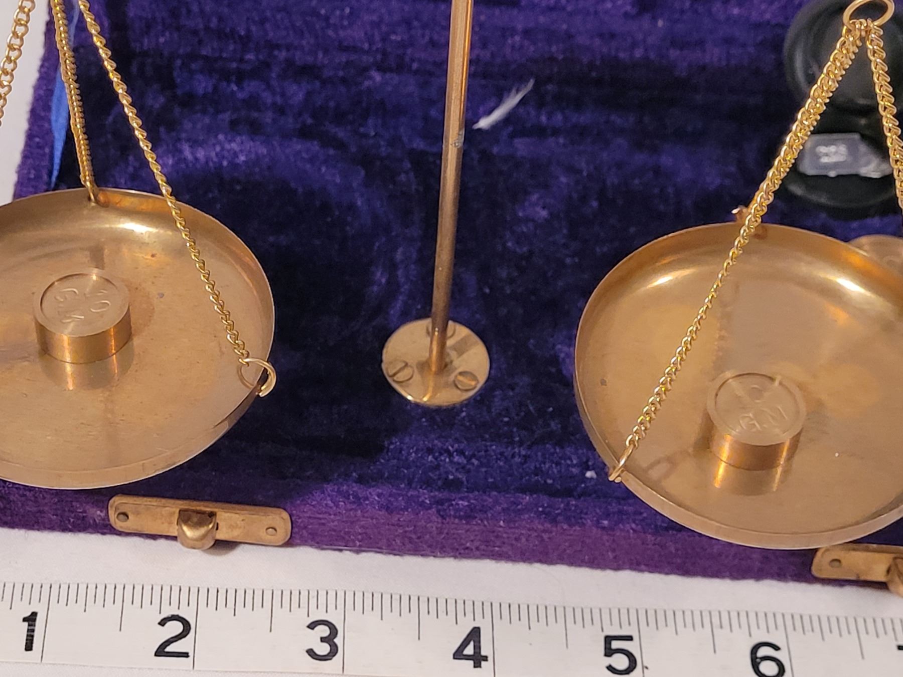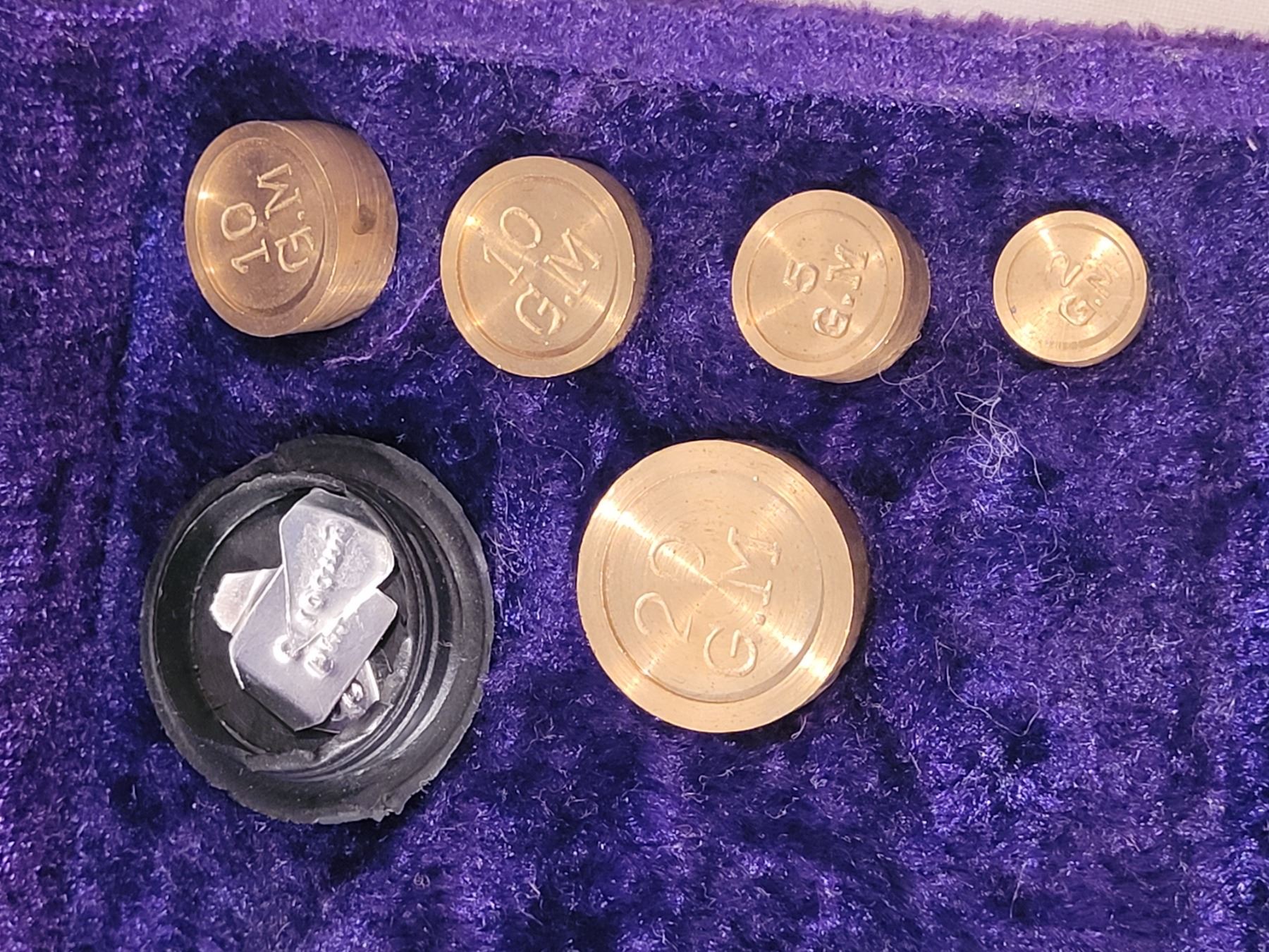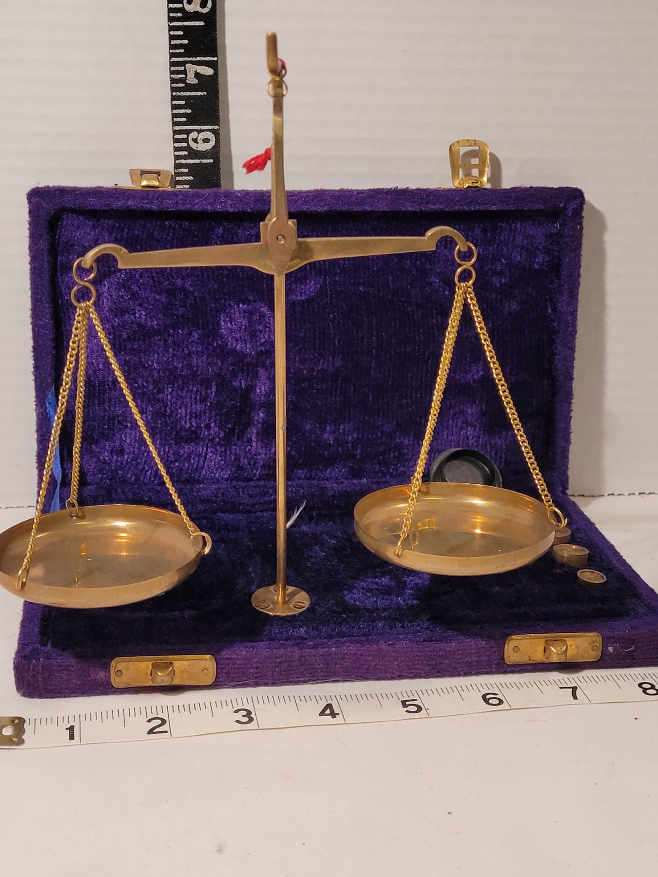 Vintage portable brass weigh scale in purple velvet case. India