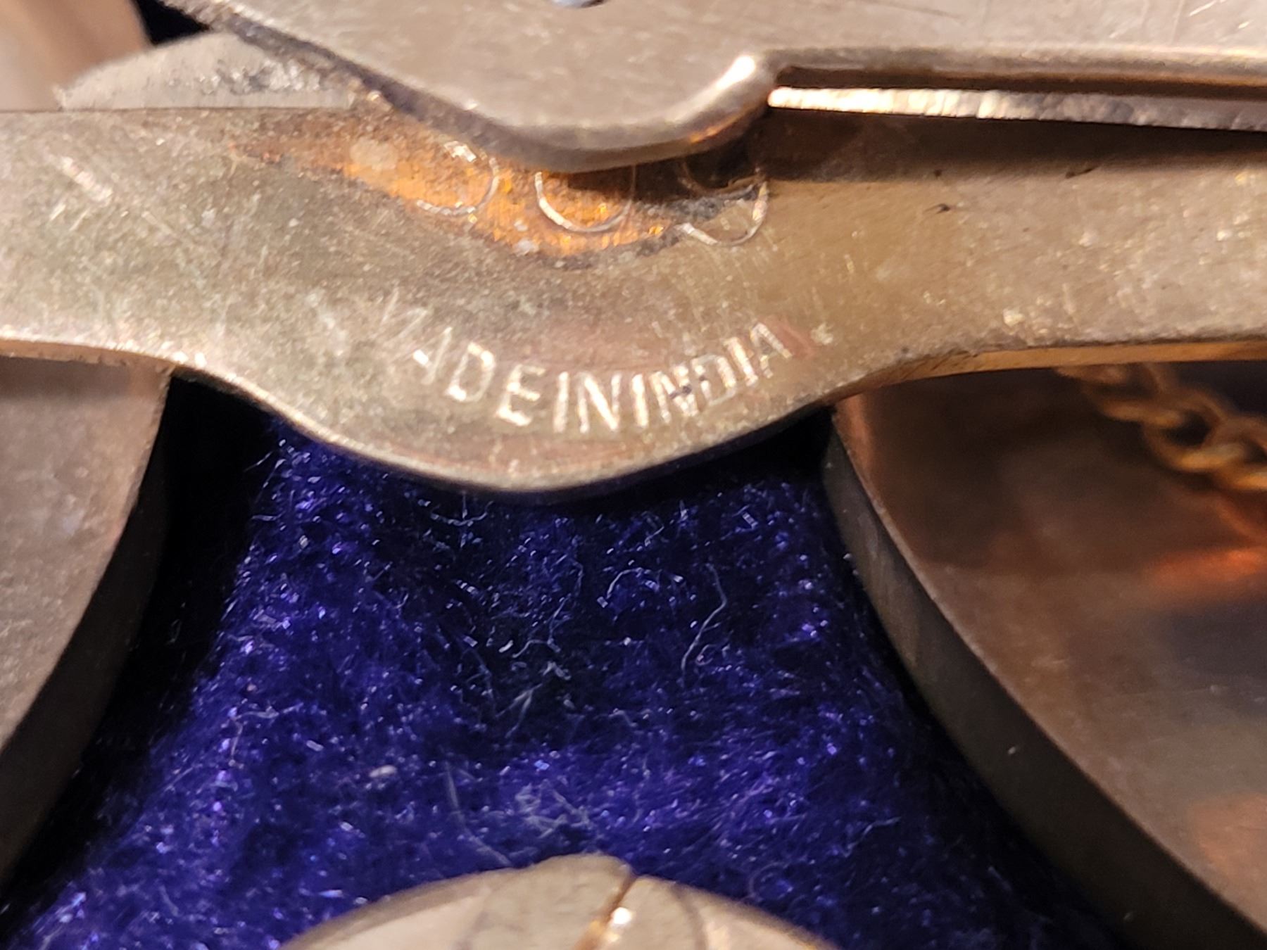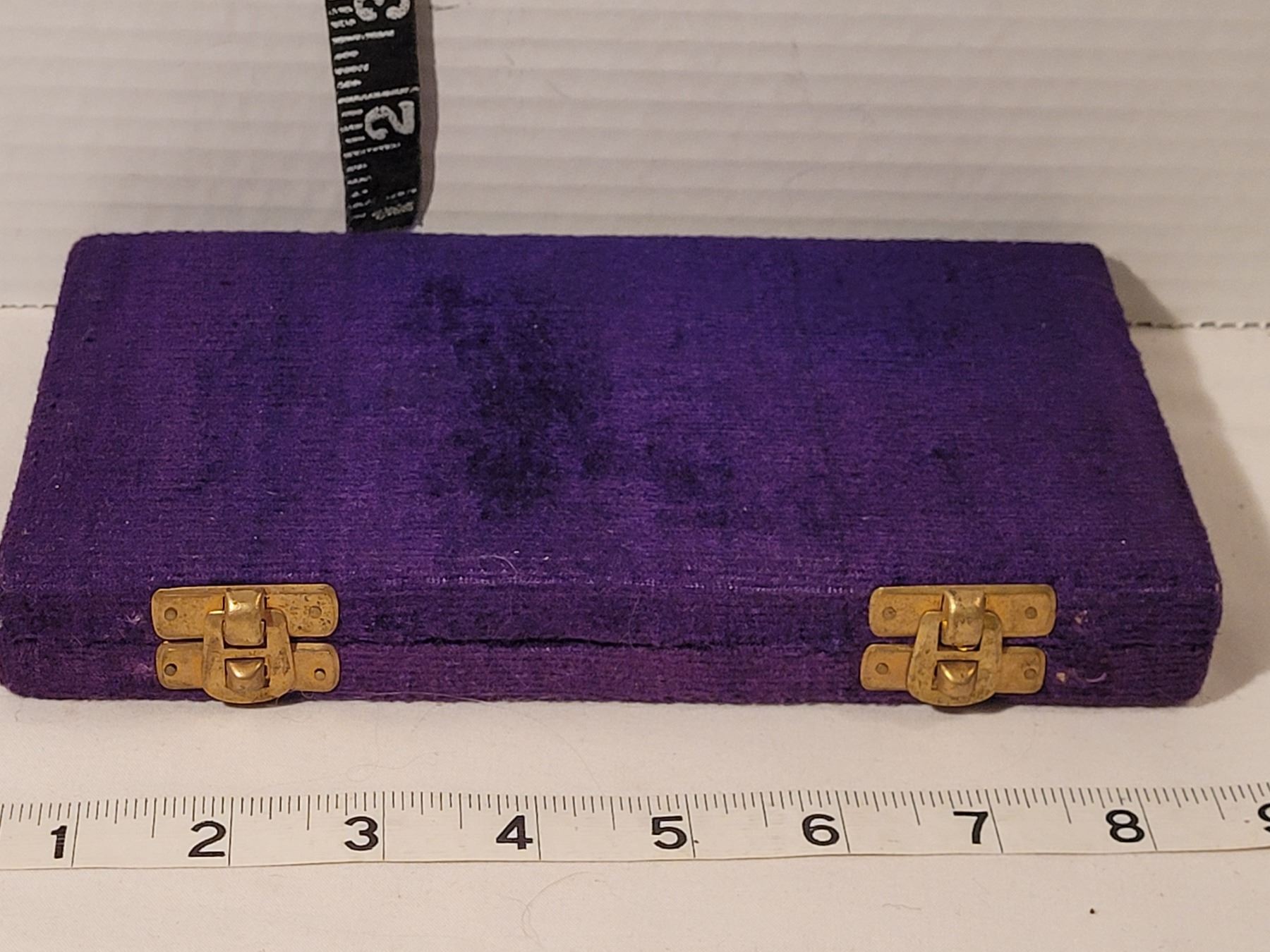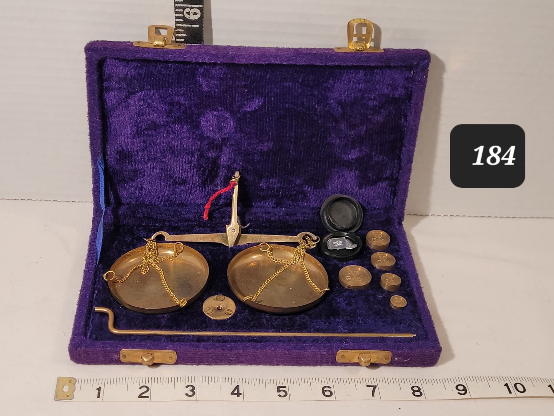Vintage portable brass weigh scale in purple velvet case. India