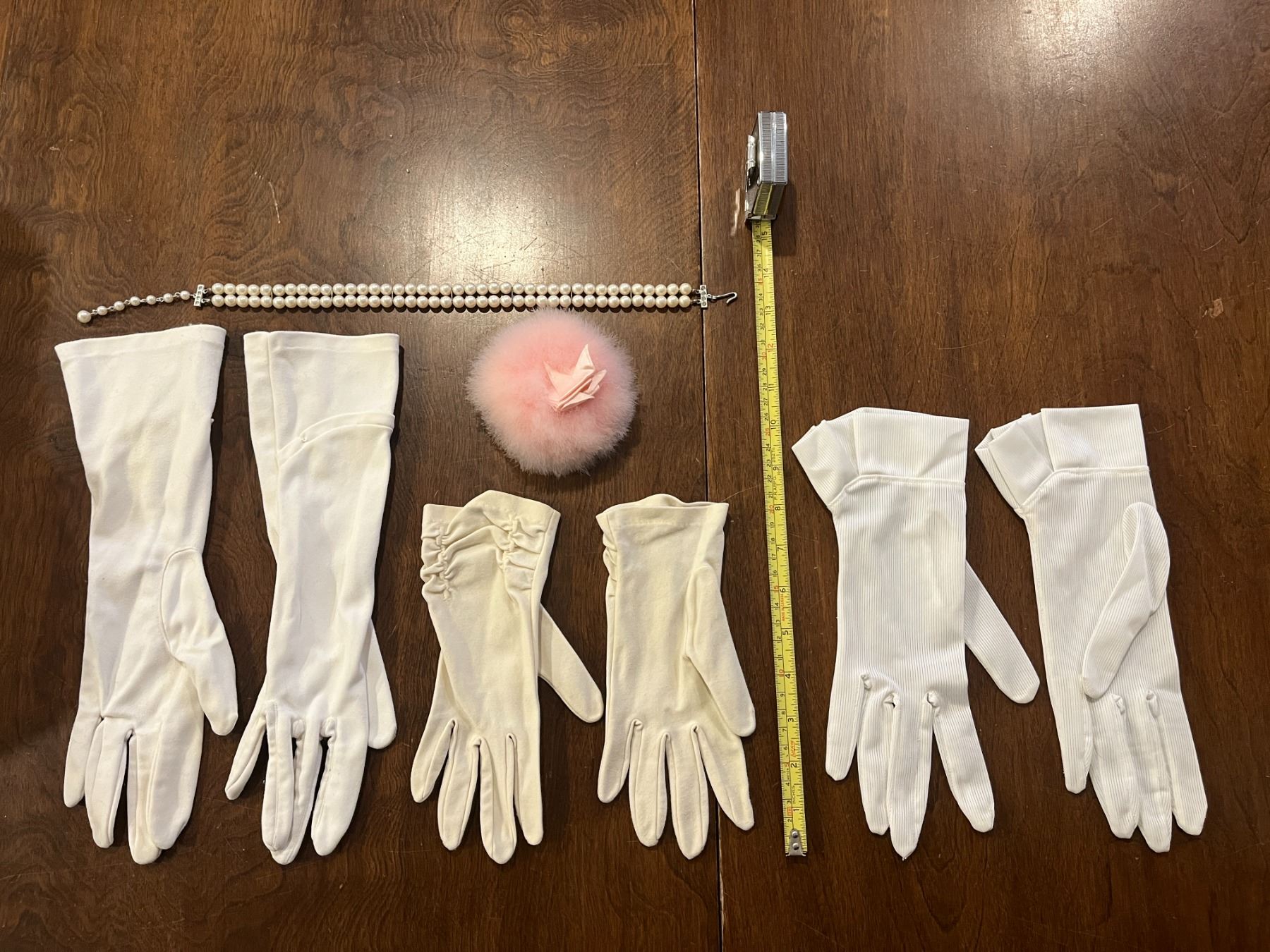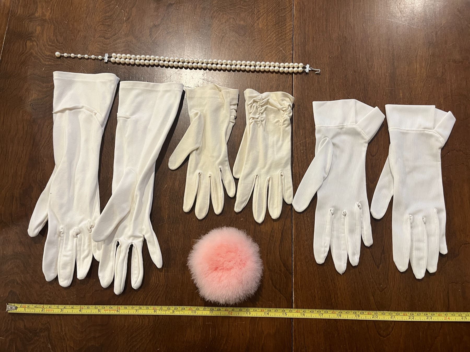 Vintage powder puff, gloves and necklace