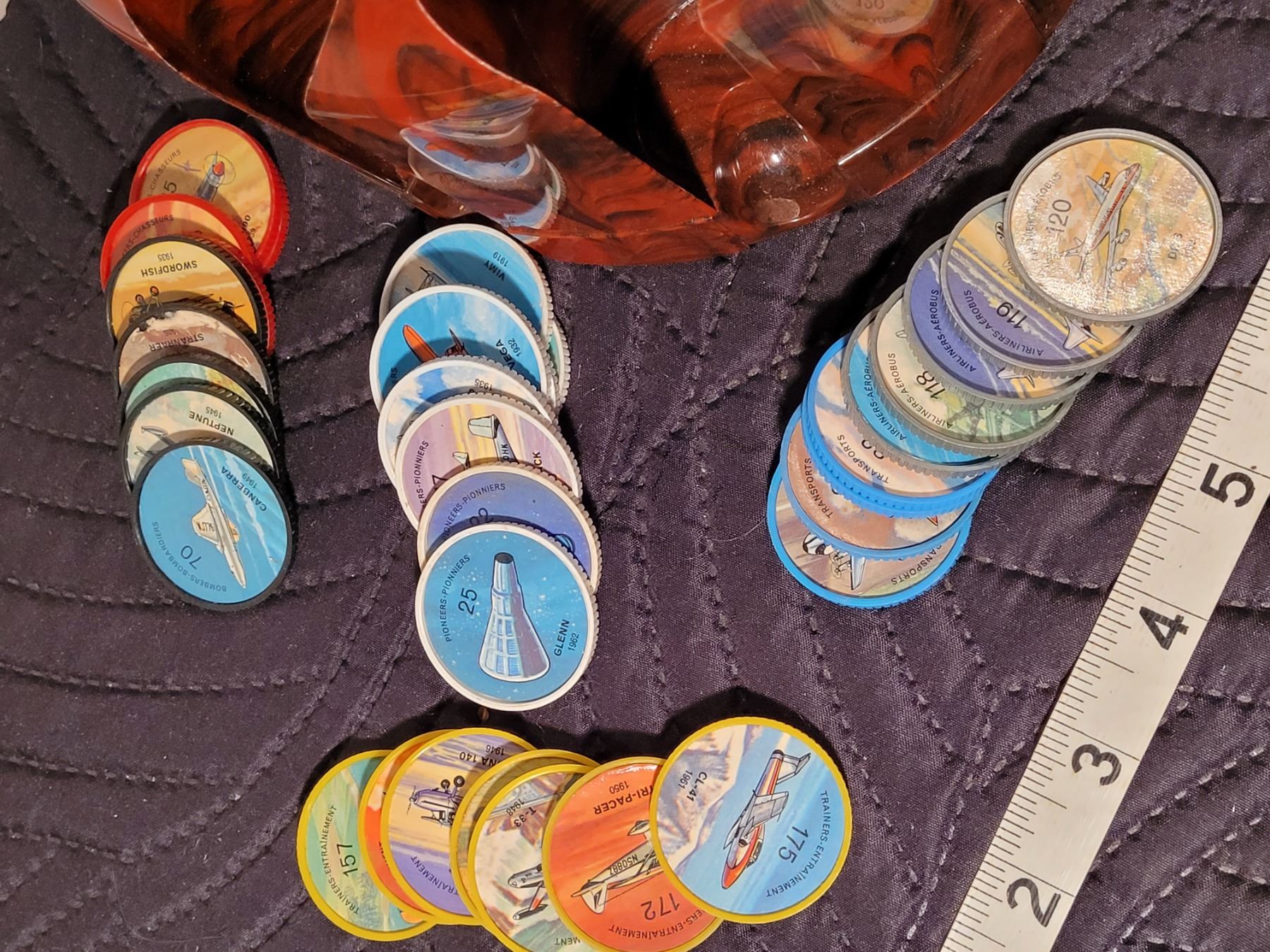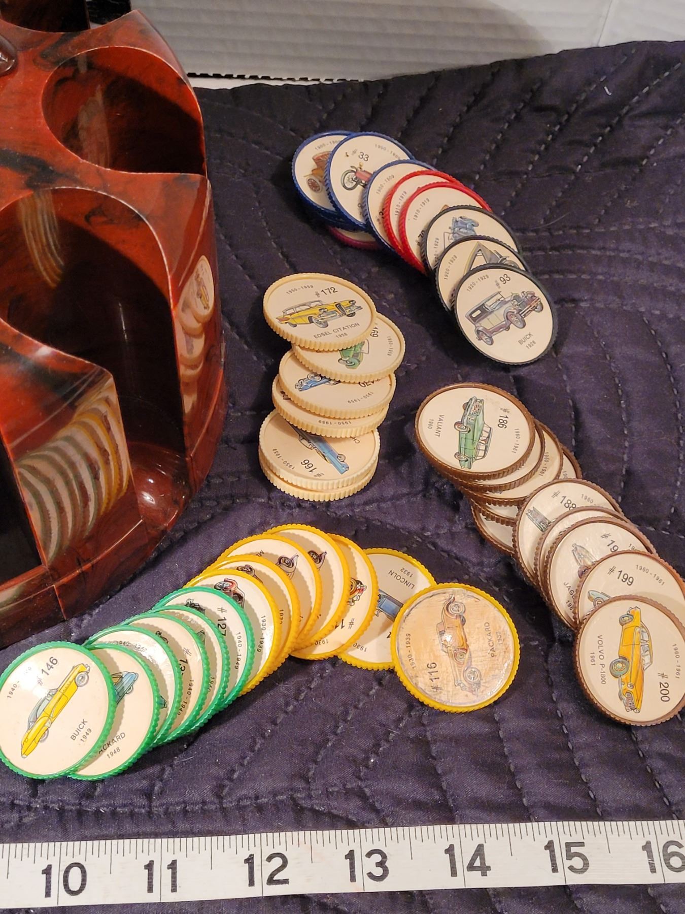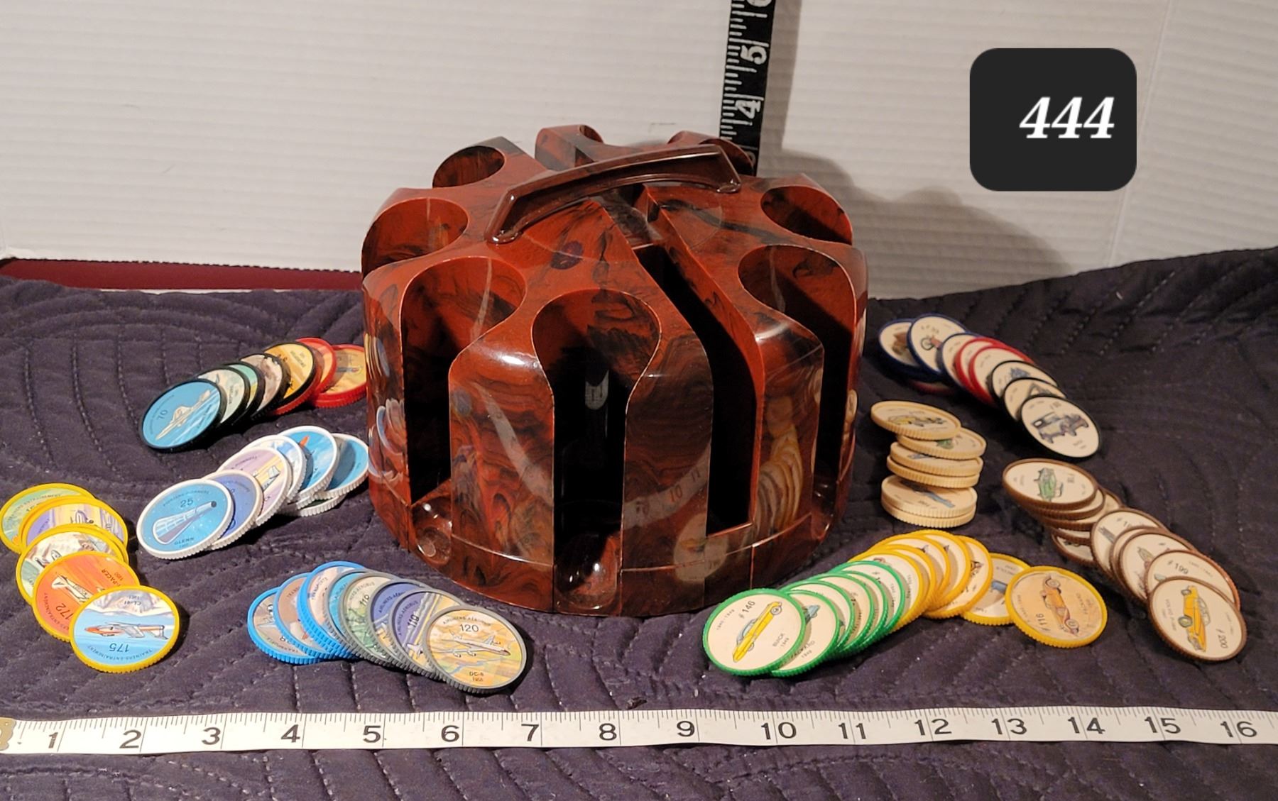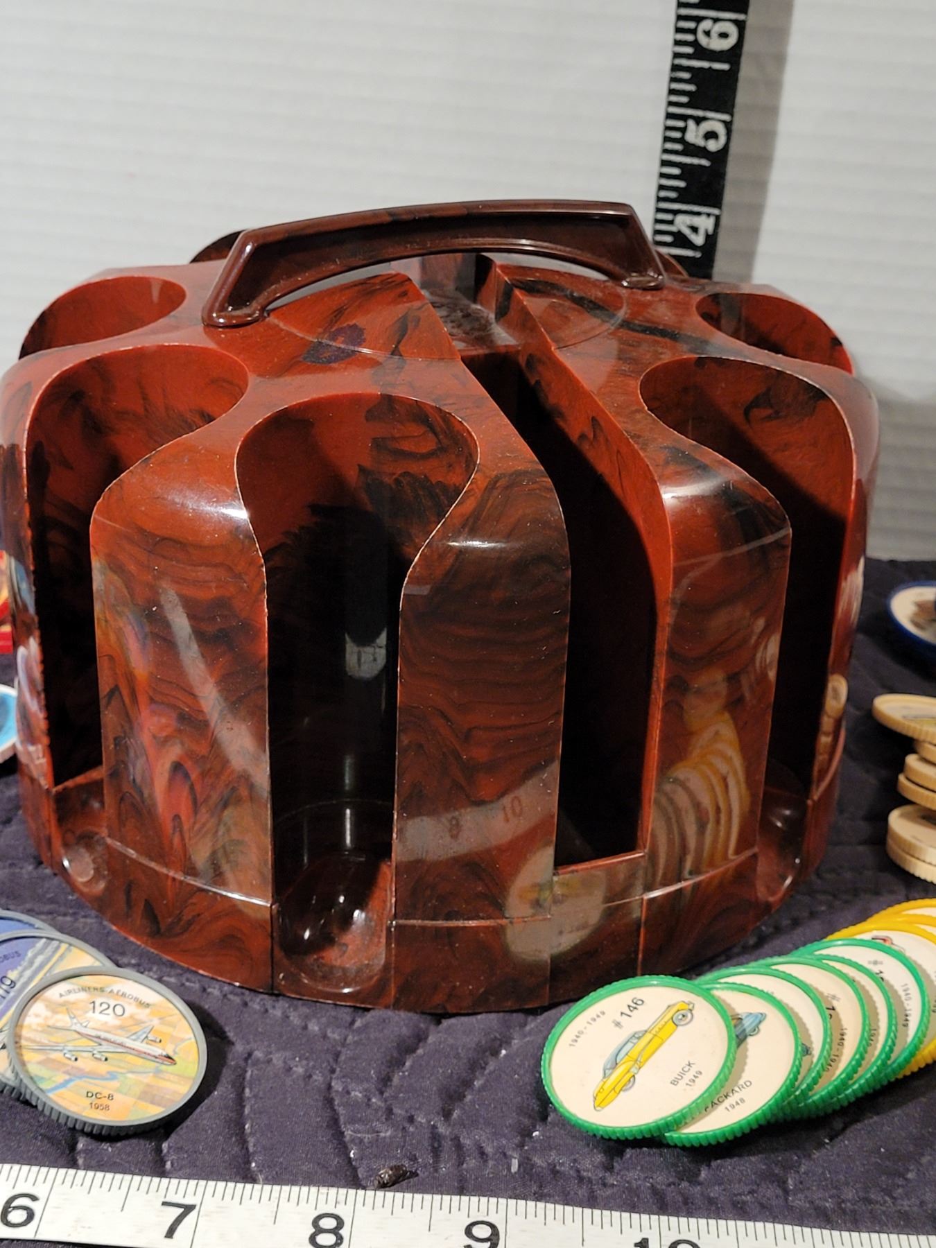 Vintage revolving Bakelite chips & card holder with car & airplane wheels.