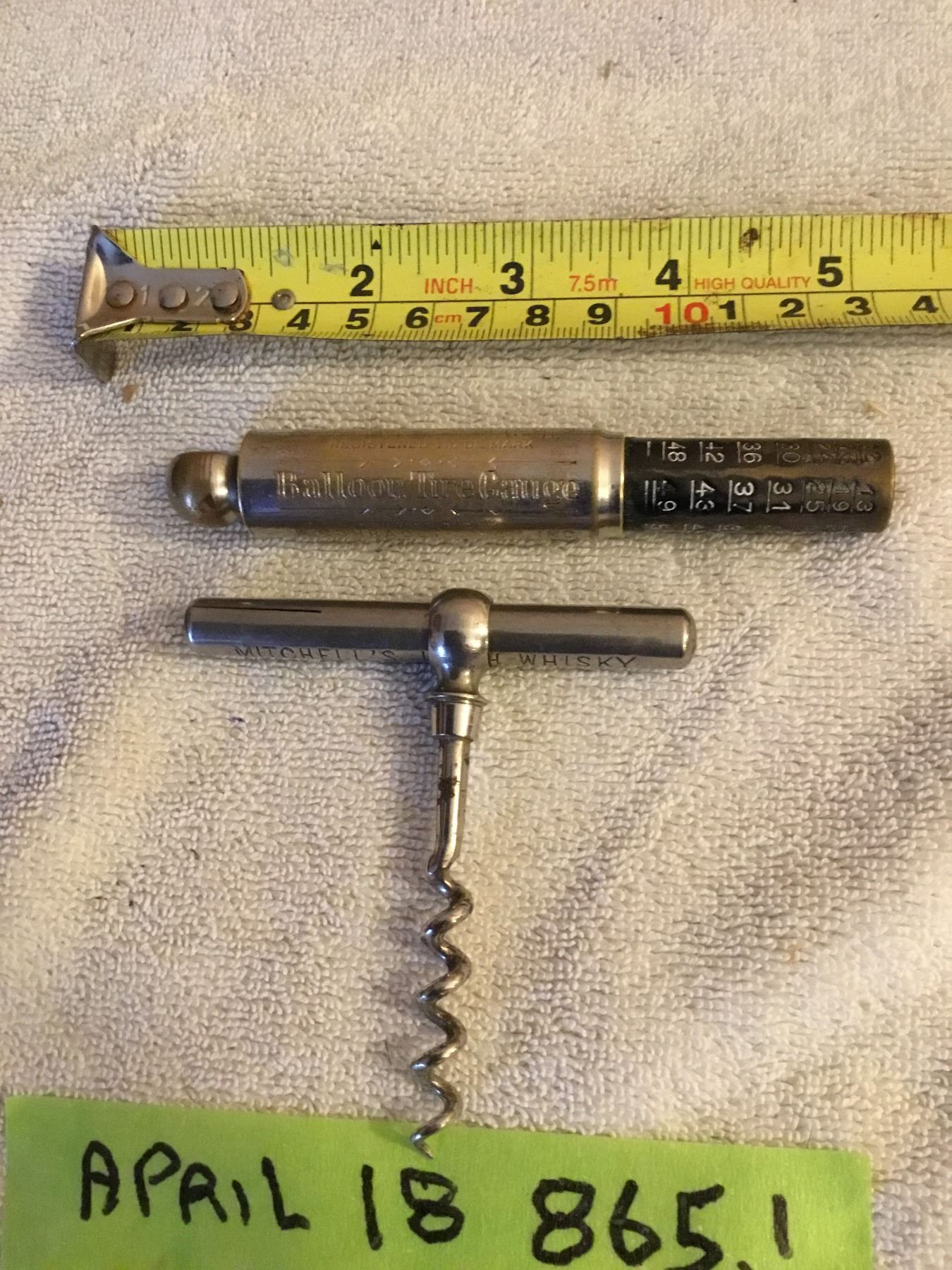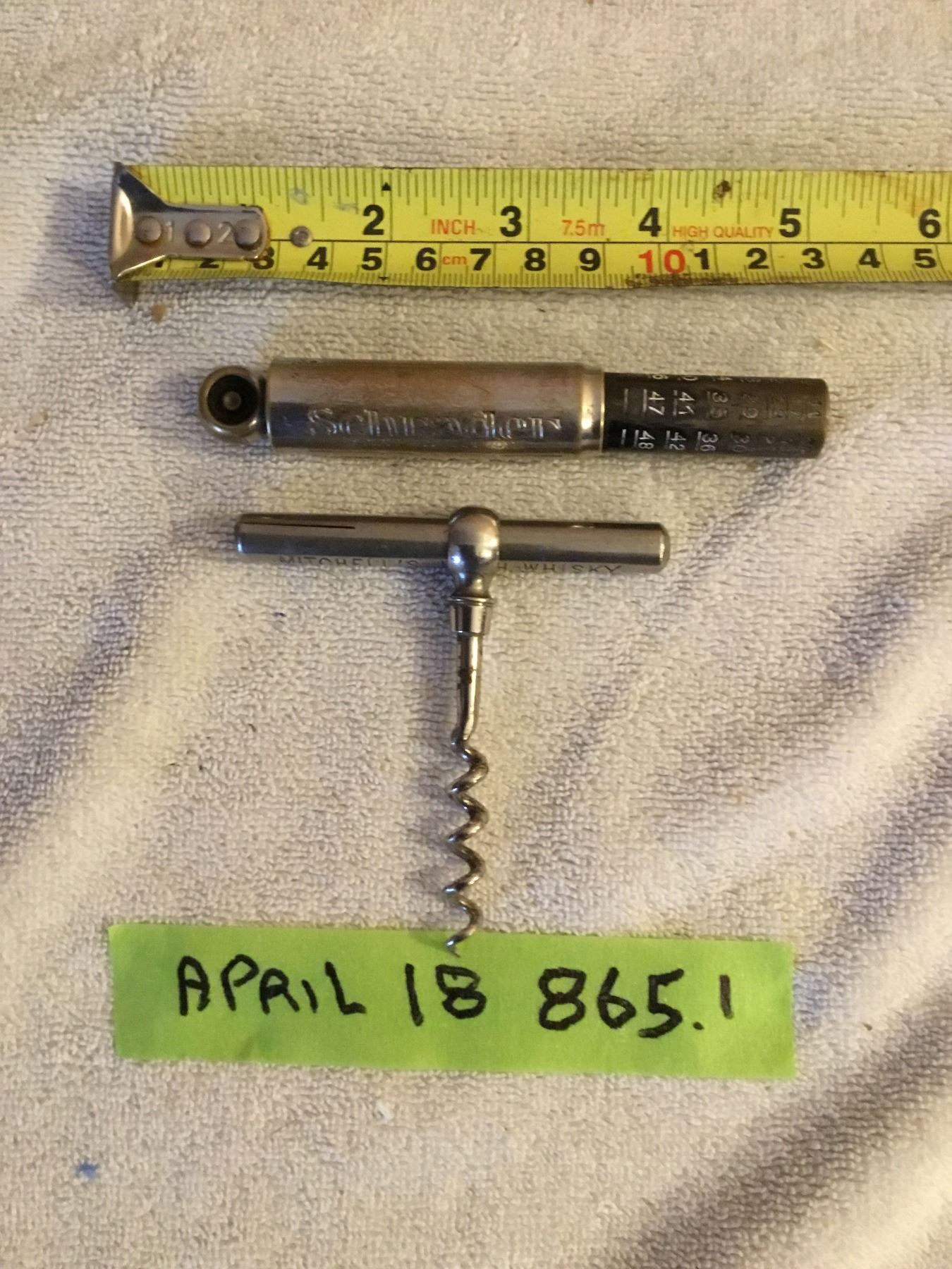 Vintage schrader ballon tire gauge pat date, 1914, 1928- Michells irish cork screw