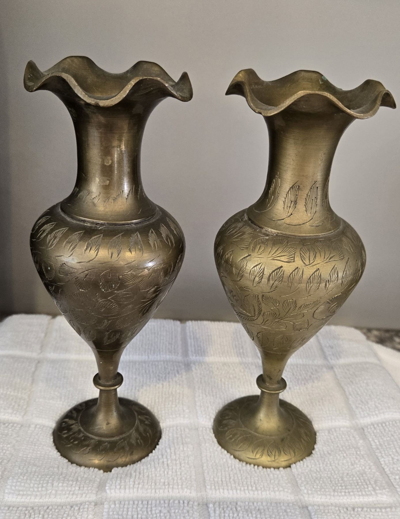 Vintage set of 2 brass engraved vases. 7" tall. Marked India on bottom.