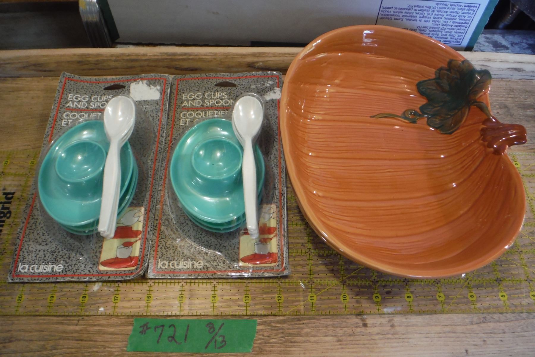 Vintage teal egg cups w/ spoon's NOS & pumpkin bowl.