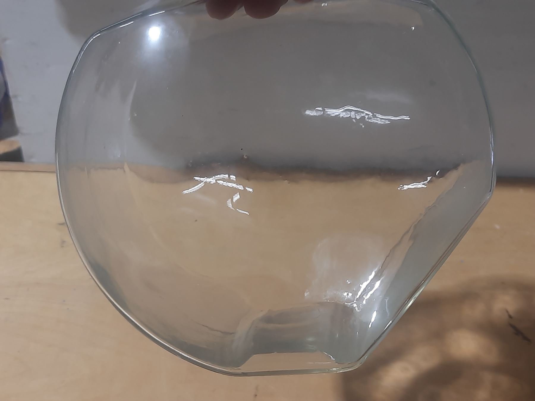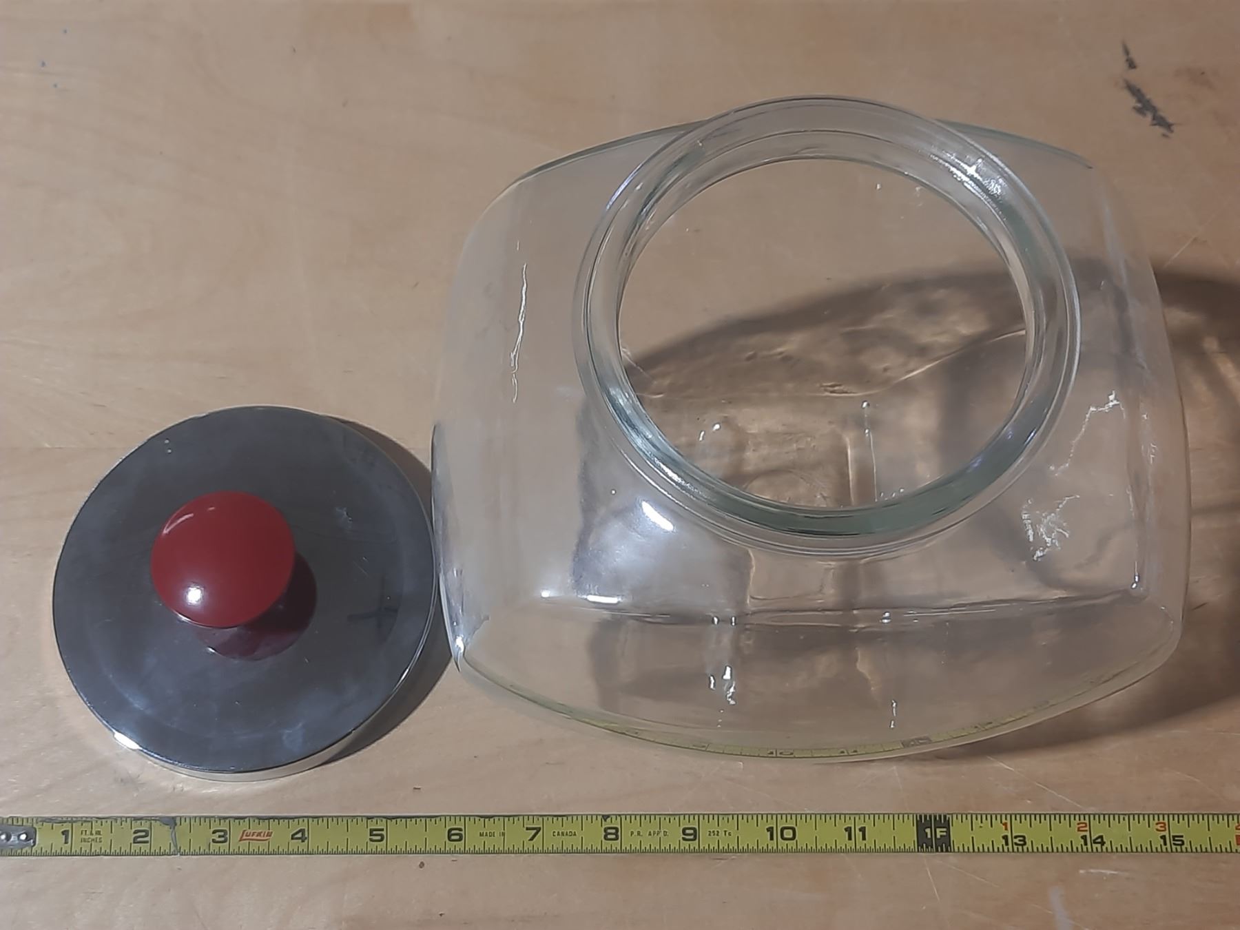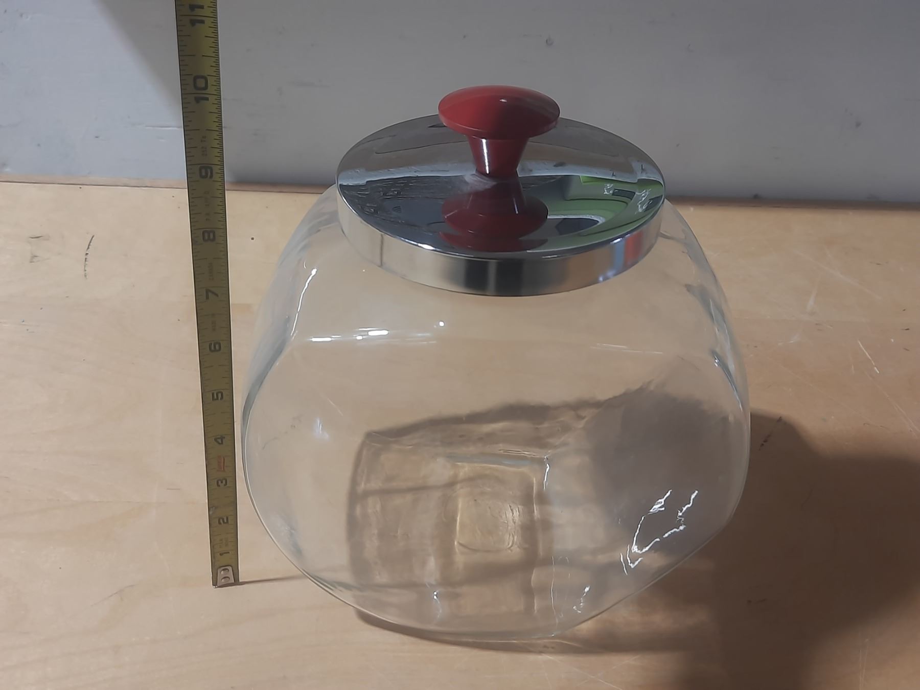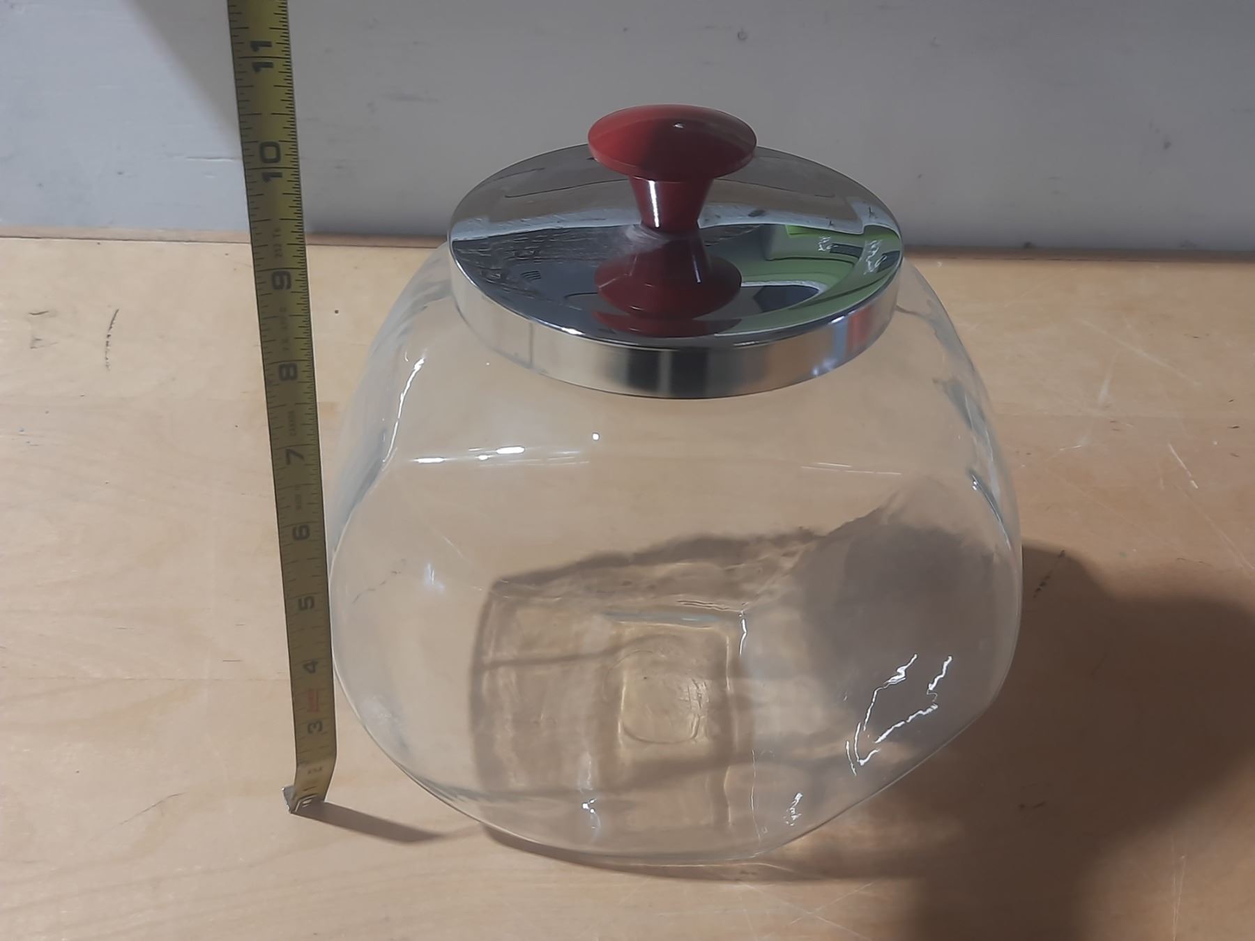 Vintage tilted glass penny candy jar with a chrome lid and a red knob.